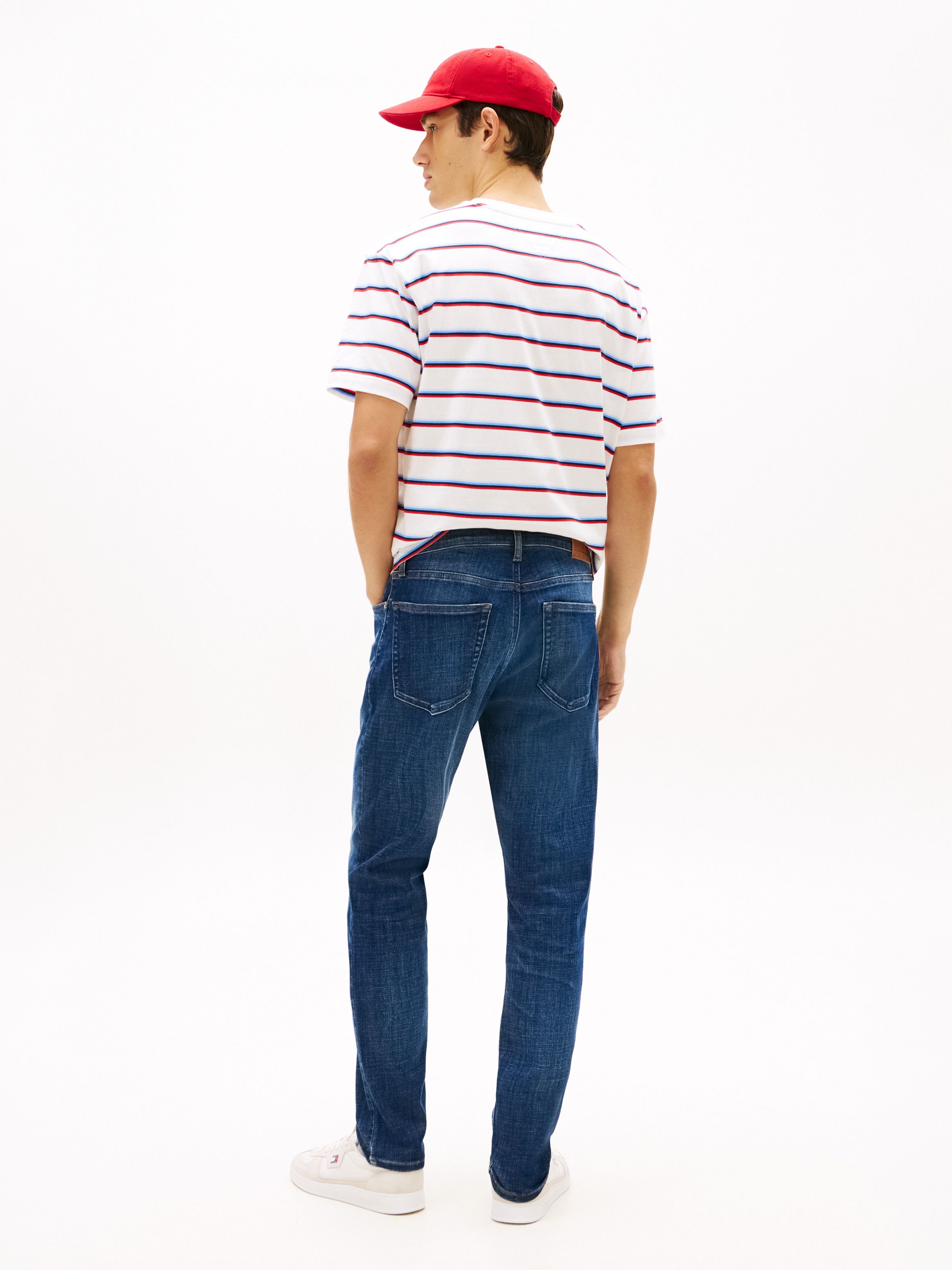• Stretch cotton denim • Whiskering and fading on front • Zip with button closure • Five-pocket styling • Branded metal button and rivets • Tommy Jeans branding • Tommy flag embroidery on coin pocket
