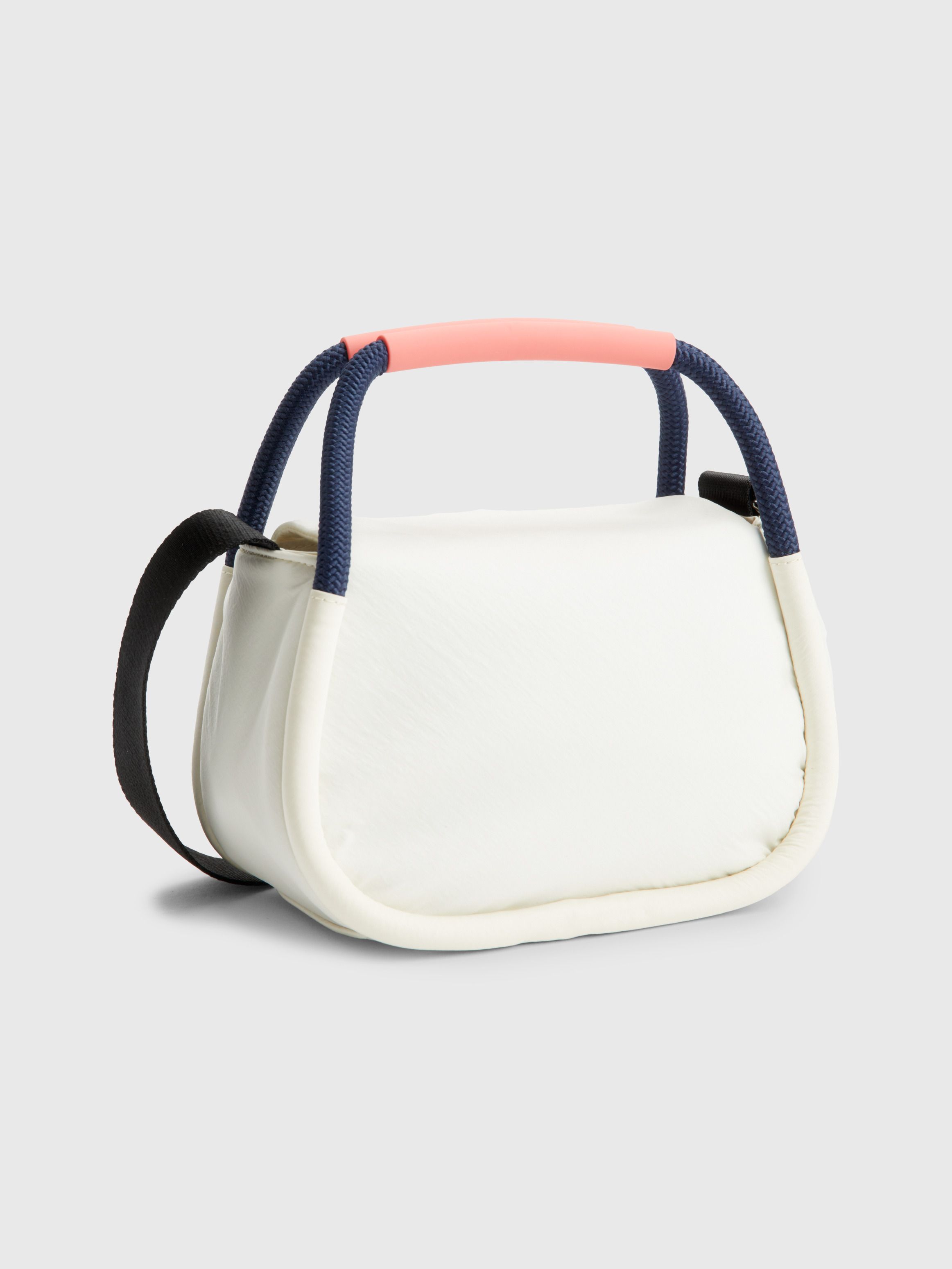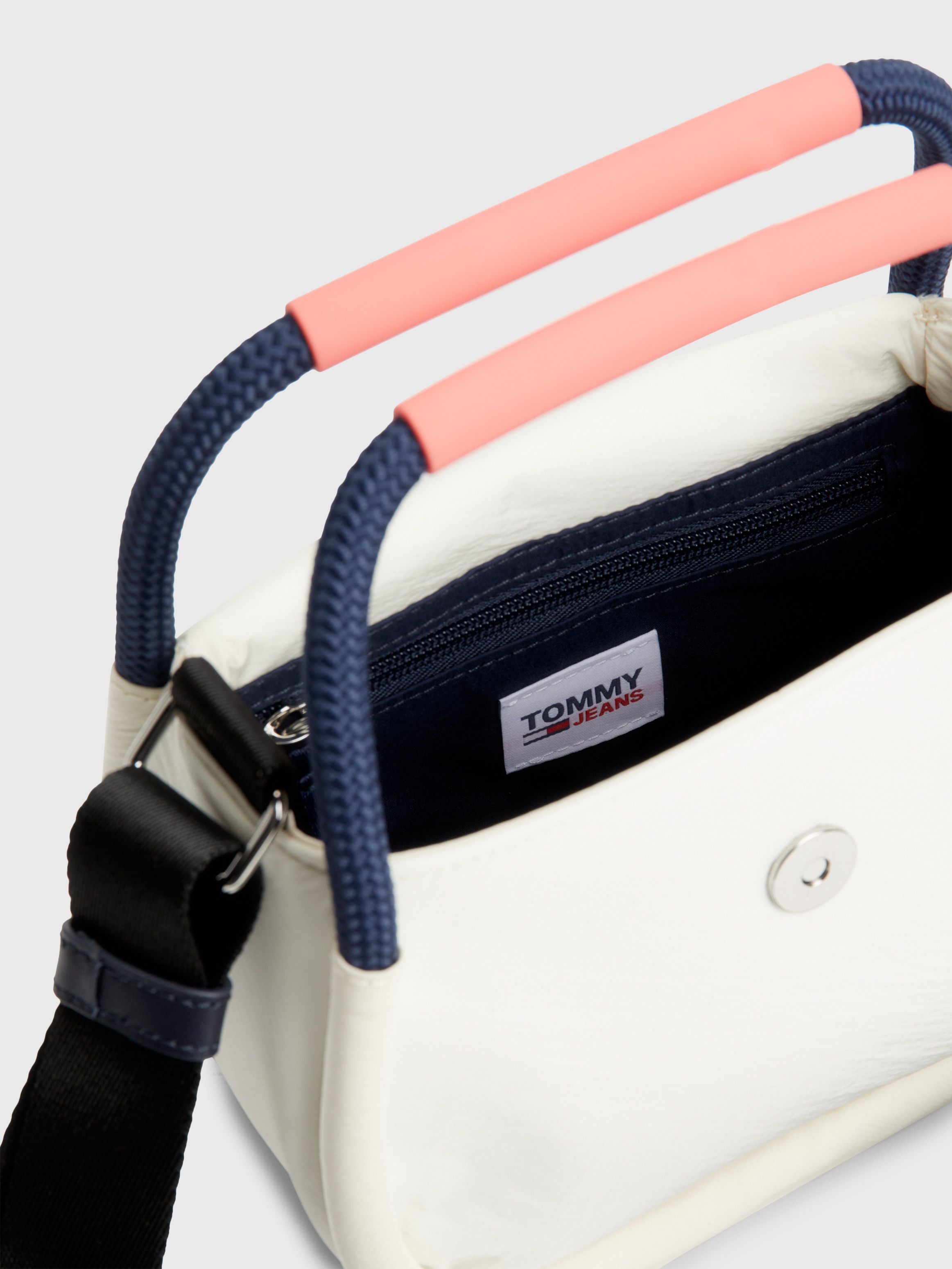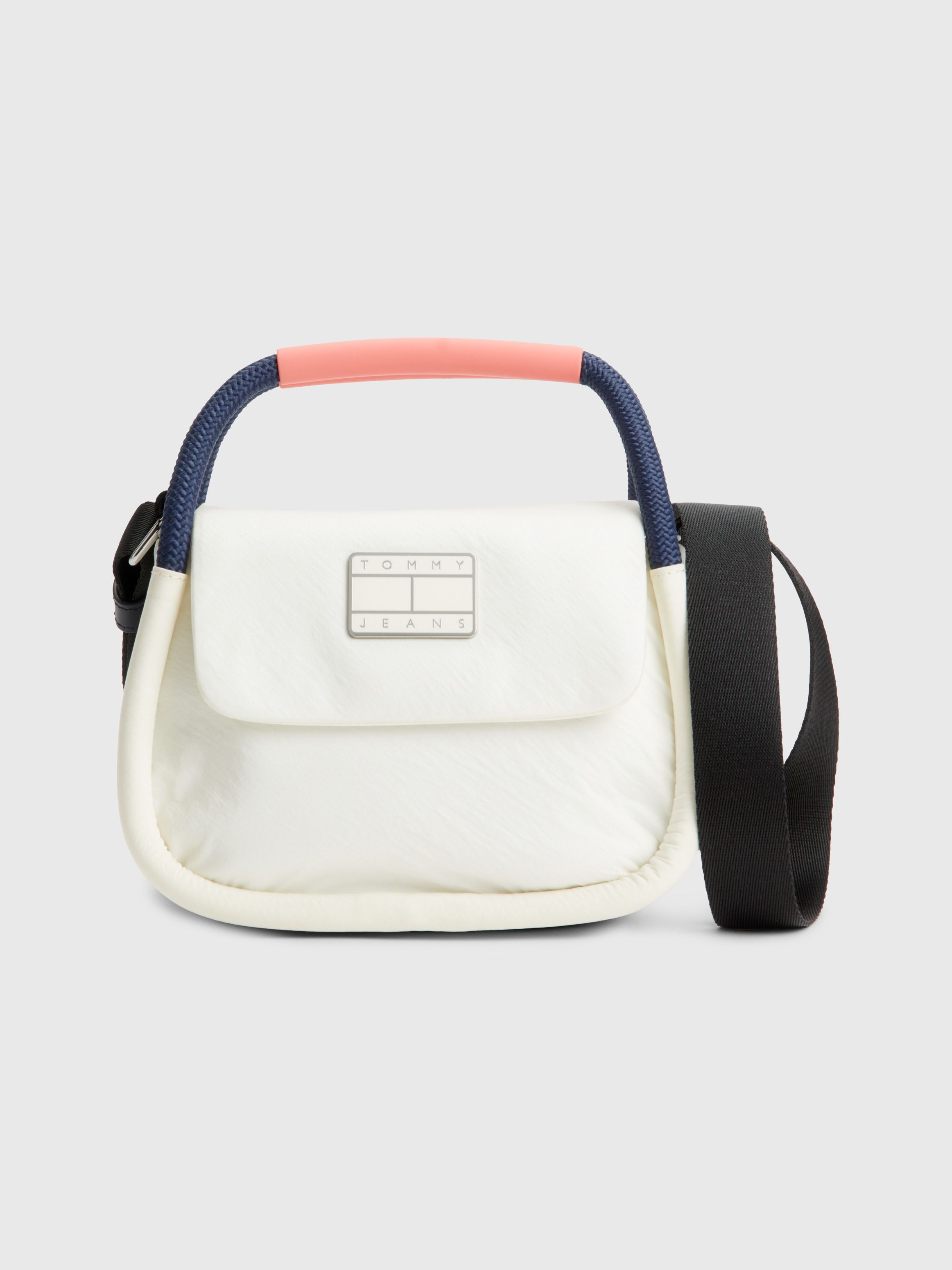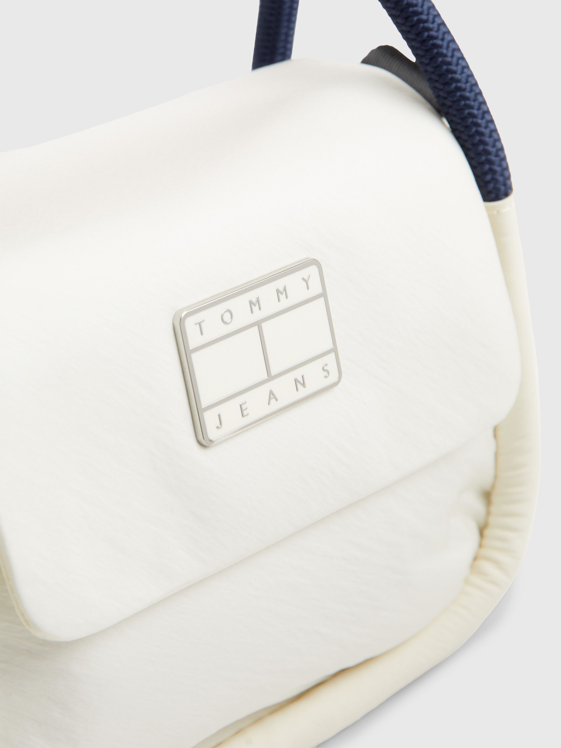 • Recycled nylon • Smooth finish • Magnetic flap closure • Adjustable crossover strap • Two braided top handles • One main compartment • One interior zipped pocket • Tonal Tommy badge metal plaque on front • Tommy Jeans branding