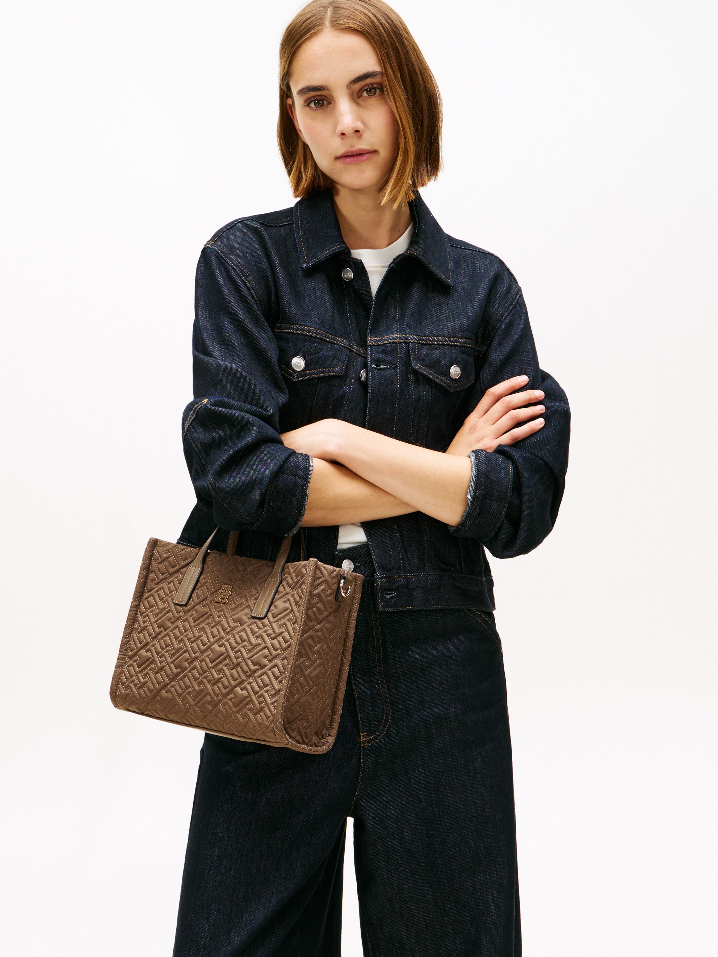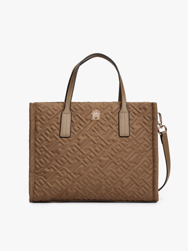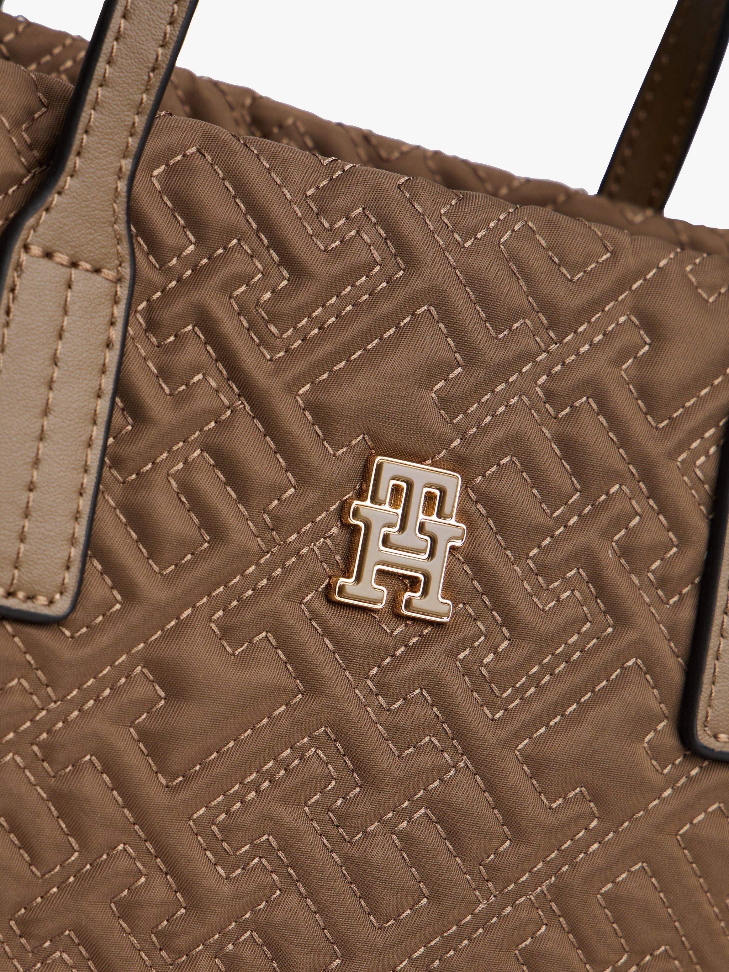 • Modern Tommy Hilfiger city mini tote mo silhouette • Brown tone for versatile styling • Crafted from RECYCLED NYLON (78%), COW SPLIT LEATHER (22%) • Signature Tommy Hilfiger detailing