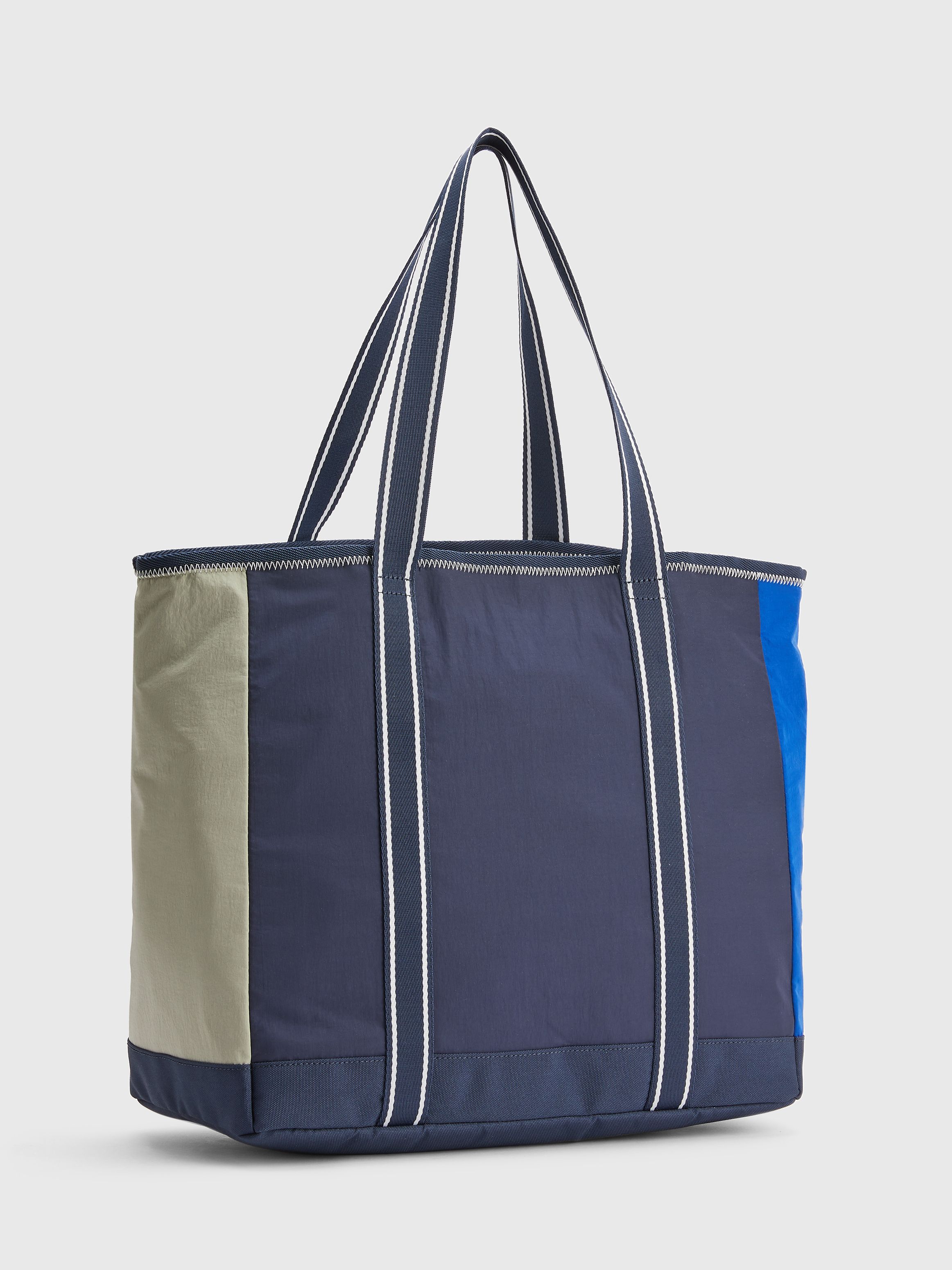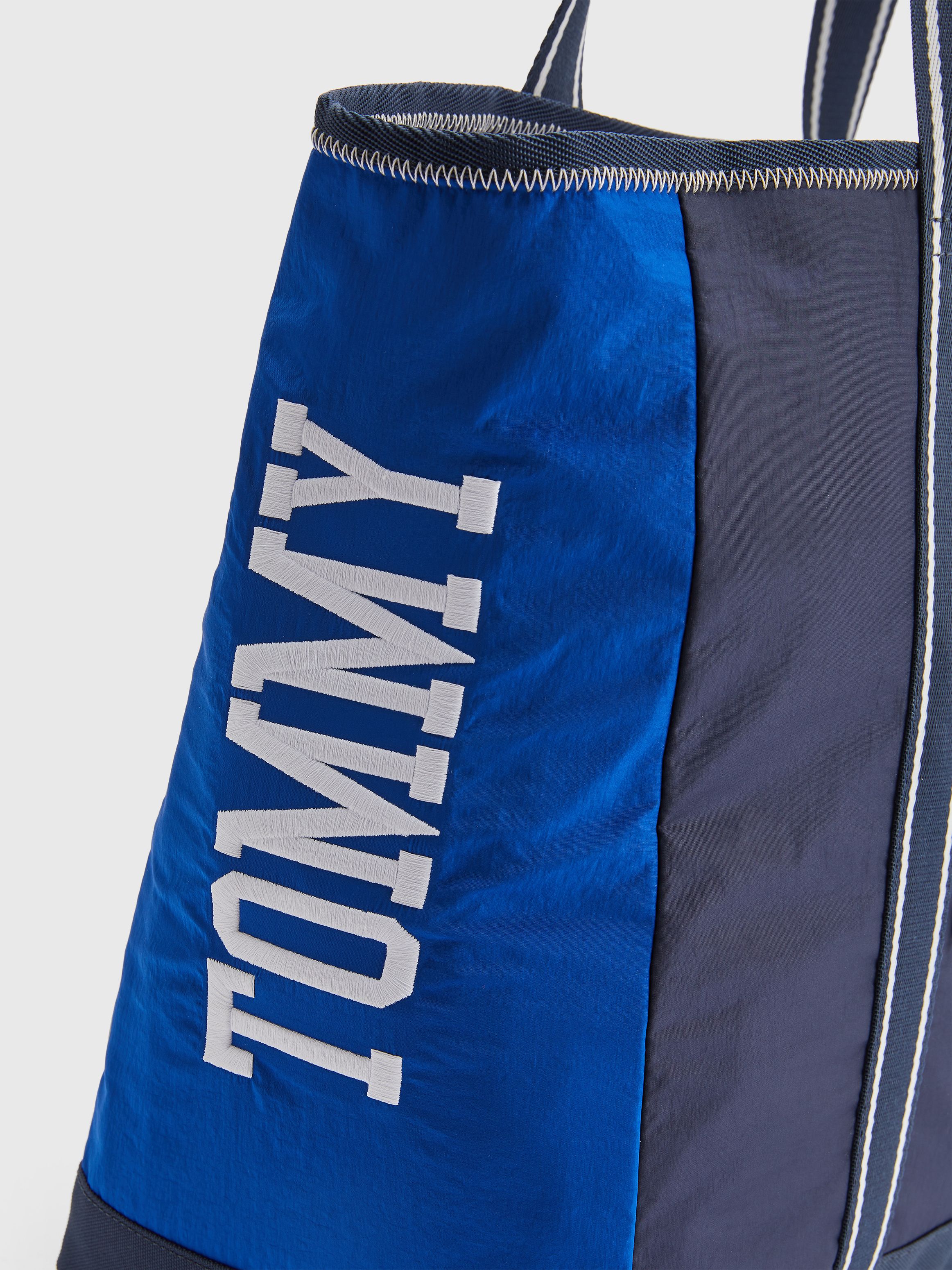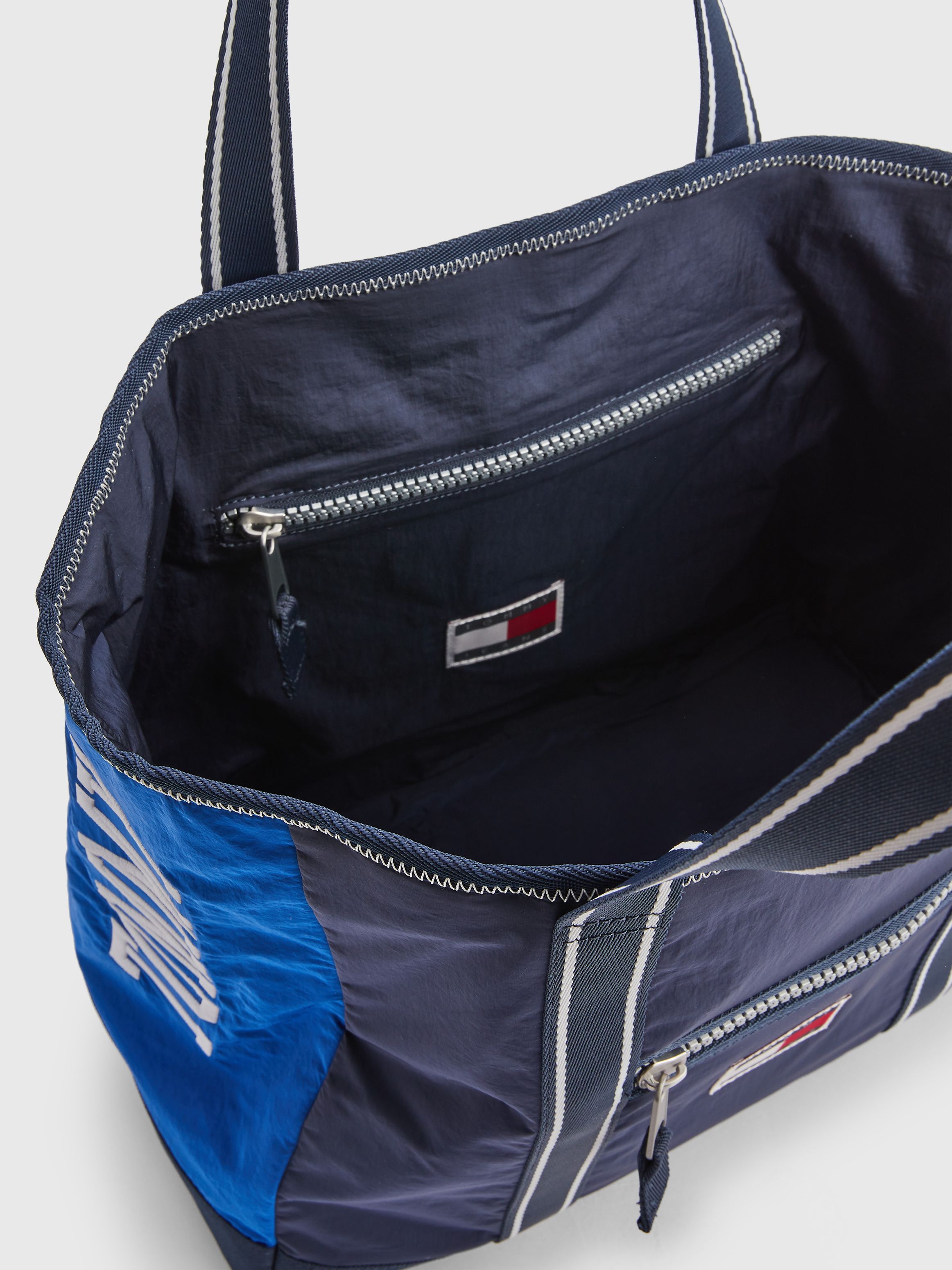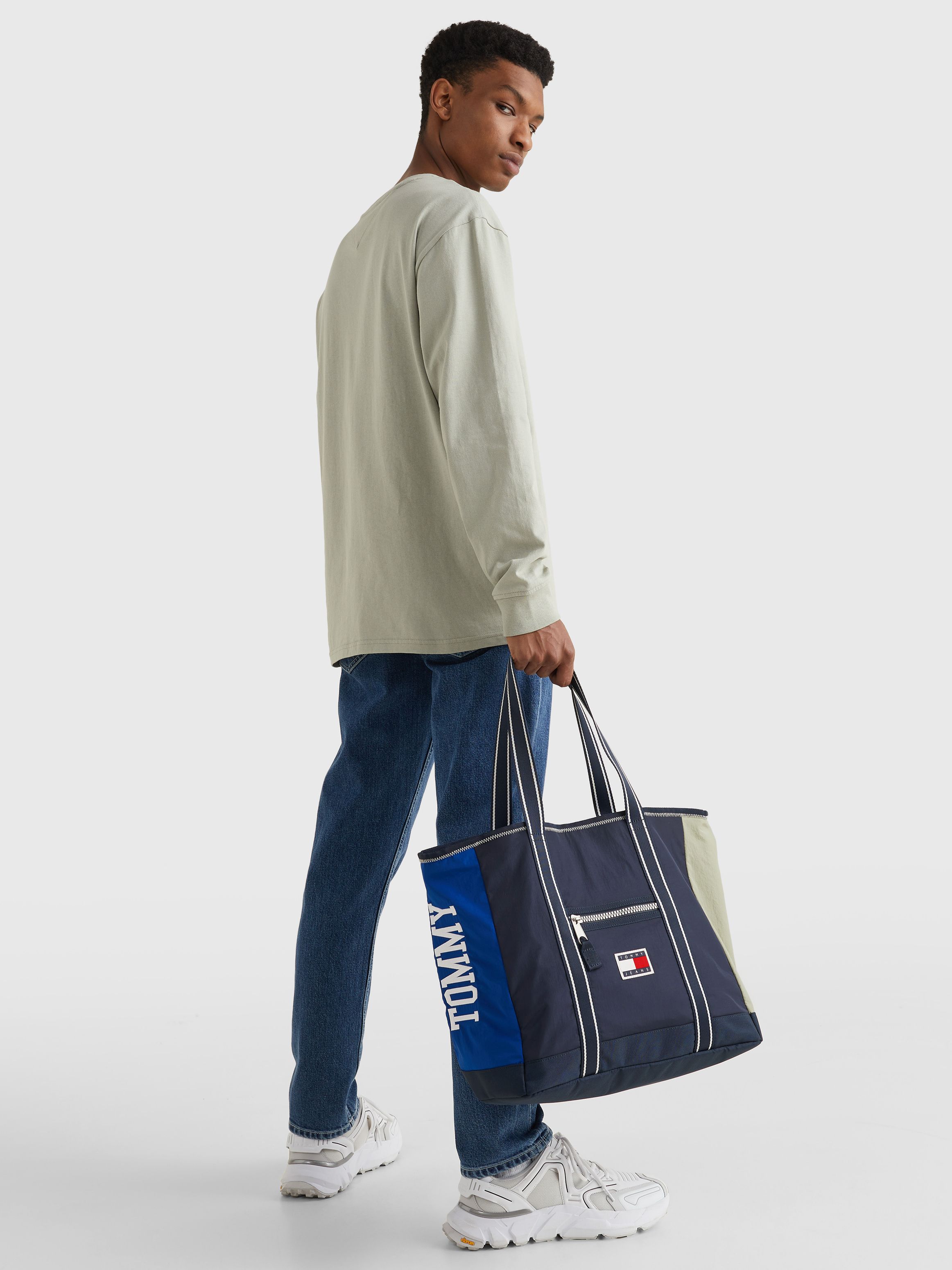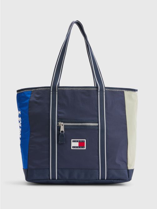 • Recycled nylon blend • Colour-blocked design • Two top handles • One main compartment • One interior zipped pocket • One front zipped pocket • Tommy badge on front and inside • Tommy Jeans branding