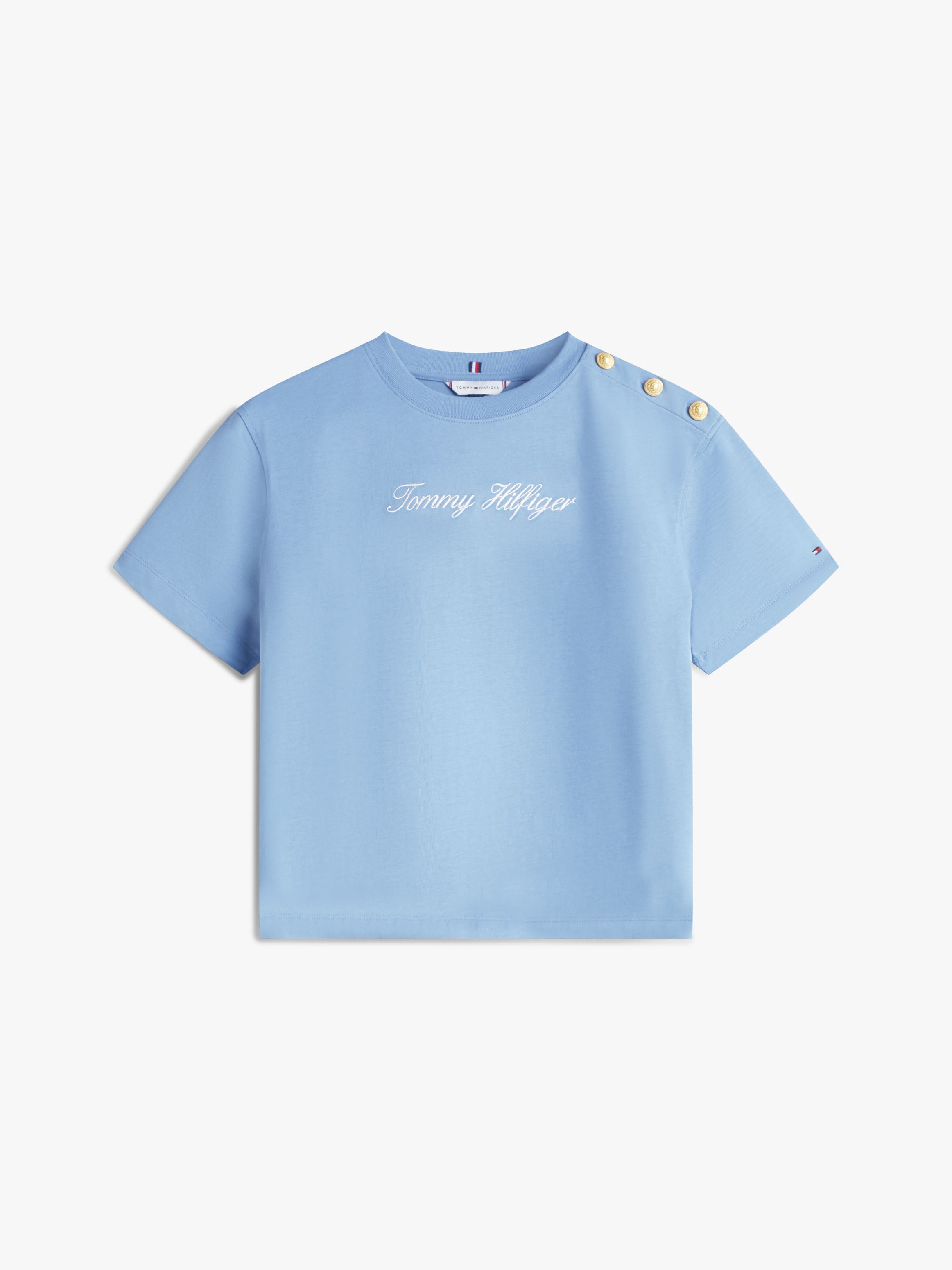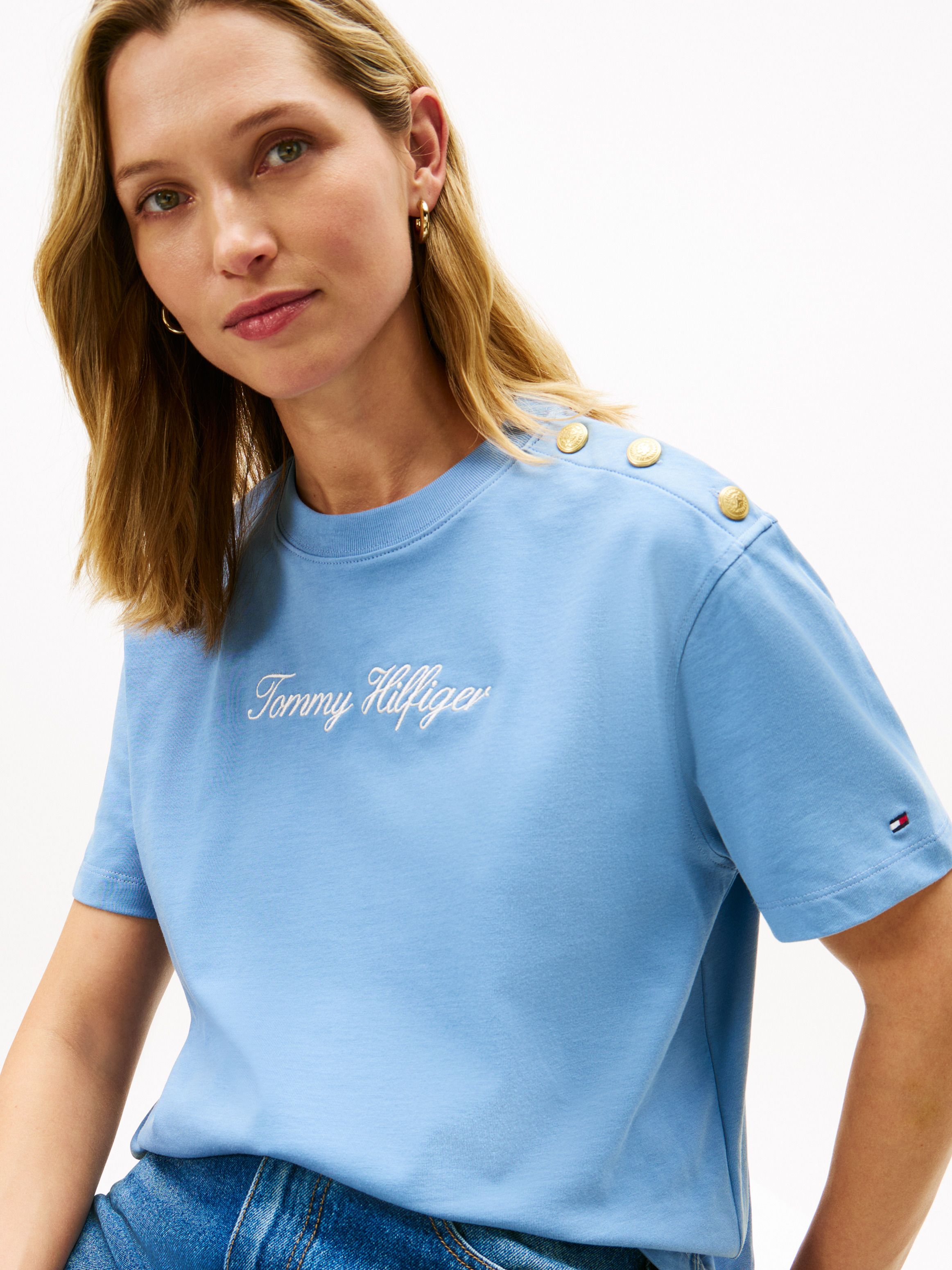 This relaxed-fit crew-neck T-shirt with signature embroidery features eye-catching gold-tone button detail on the shoulder, enhancing an everyday look.