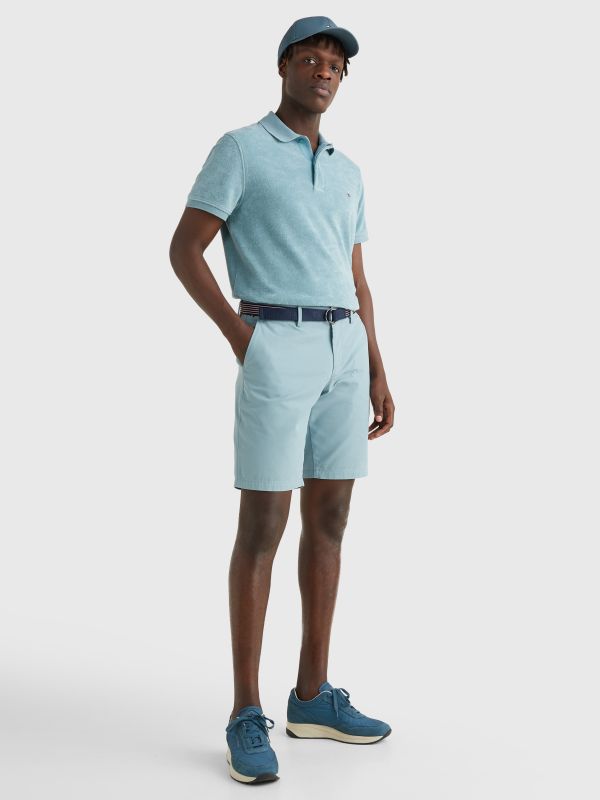 • Pure cotton twill • Belted waist • Zip with button closure • Two side slip pockets • Two back buttoned pockets • Signature tape on belt • Tommy Hilfiger branding • Tommy Hilfiger flag embroidery at back