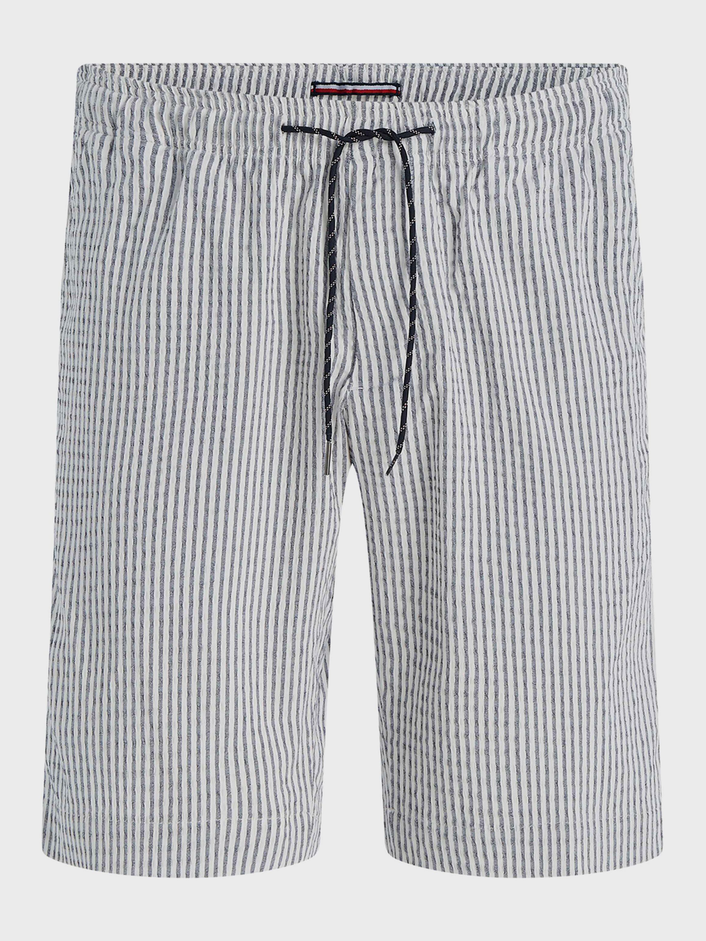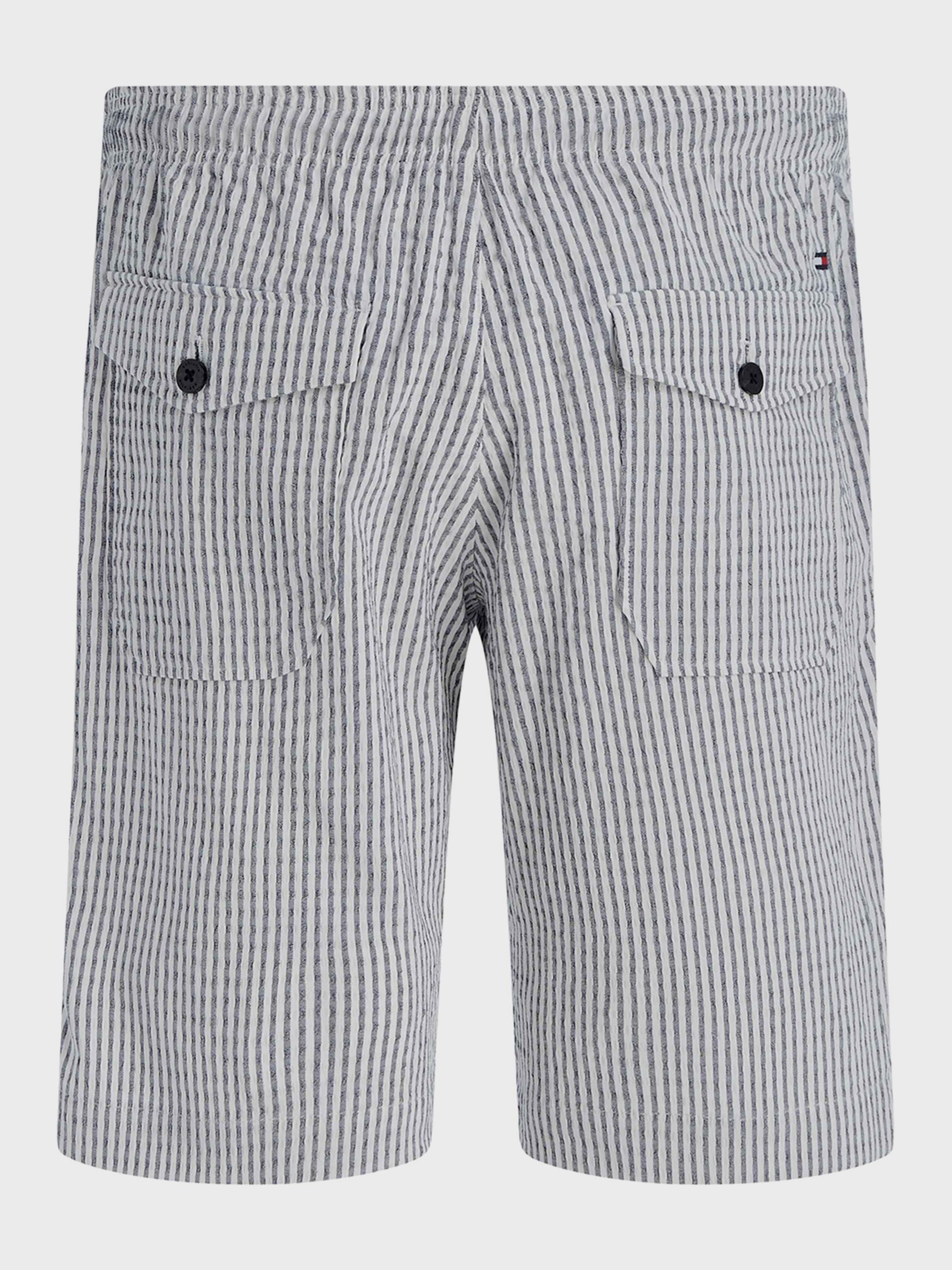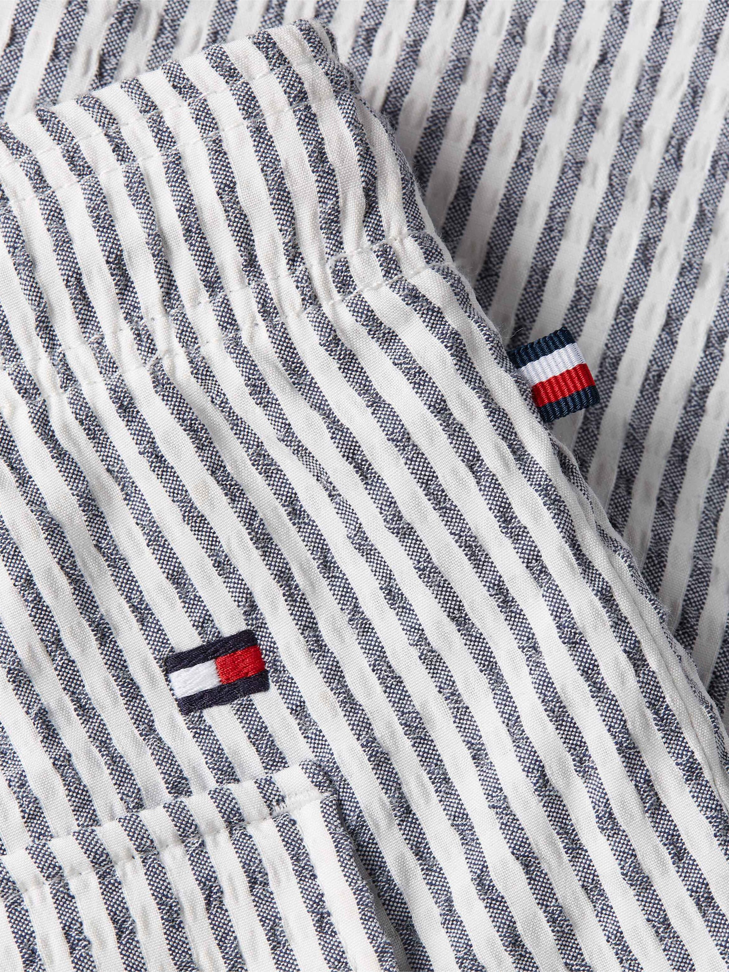 • Stretch cotton blend seersucker • Yarn dyed • All-over vertical stripe • Drawstring waist • Two back buttoned pockets • Tommy Hilfiger branding • Tommy Hilfiger flag embroidery at back