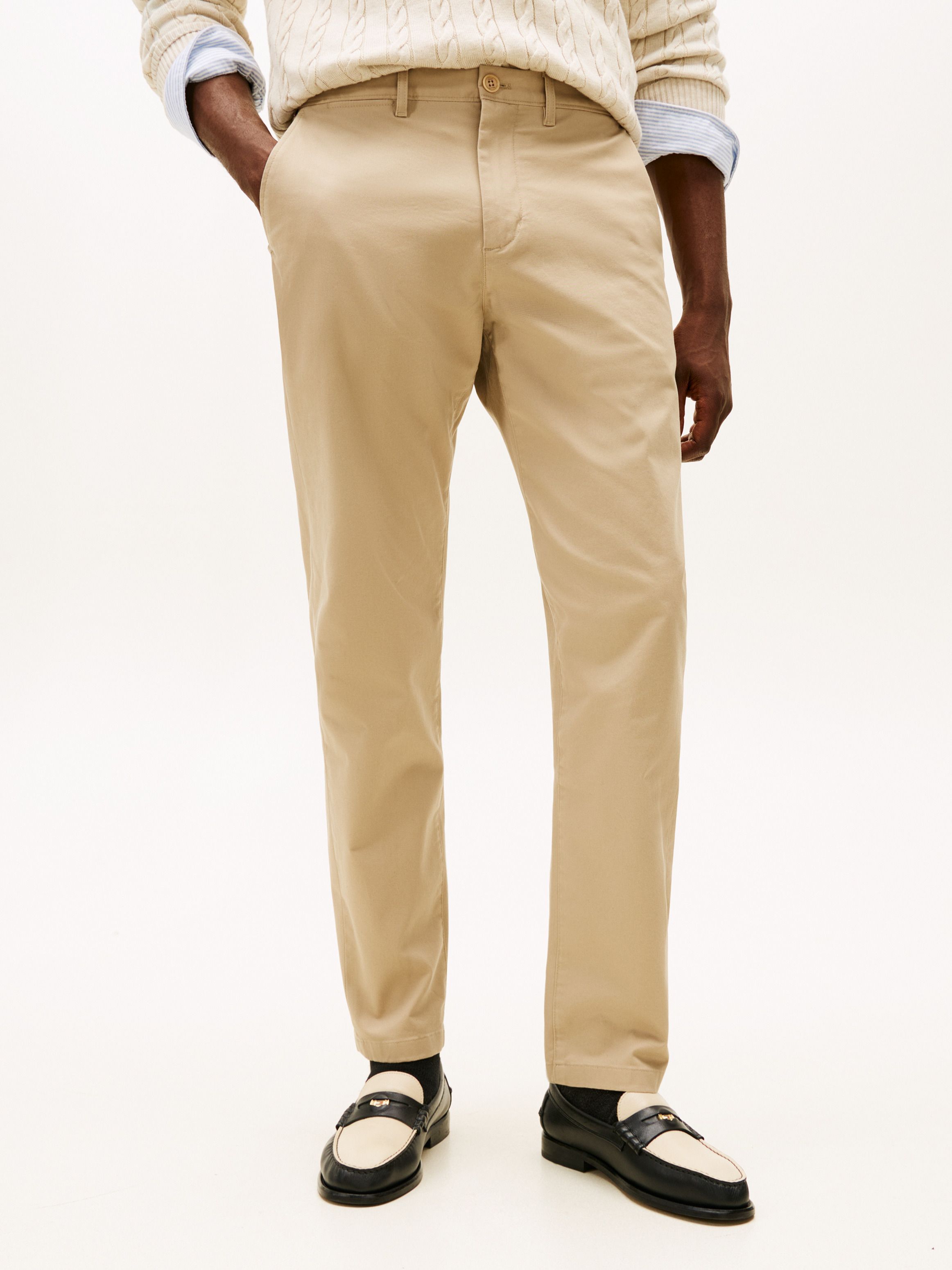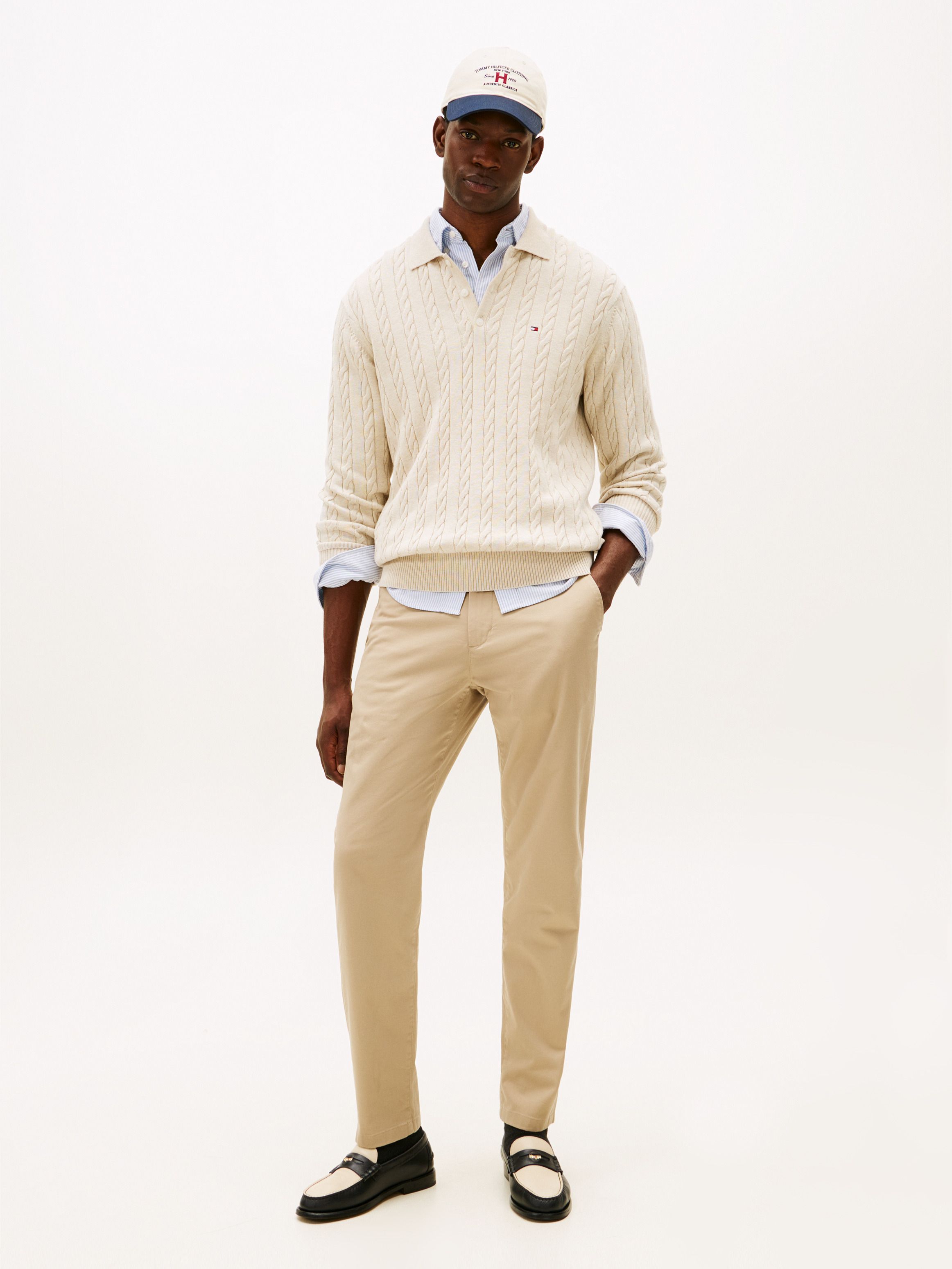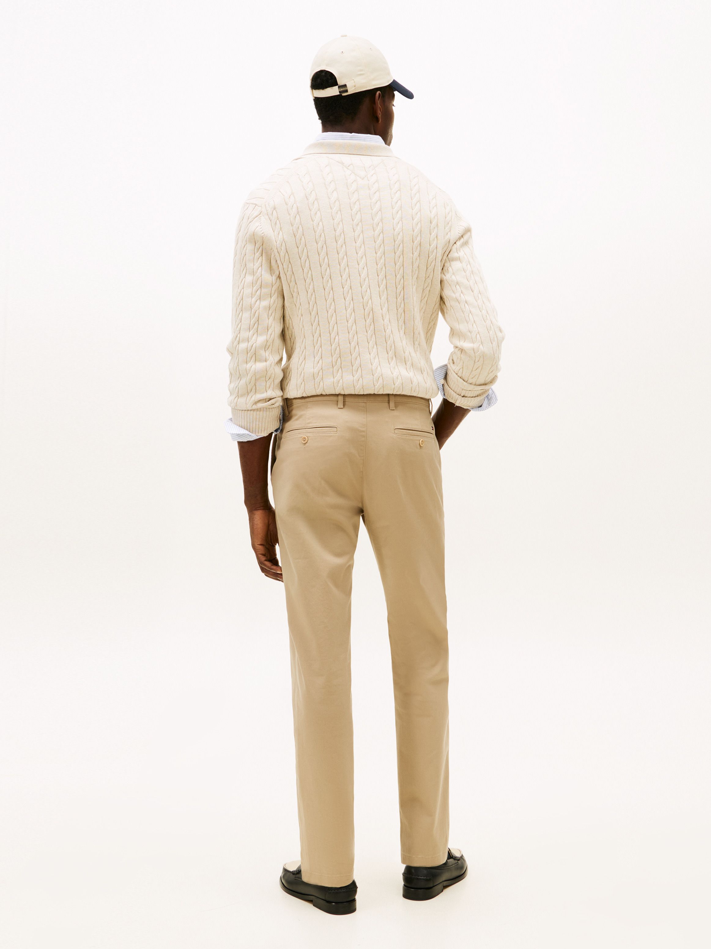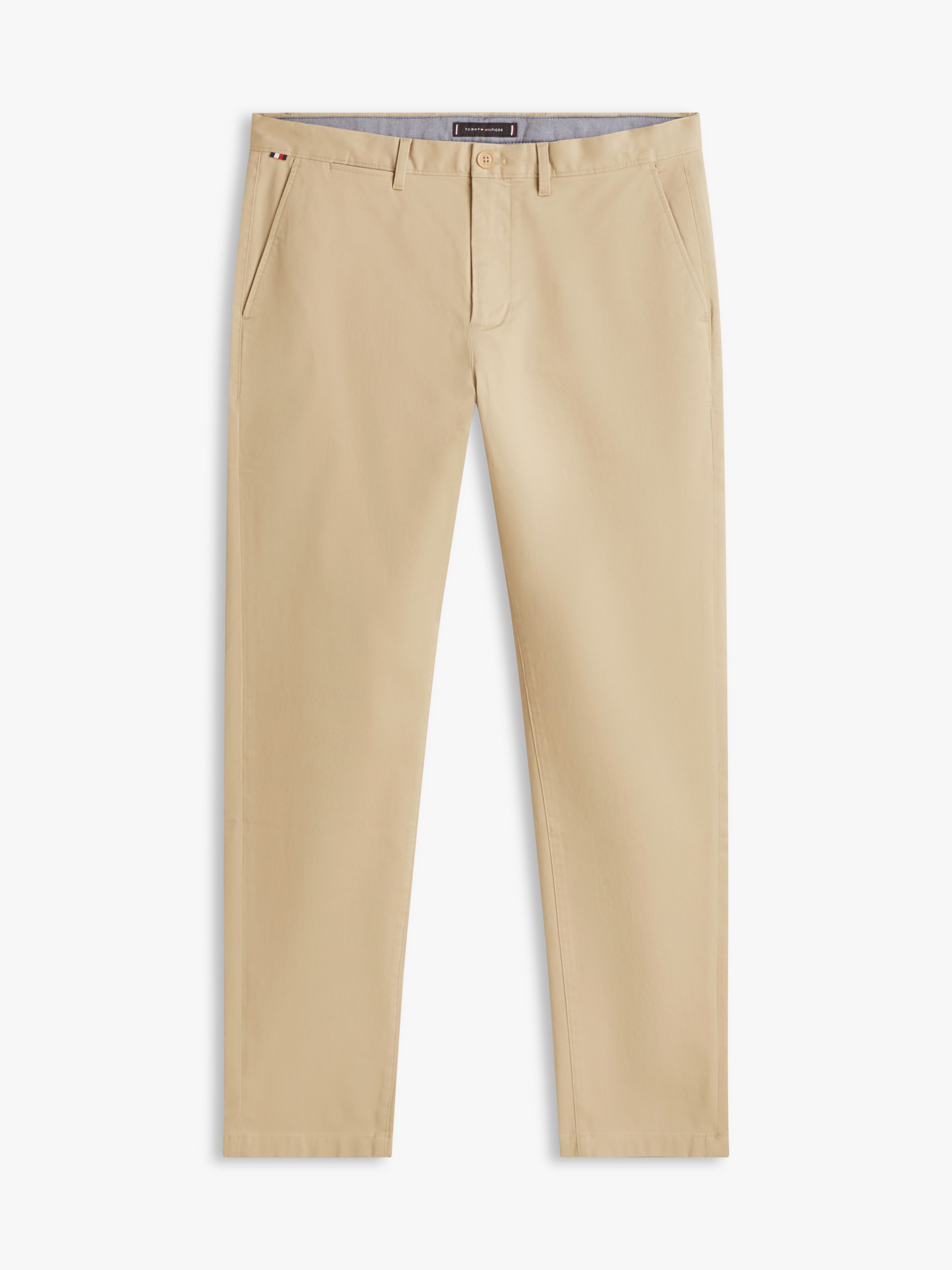 • Stretch cotton twill • Zip with button closure • Two waist angled slip pockets • Two back buttoned welt pockets • Signature tape on hip • Tommy Hilfiger branding • Tommy Hilfiger flag embroidery on back