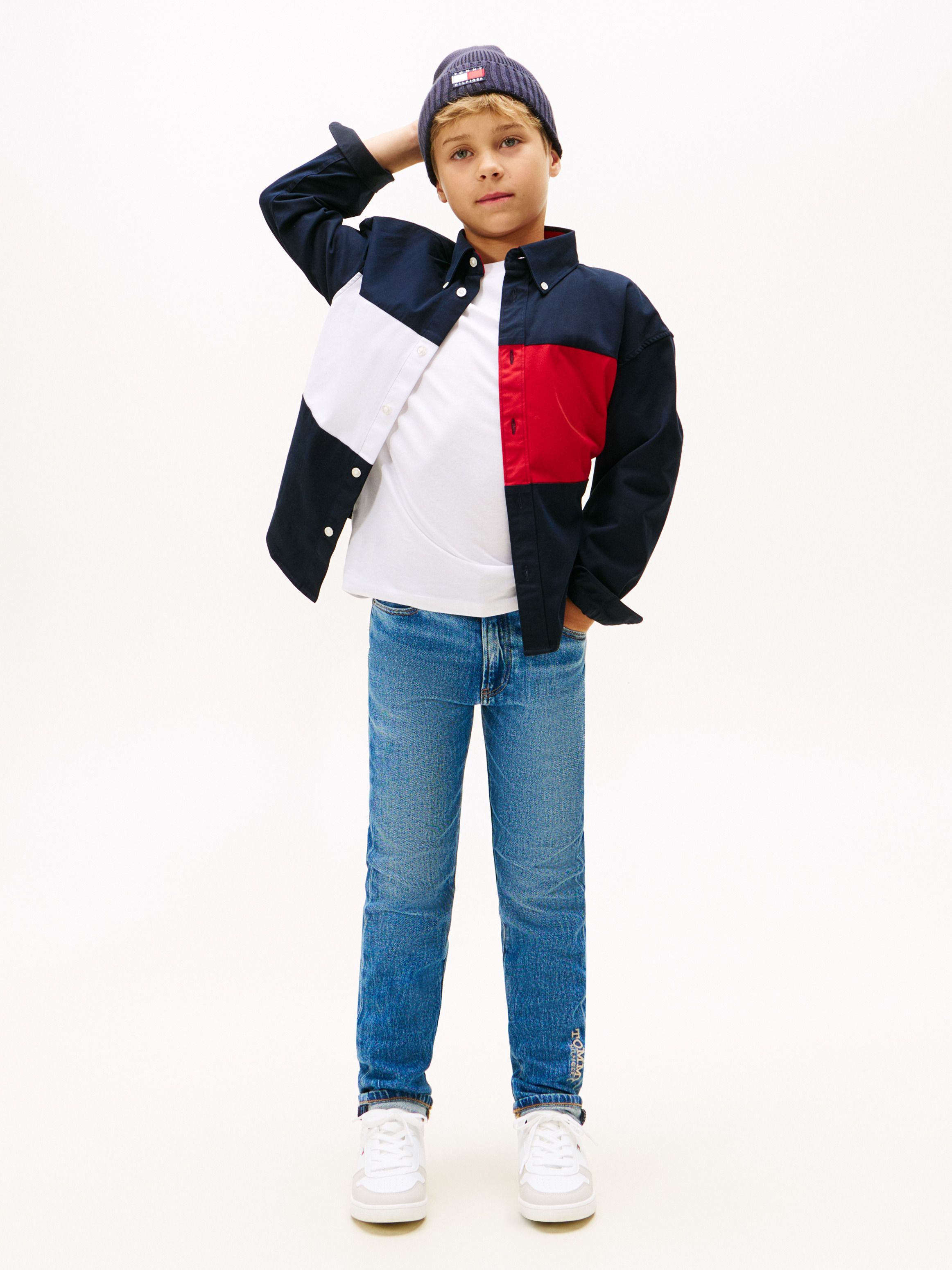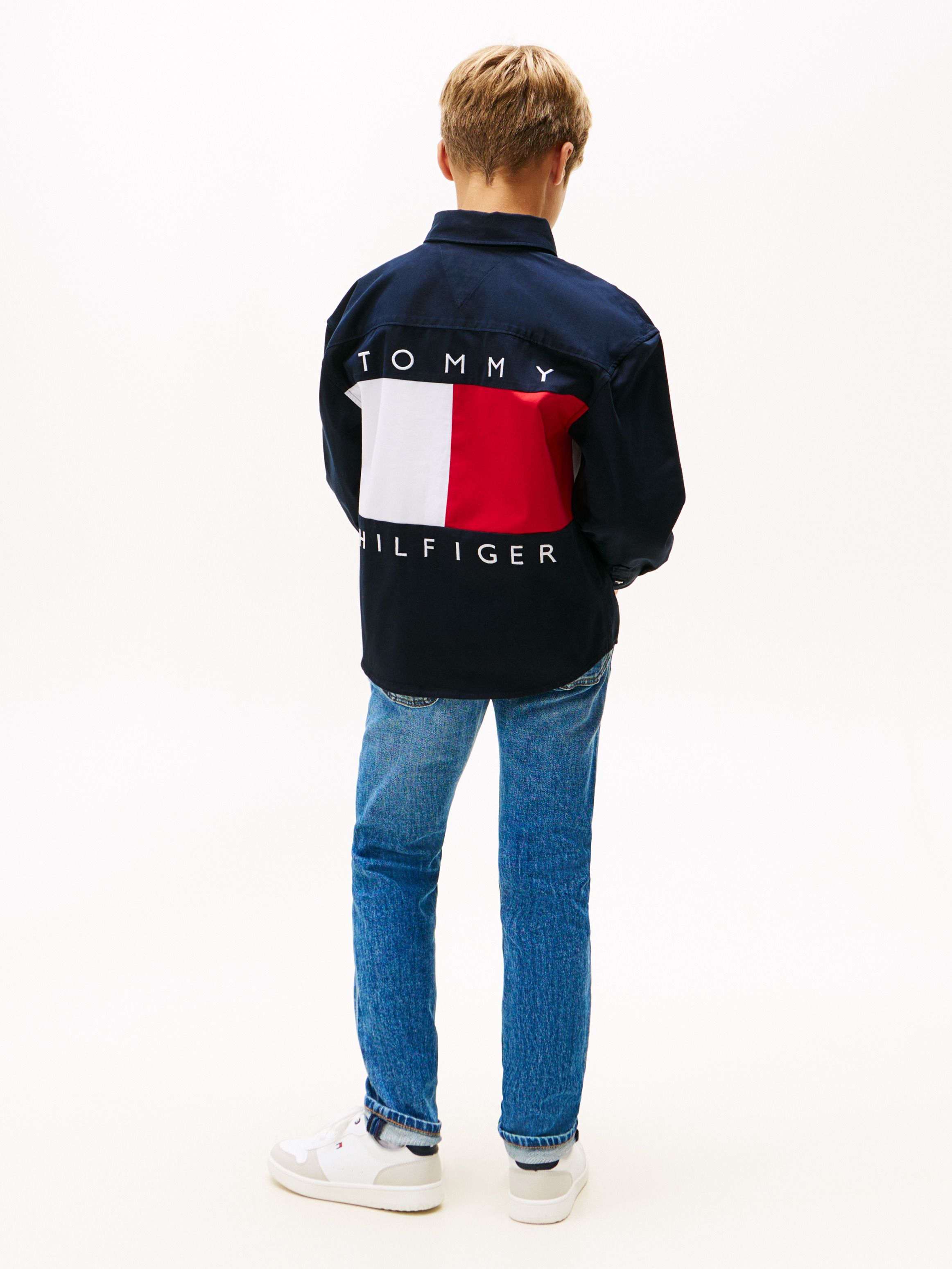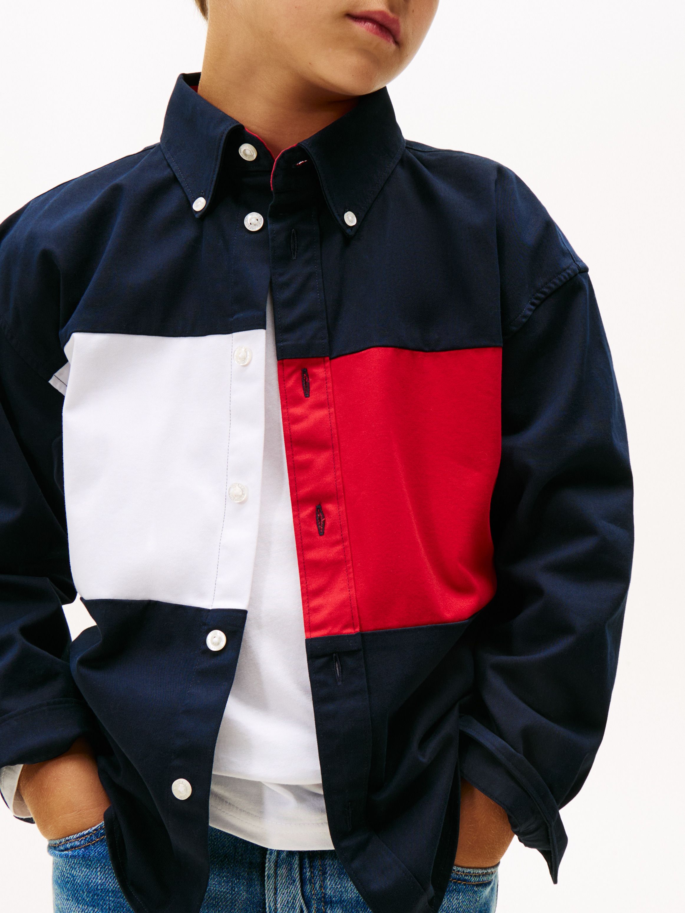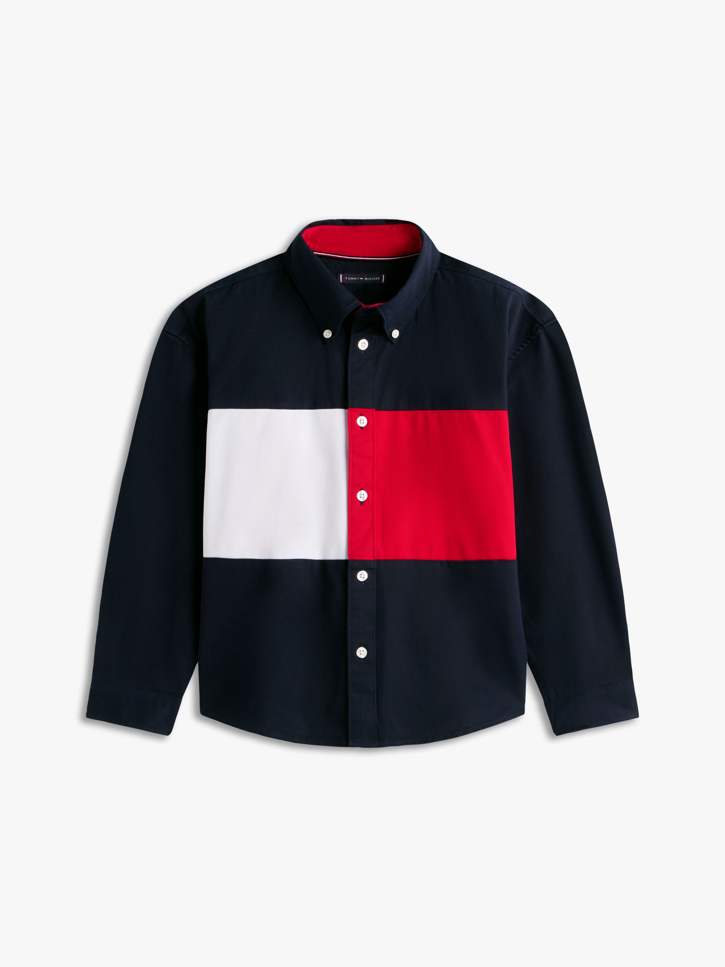 • Stretch cotton twill • Colour-blocked flag design on front and back • Button-down collar • Rounded one-button cuffs • Signature cuff button • Signature tape inside neckline • Tommy Hilfiger logo embroidery on back • Tommy Hilfiger branding • Tommy Hilfiger flag embroidery on sleeve