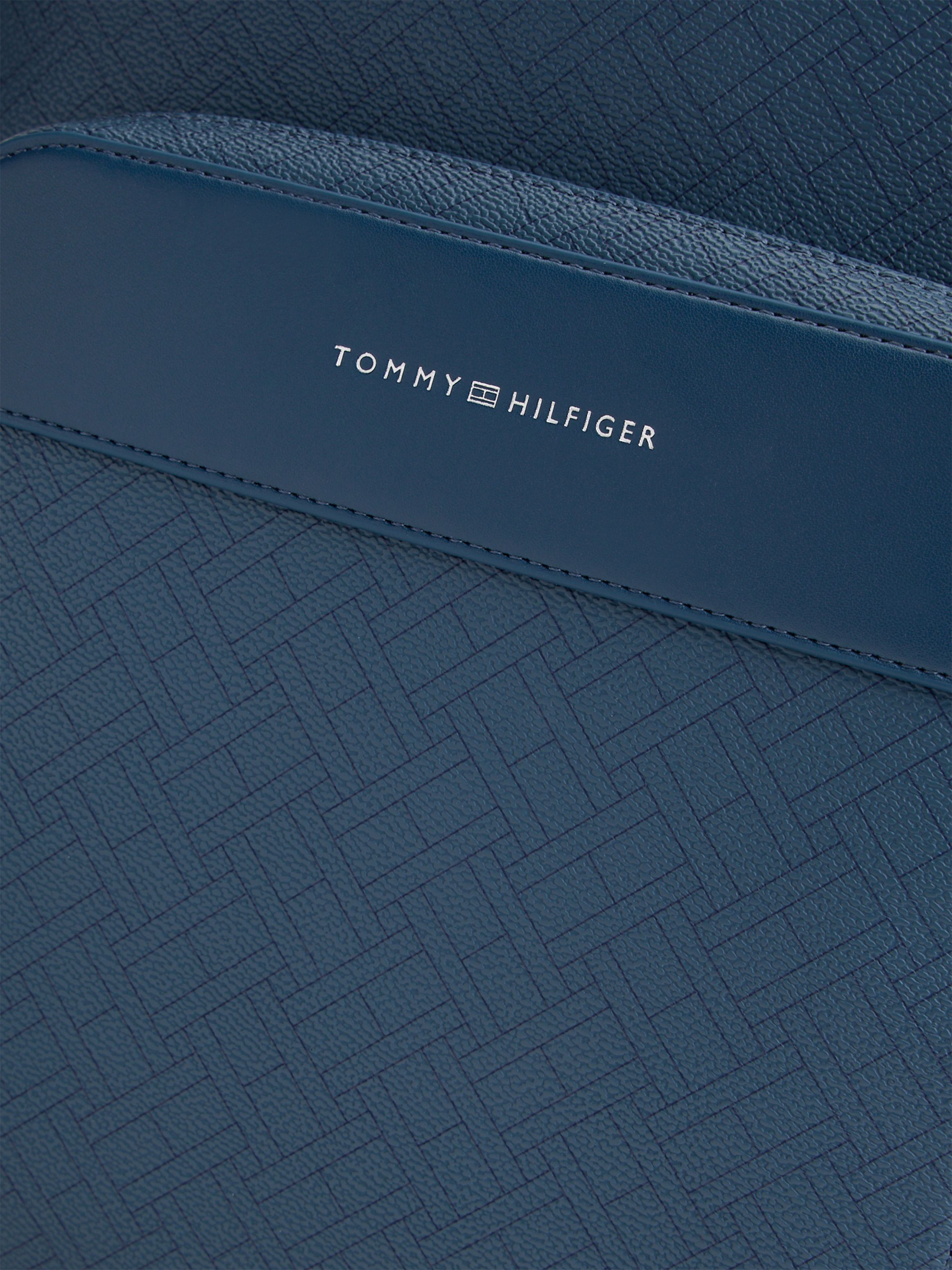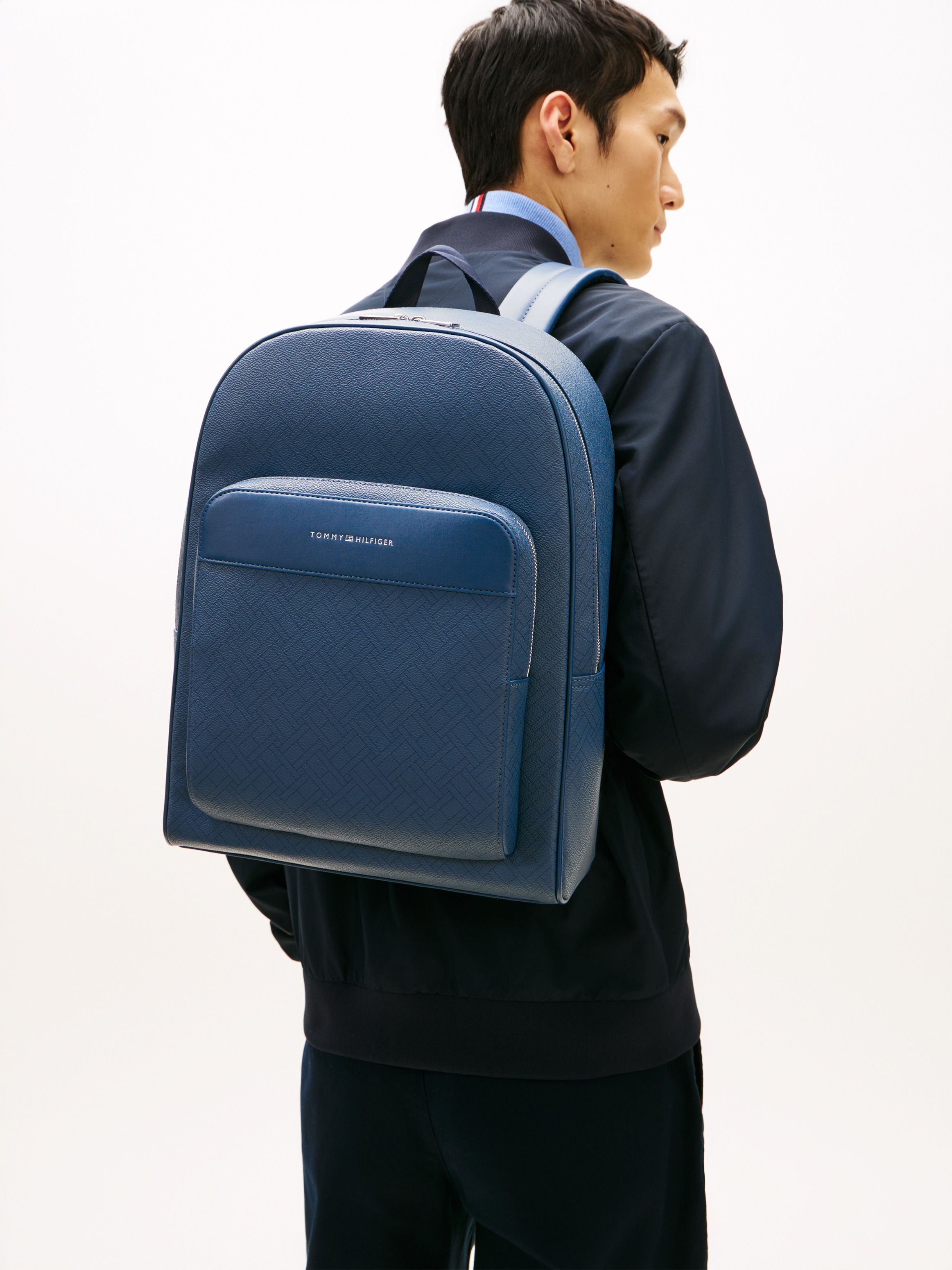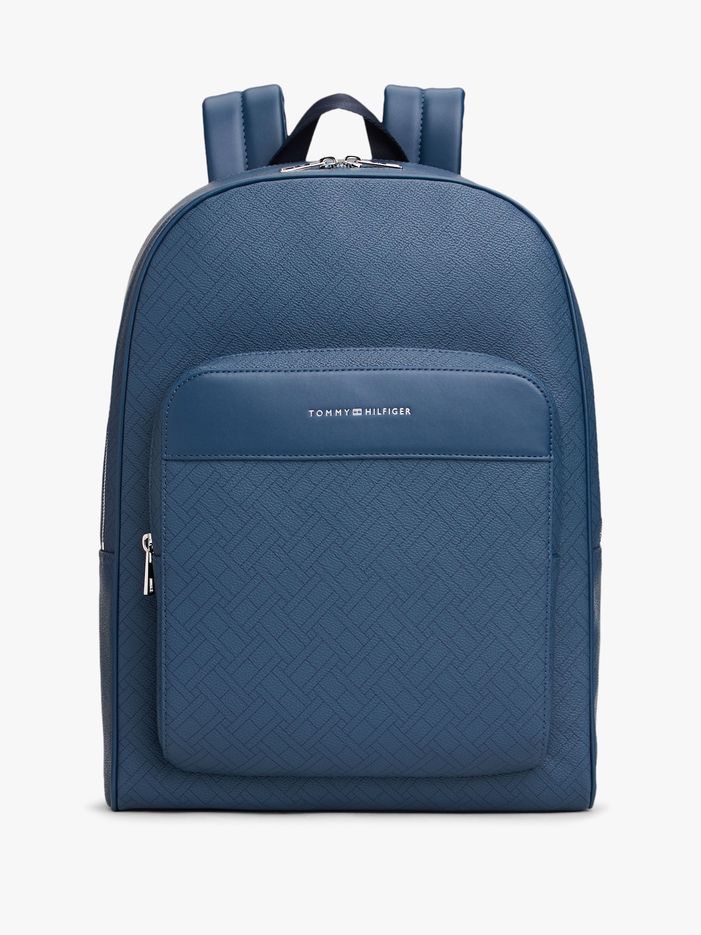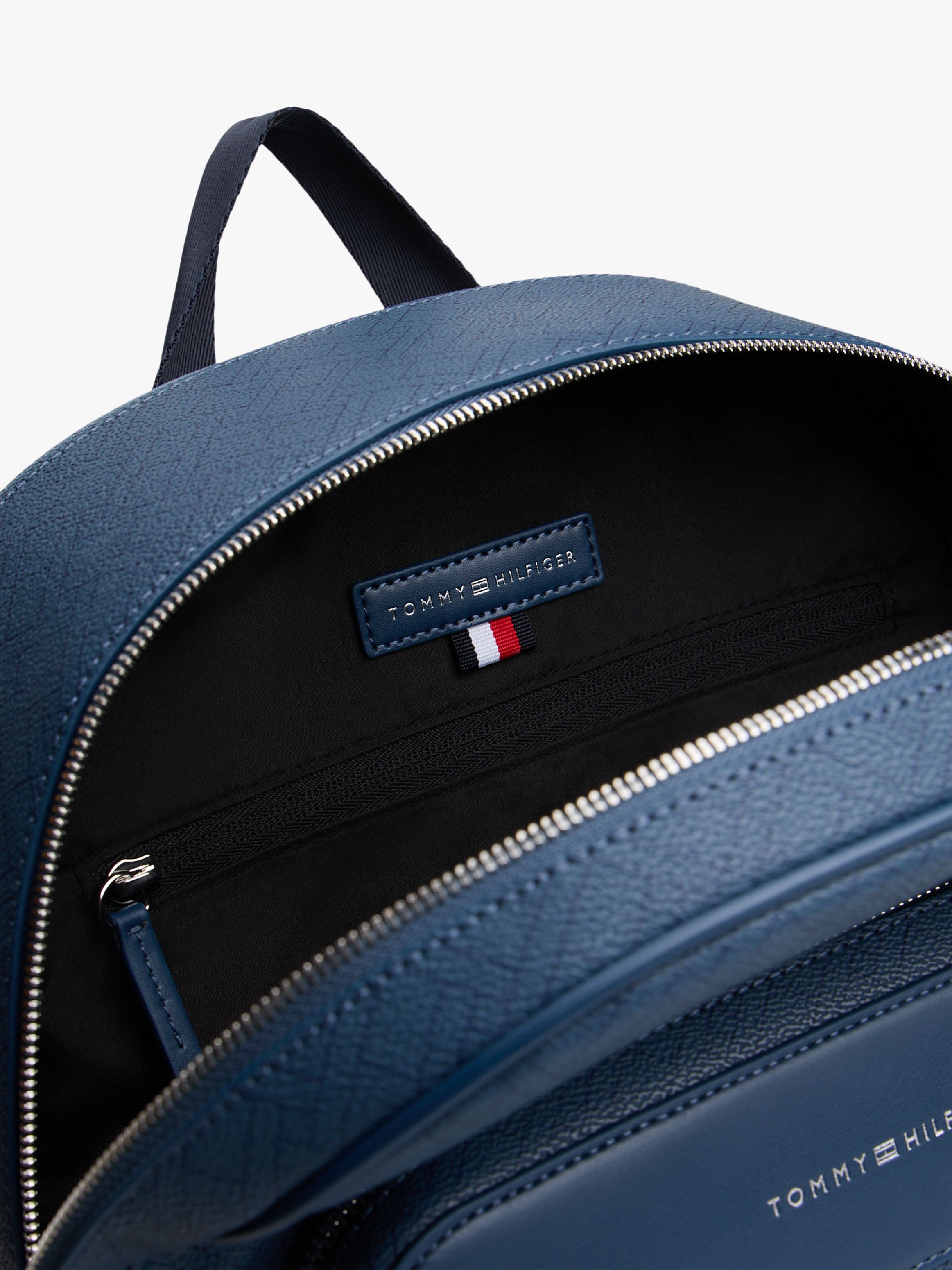 • Mixed texture panels • Dome design • All-over repeat flag design on front • Double zip closure • One top handle • Adjustable padded shoulder straps • One main compartment • One interior zipped pocket • One exterior zipped pocket • Trolley strap • Padded mesh back • Tommy Hilfiger metallic logo embossed on front • Tommy Hilfiger branding