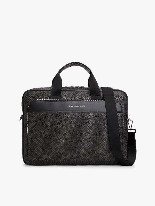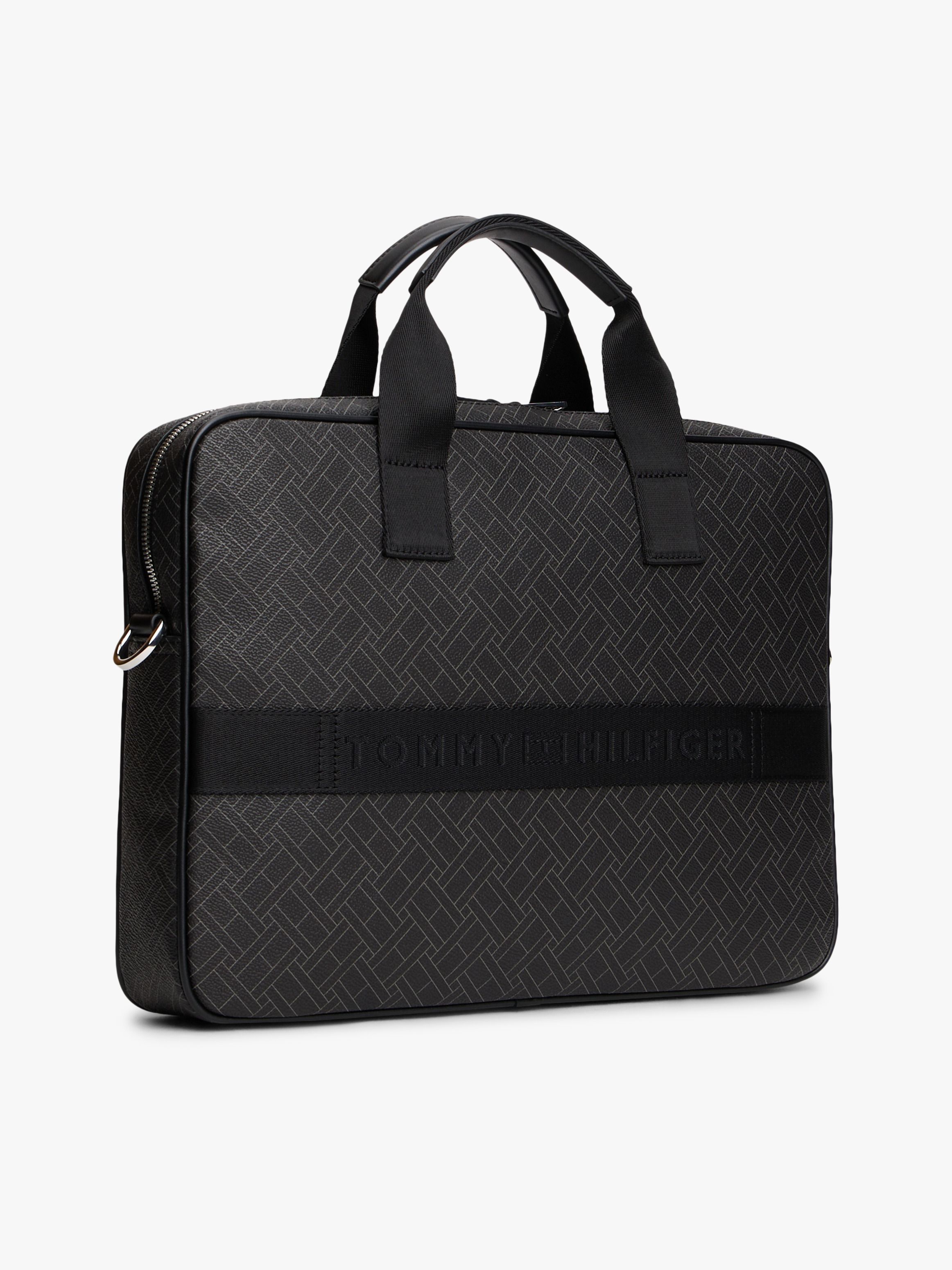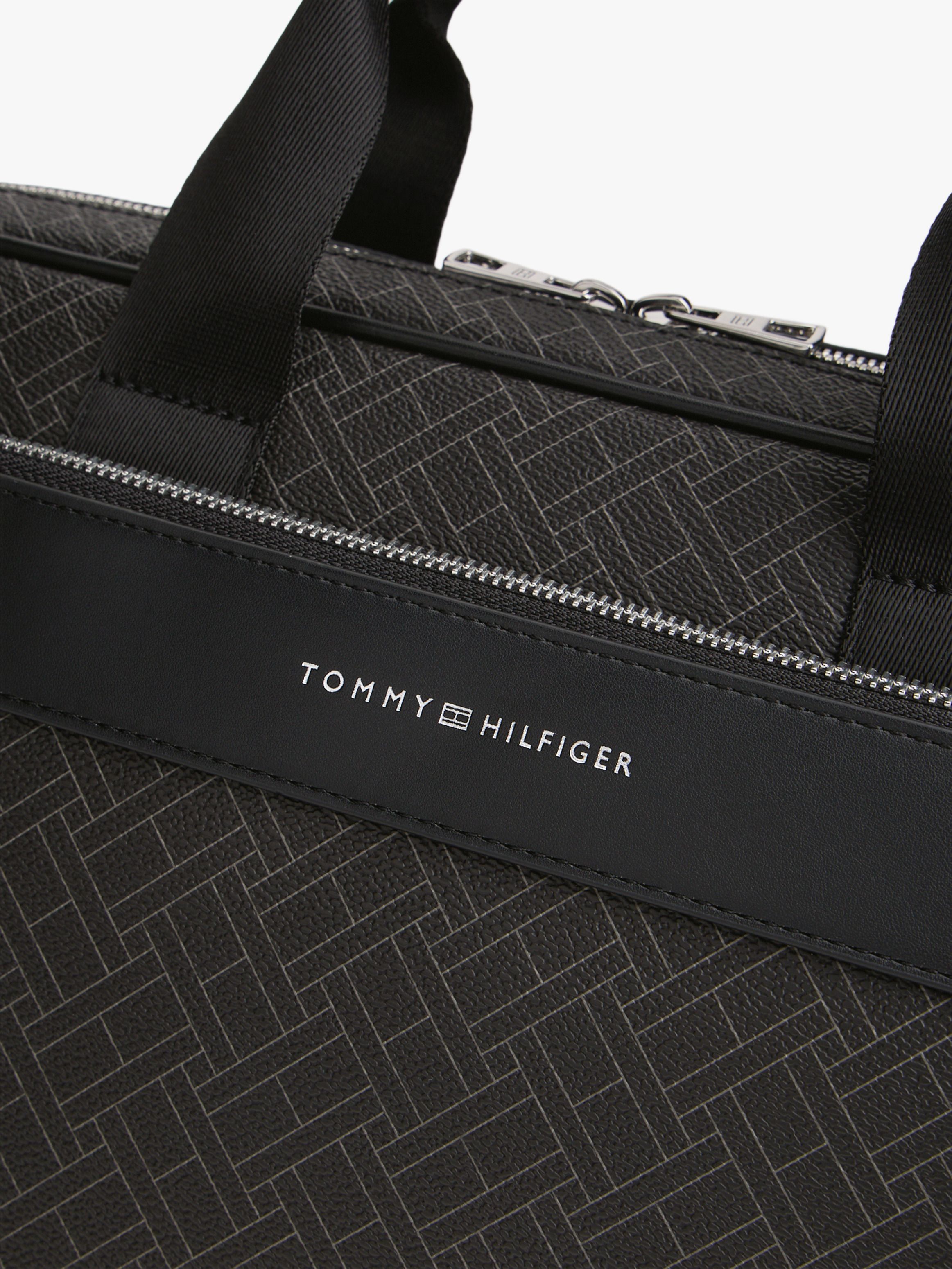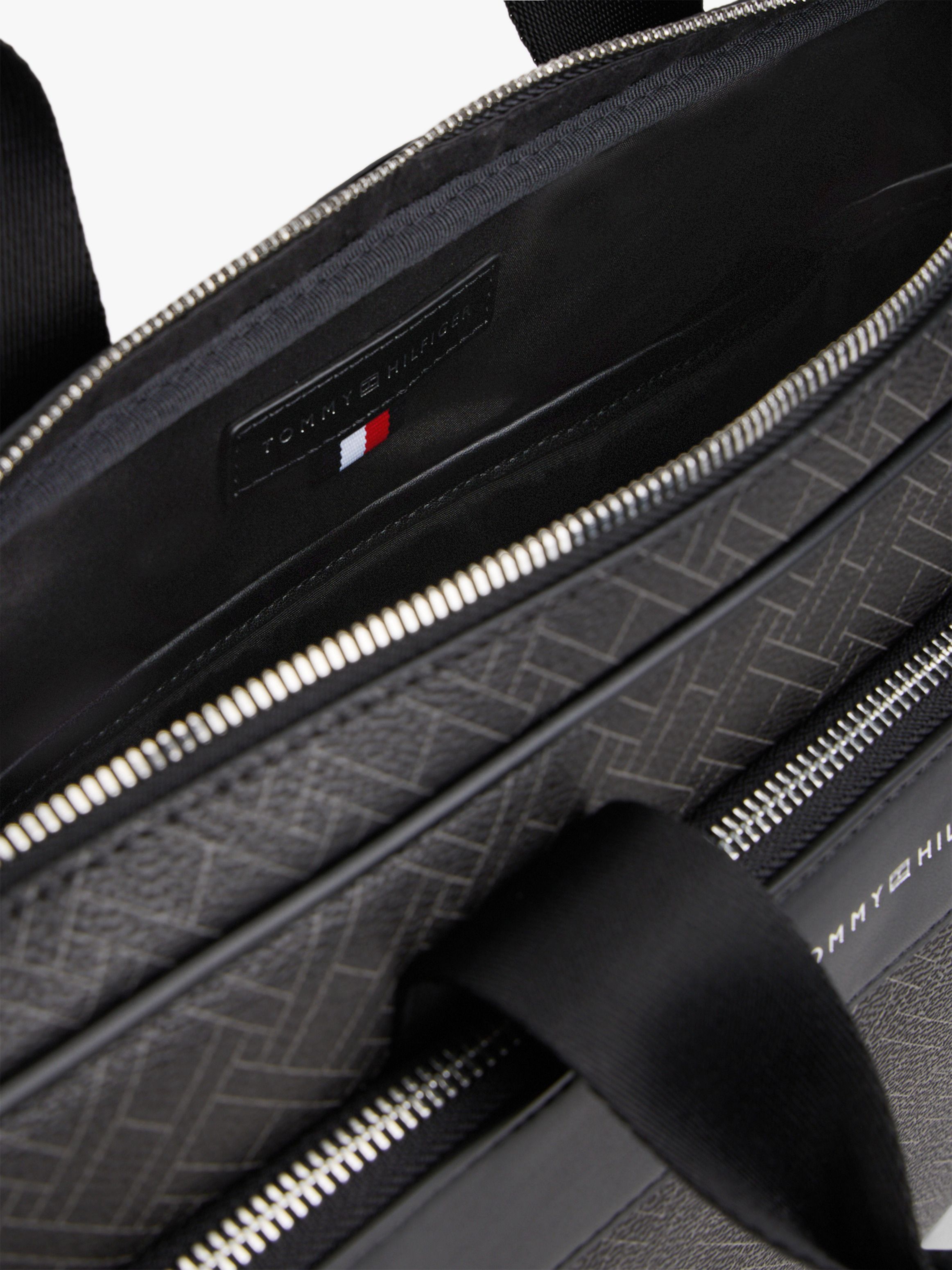 • Mixed texture panels • All-over repeat flag design on front and back • Double zip closure • Two top handles • Adjustable removable crossbody strap • One main compartment • Built-in laptop sleeve • One interior zipped pocket • One exterior zipped pocket • Trolley strap • Tommy Hilfiger metallic logo embossed on front • Tommy Hilfiger branding