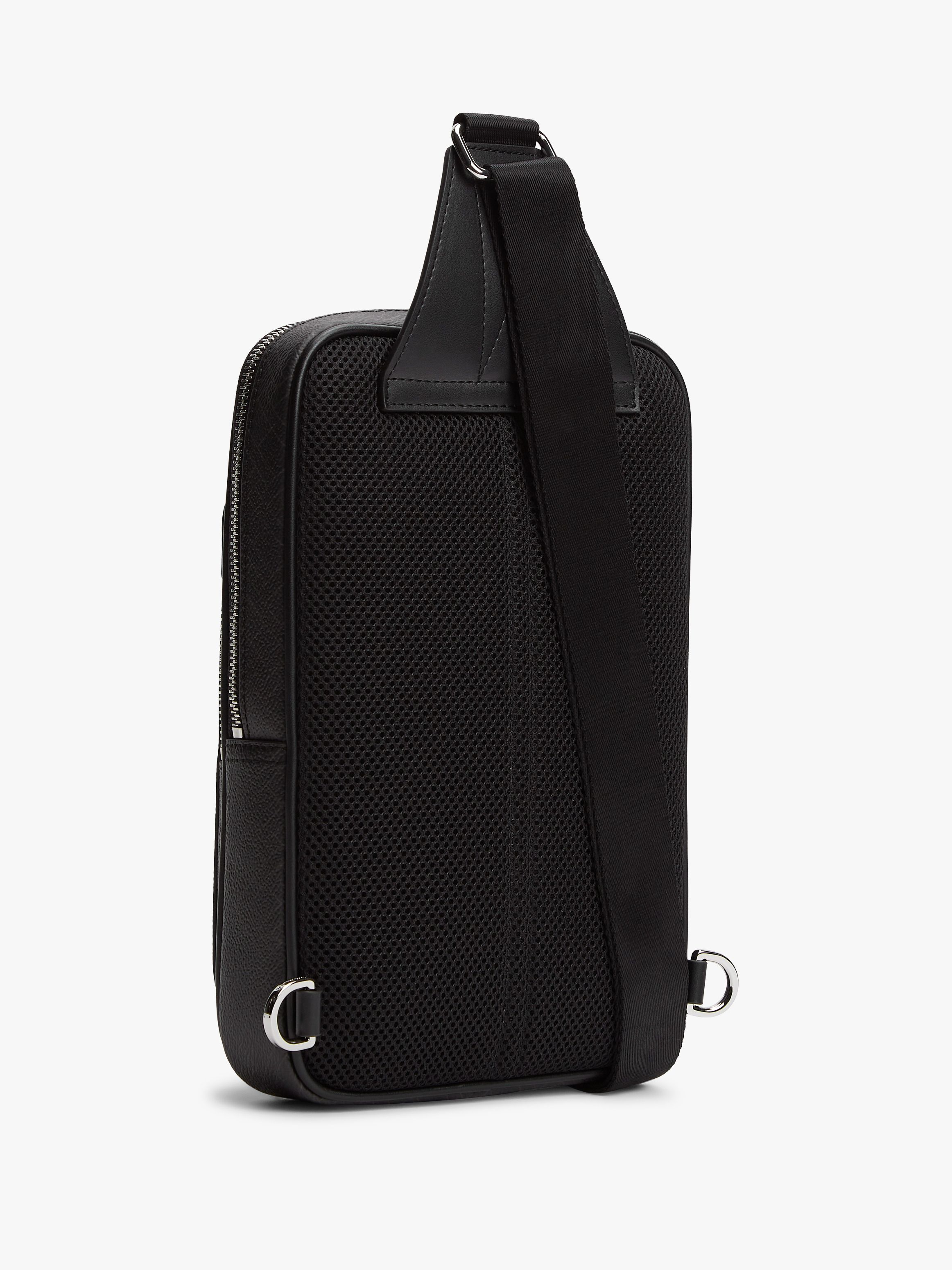 This sling bag combines a branded aesthetic with practical design details, featuring an adjustable crossbody strap and a premium, tactile finish.