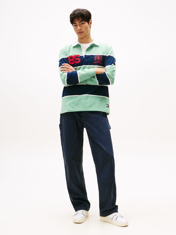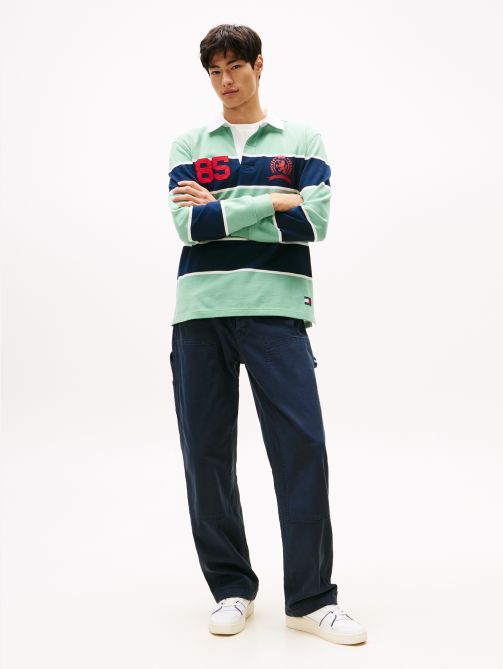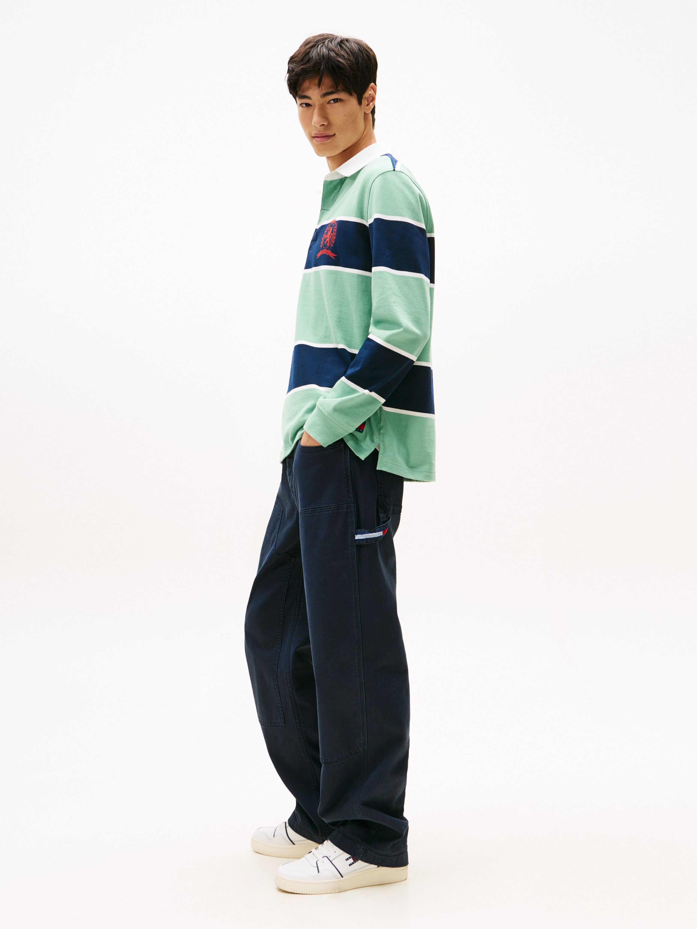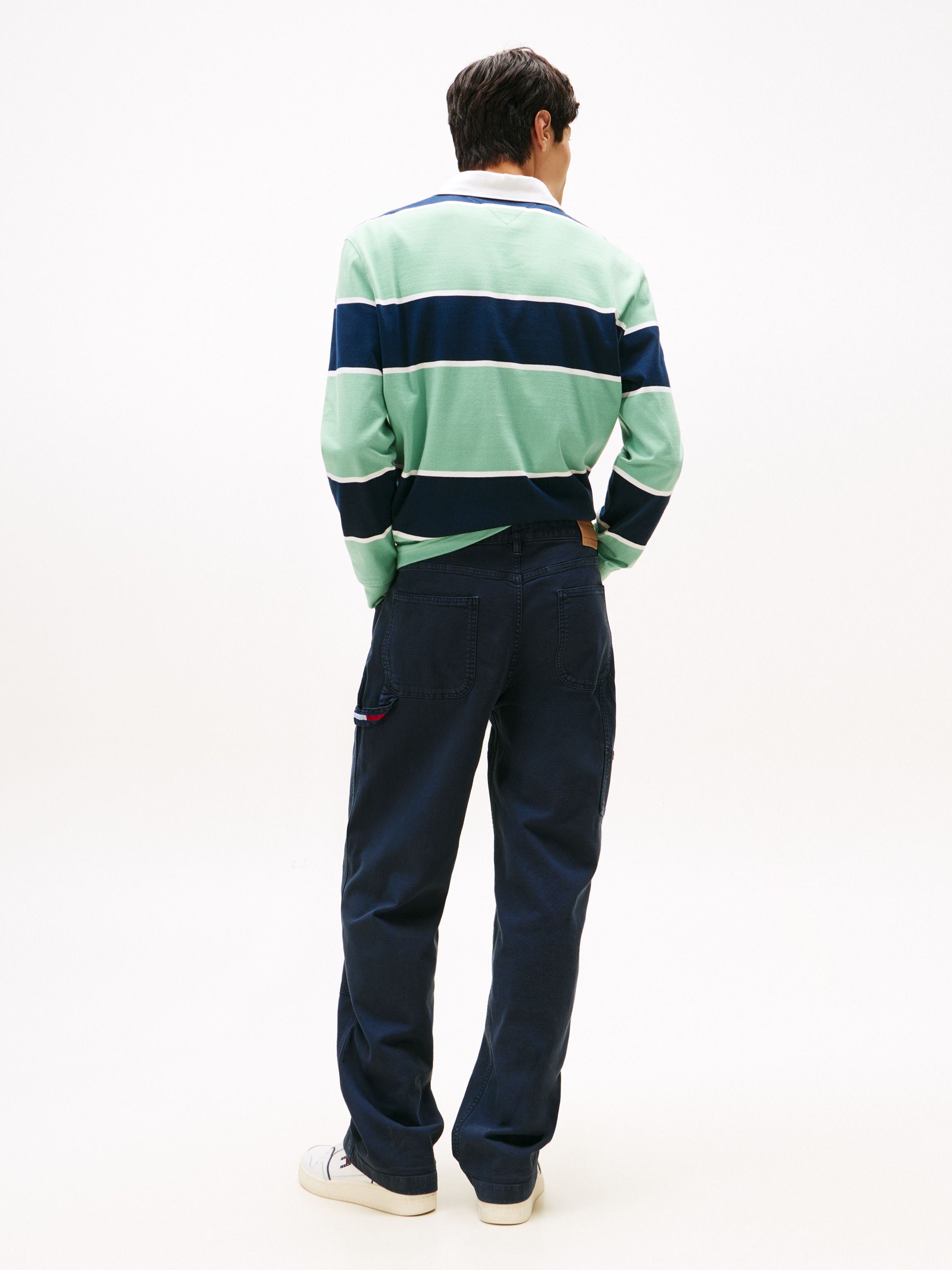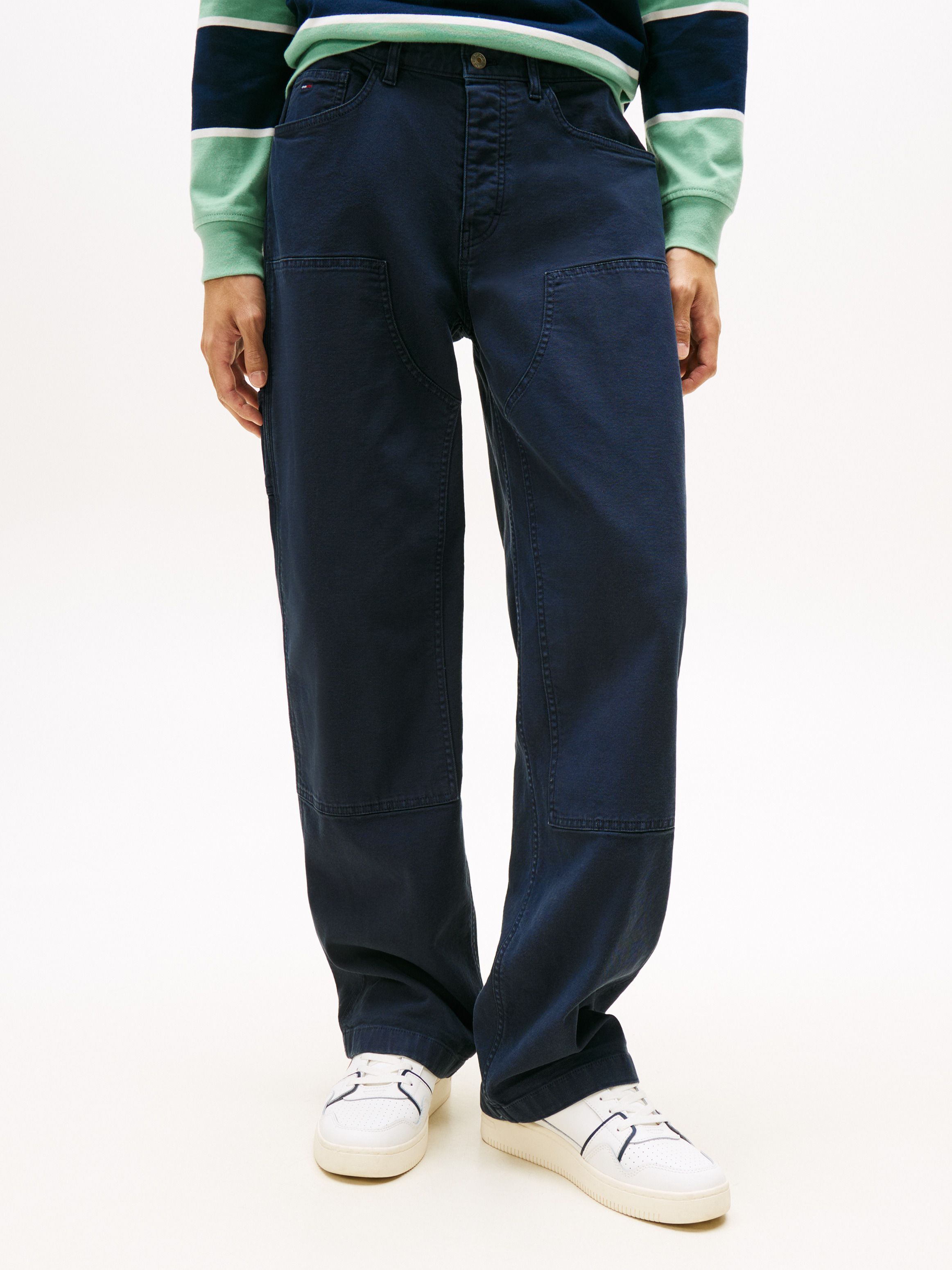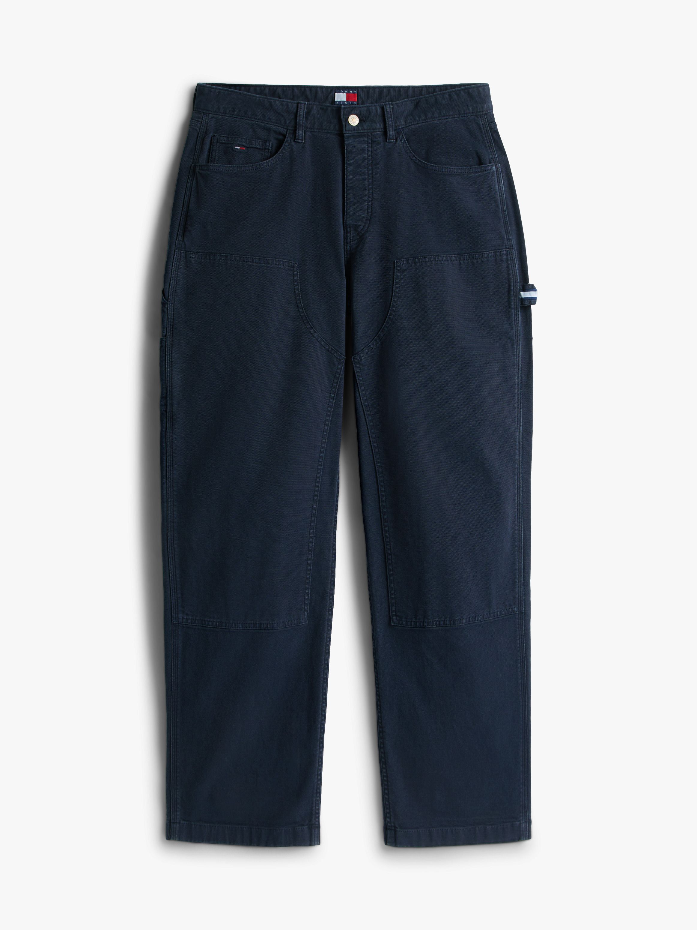 • Stretch cotton canvas • Zip with button closure • Five-pocket styling • One side carpenter pocket • Signature detailing on hammer loop • Tommy Jeans branding • Tommy Jeans flag patch on coin pocket