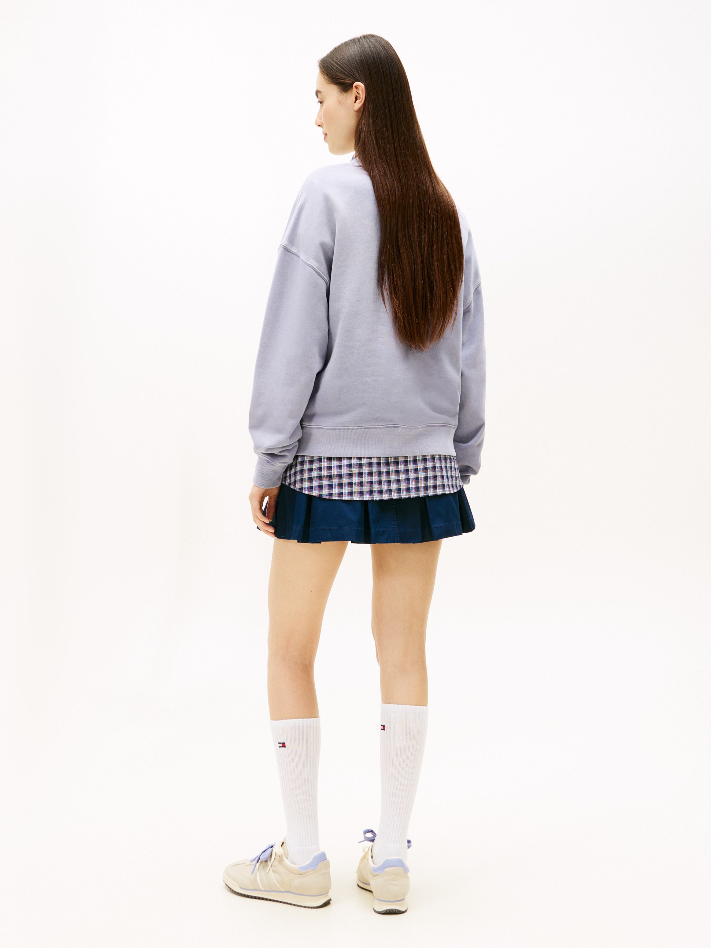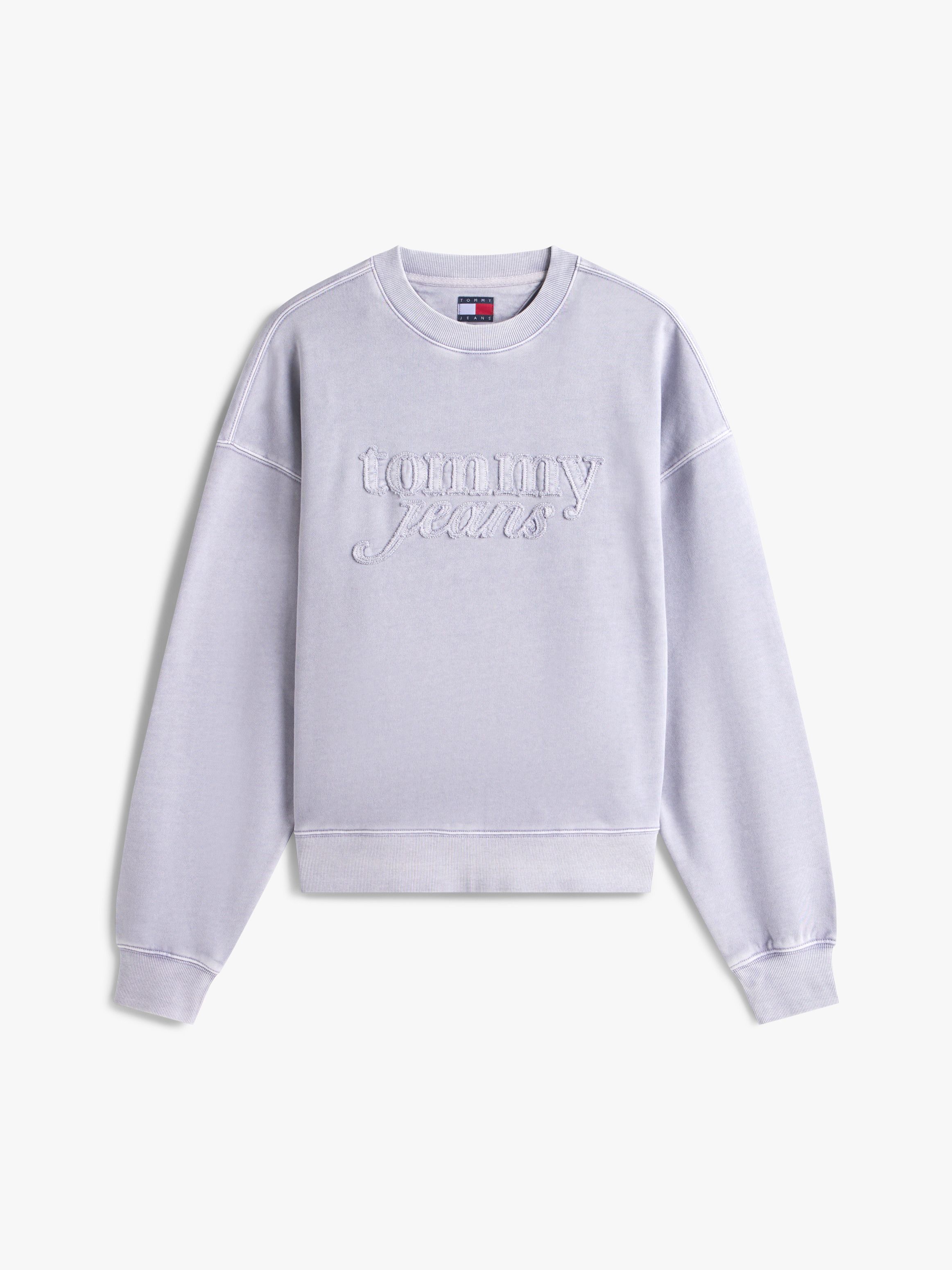 • Pure cotton terry • Garment dyed • Crew neck • Rib-knit collar, cuffs and hem • Tommy Jeans serif script logo appliqué on chest • Tommy Jeans branding