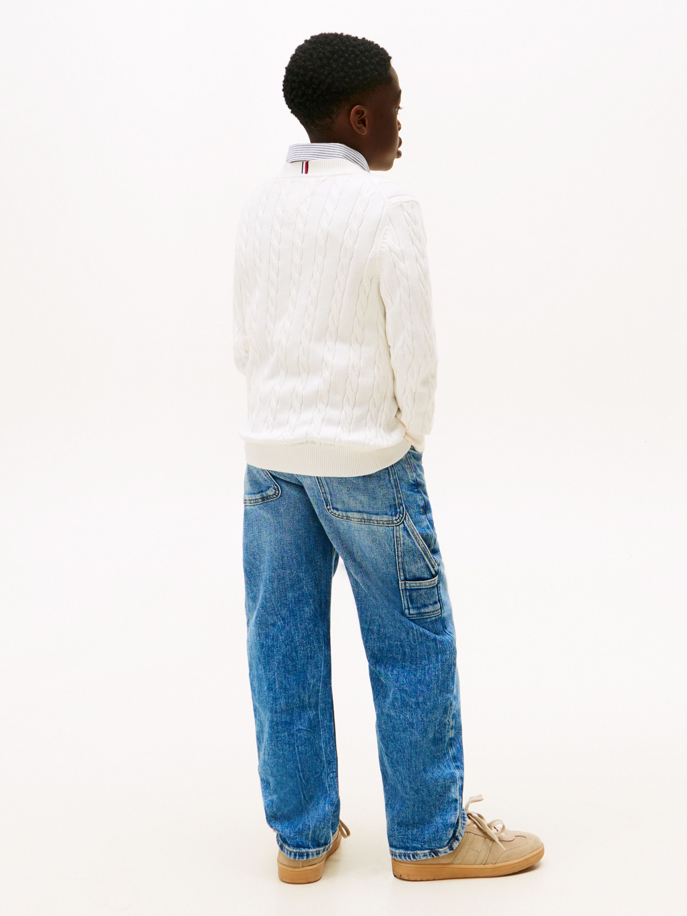 • Pure combed cotton • All-over cable knit • Relaxed crew neck • Rib-knit collar, cuffs and hem • Signature tape on nape • Tommy Hilfiger logo on chest • Tommy Hilfiger branding • Tommy Hilfiger flag embroidery on sleeve