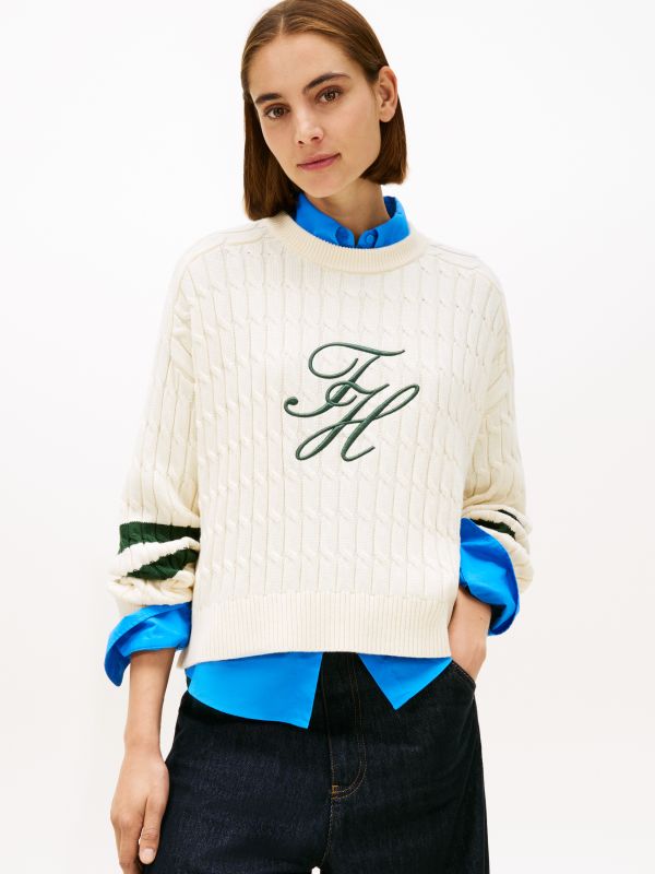 • Pure combed cotton • All-over cable knit • Crew neck • Contrast stripe on sleeves • Rib-knit collar, cuffs and hem • Signature tape inside neckline • Tommy Hilfiger script logo embroidery on front • Tommy Hilfiger branding • Tommy Hilfiger metal flag on sleeve