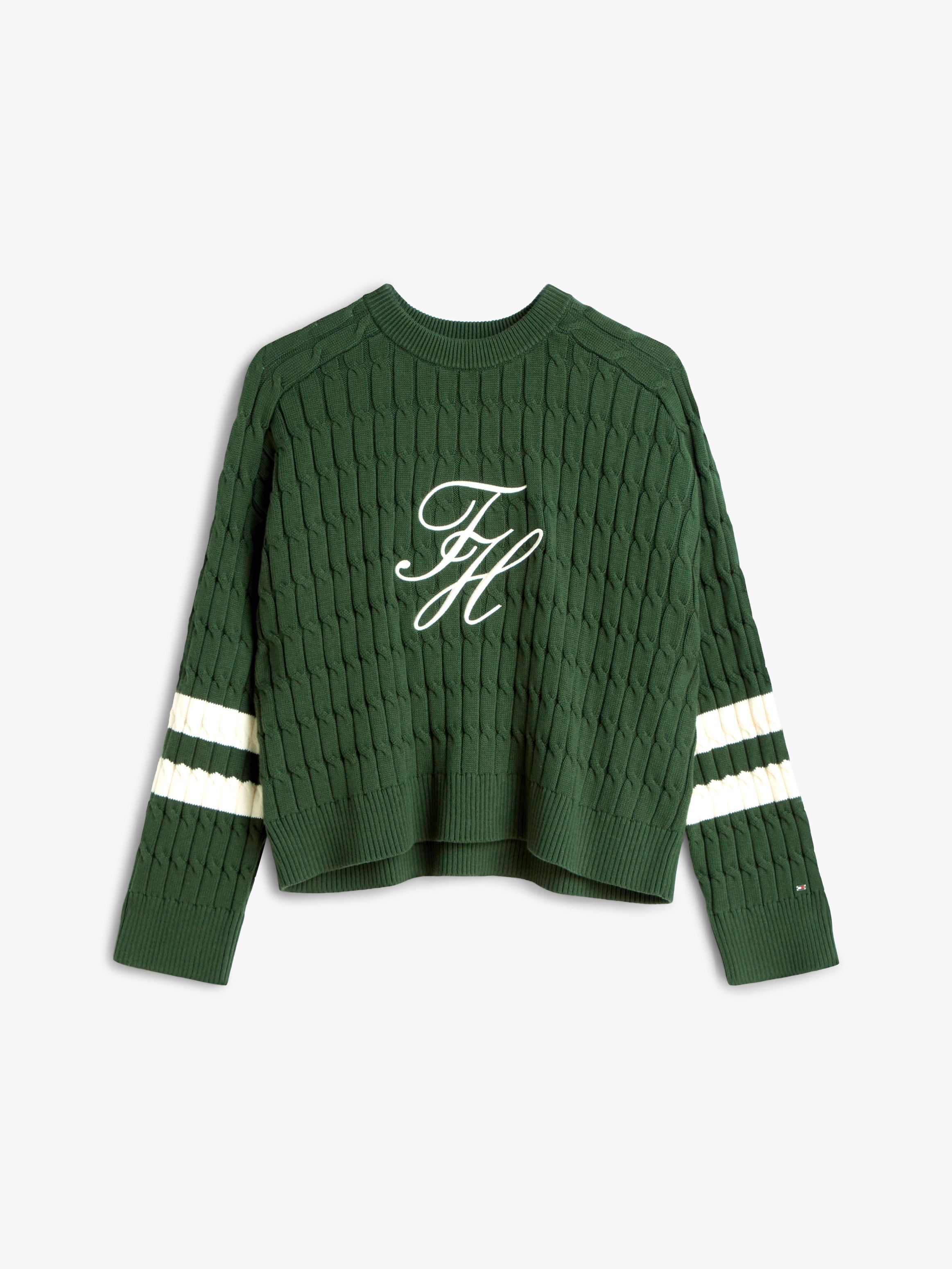 • Pure combed cotton • All-over cable knit • Crew neck • Contrast stripe on sleeves • Rib-knit collar, cuffs and hem • Signature tape inside neckline • Tommy Hilfiger script logo embroidery on front • Tommy Hilfiger branding • Tommy Hilfiger metal flag on sleeve