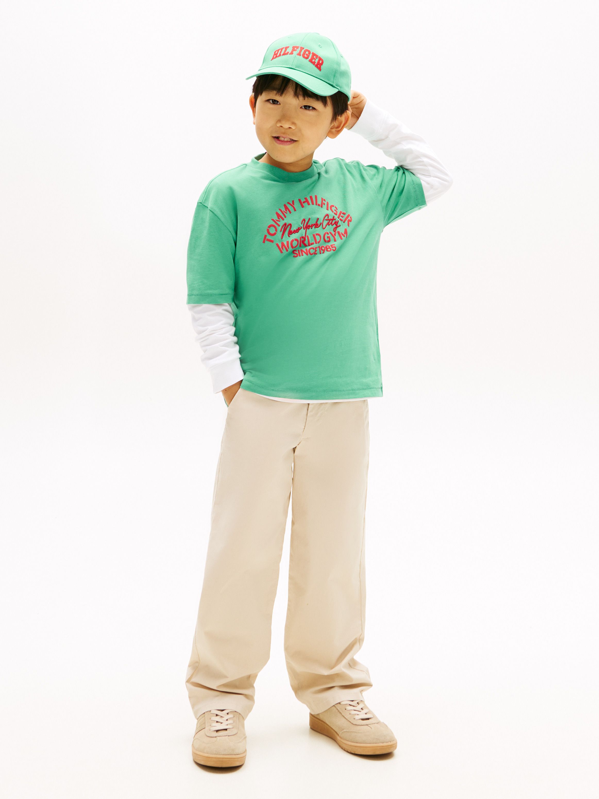 • Pure cotton jersey • Crew neck • Signature tape on nape • Tommy Hilfiger logo graphic on chest • Tommy Hilfiger NYC logo embroidery on chest • Tommy Hilfiger branding • Tommy Hilfiger flag embroidery on sleeve