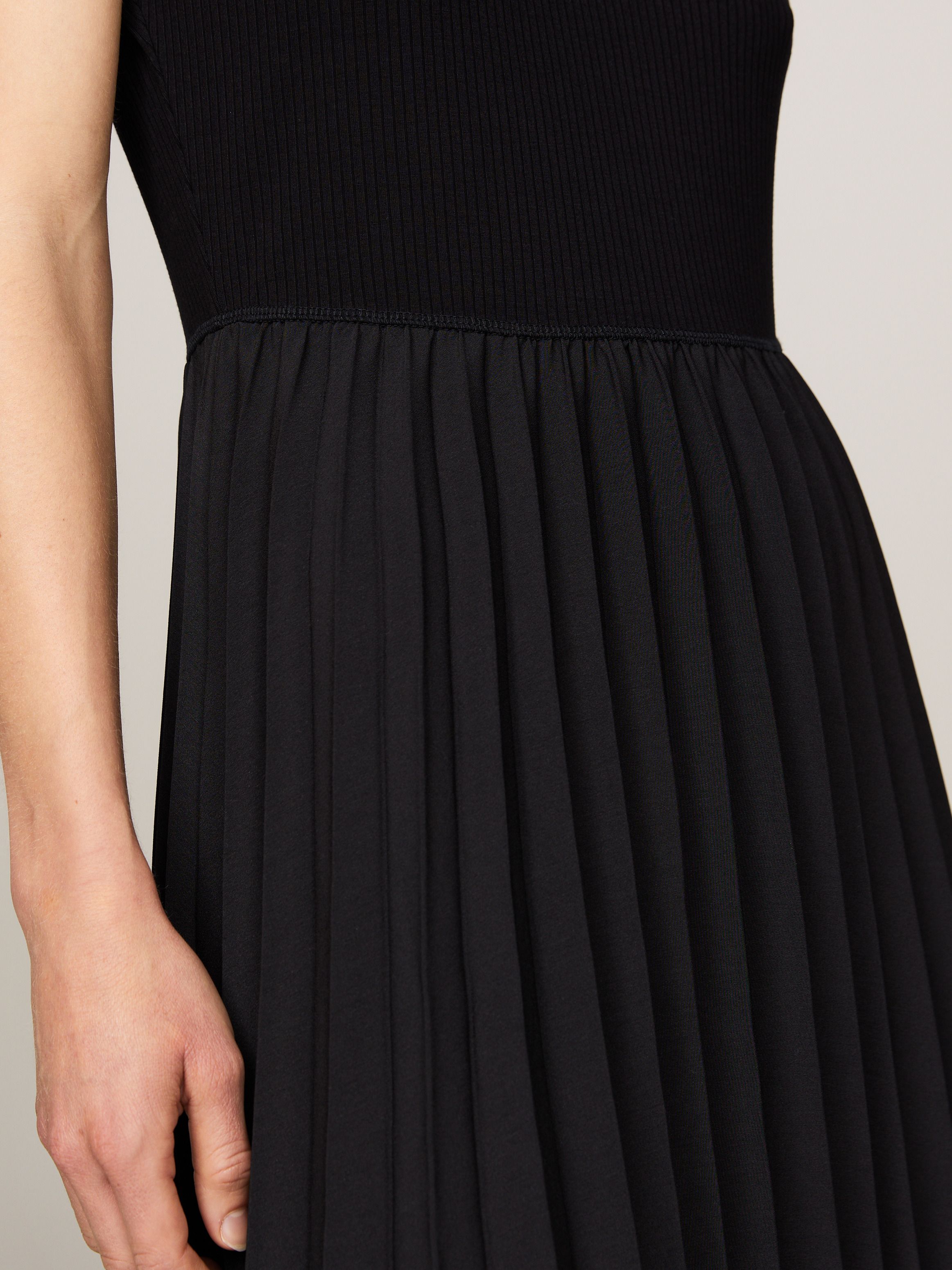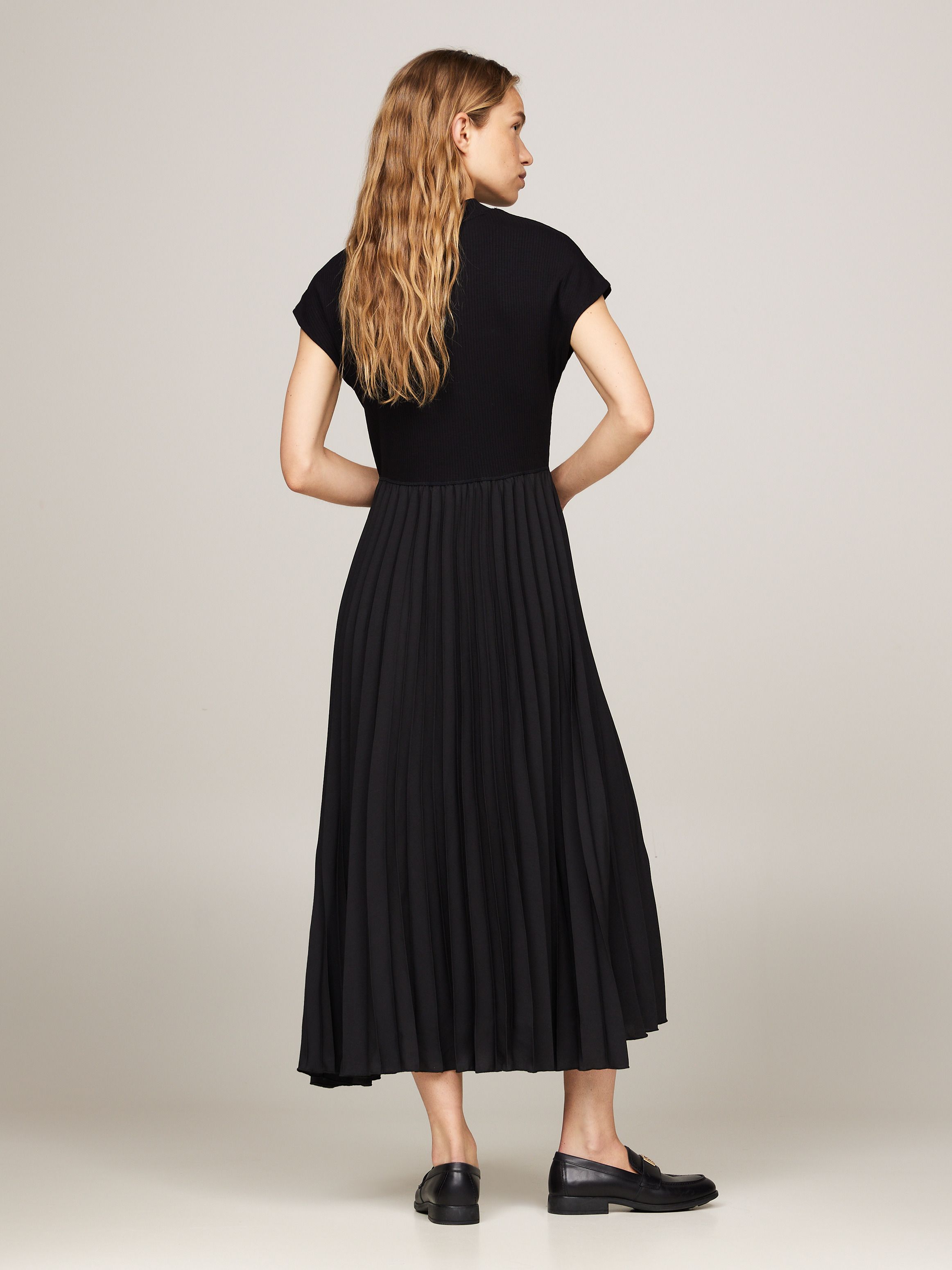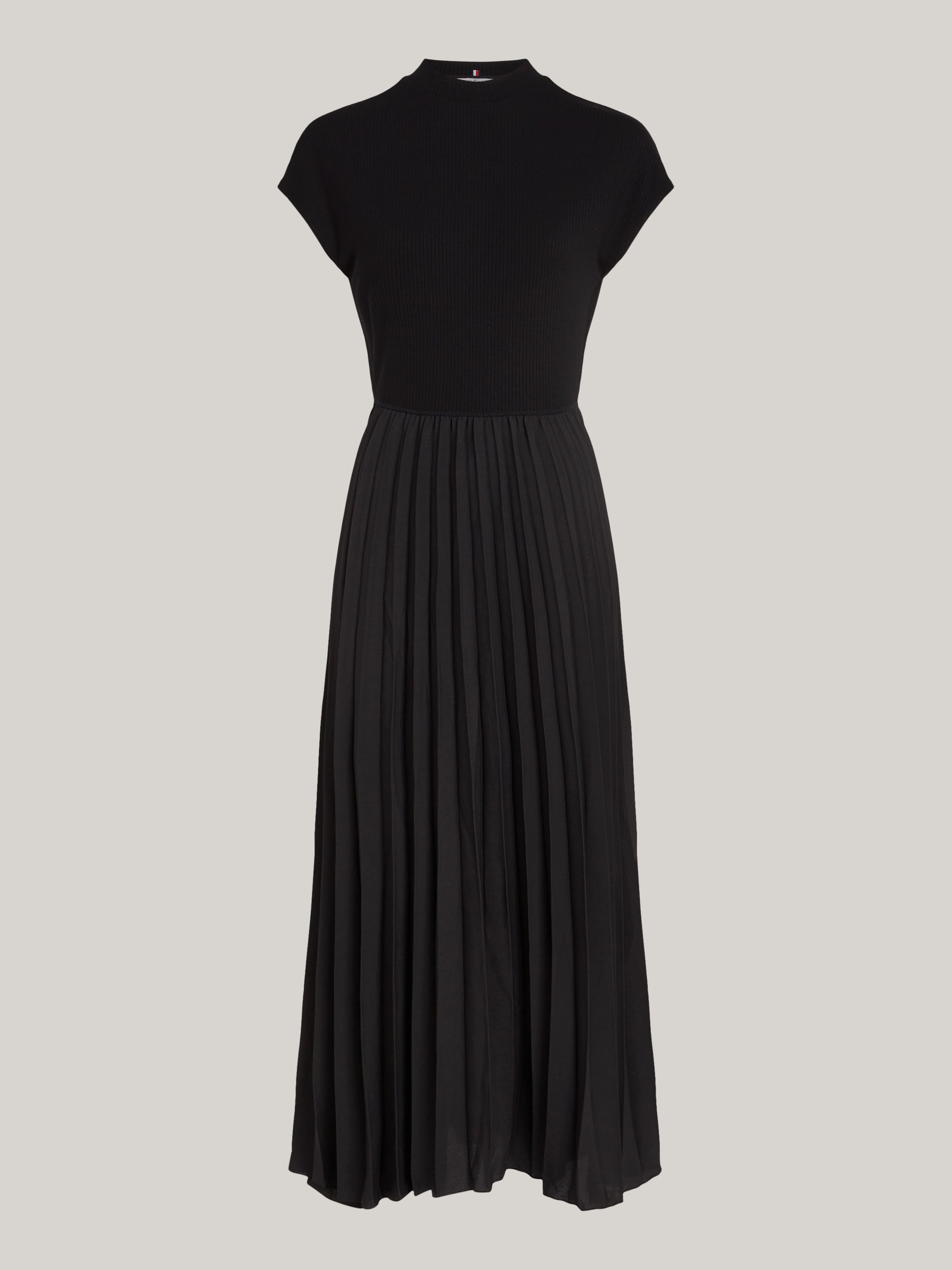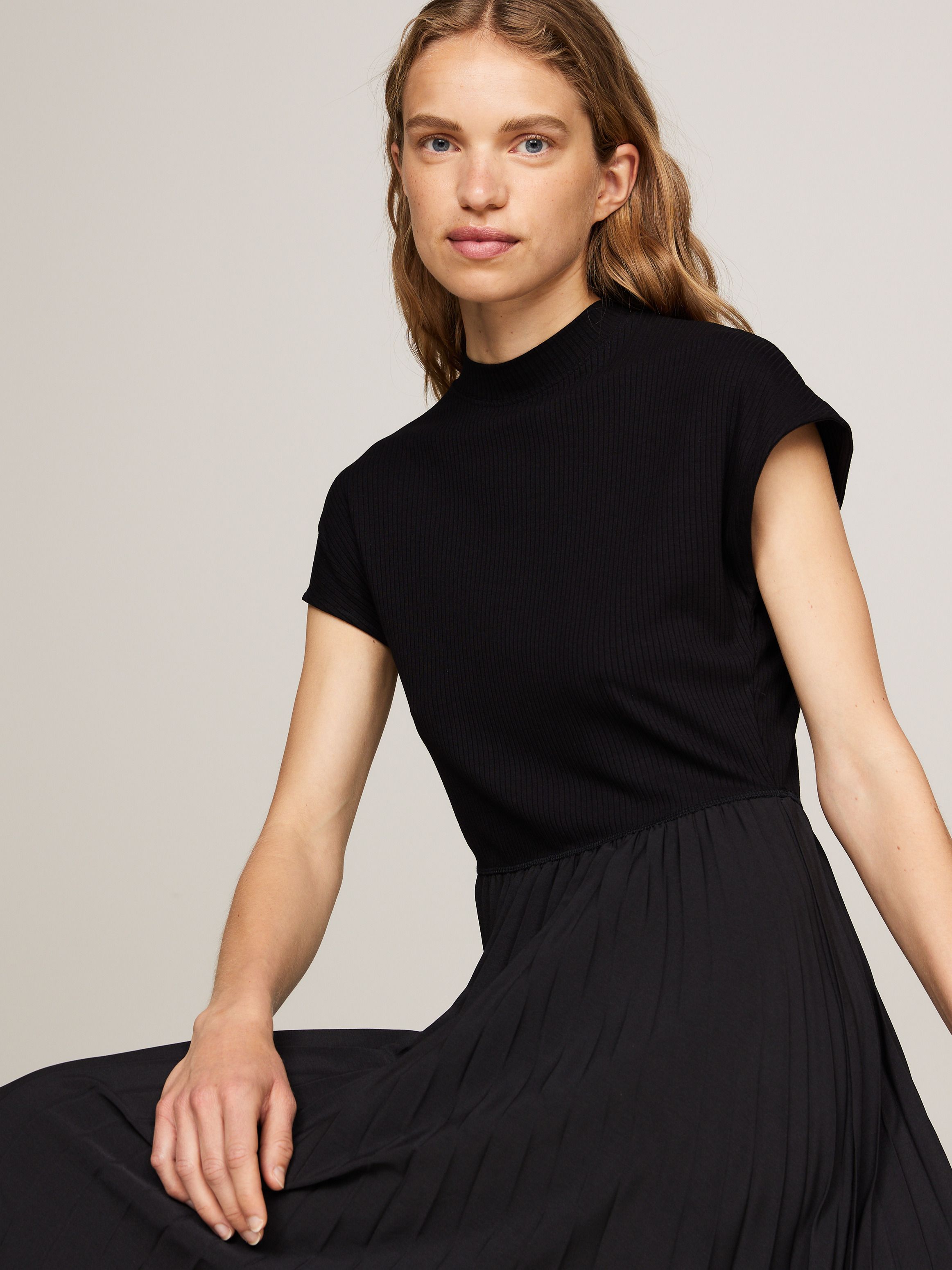 Elevate smart-casual looks with this flattering fit-and-flare dress, featuring a chic mock turtleneck and a flowing pleated skirt.