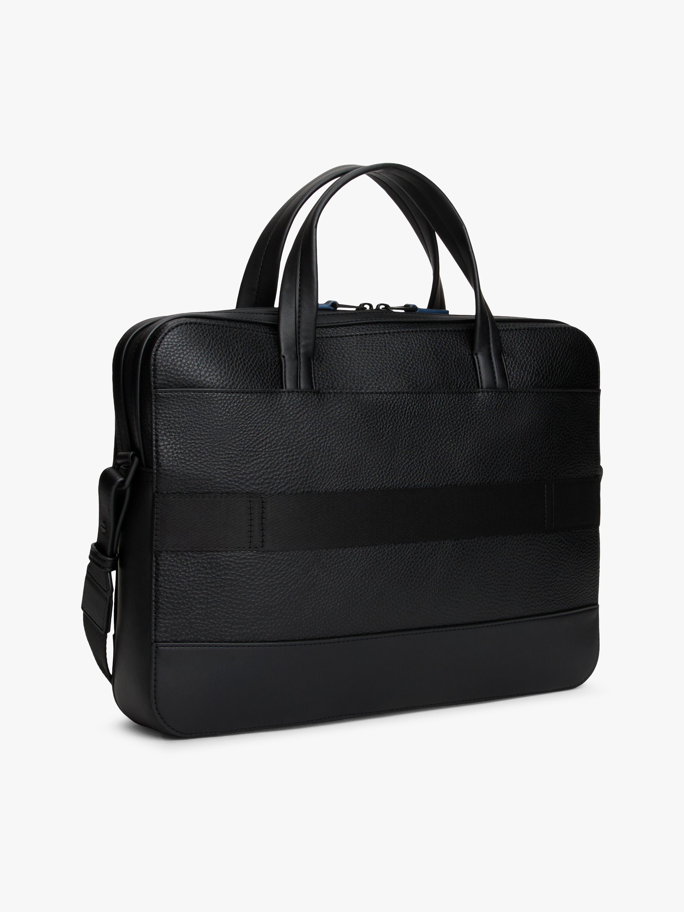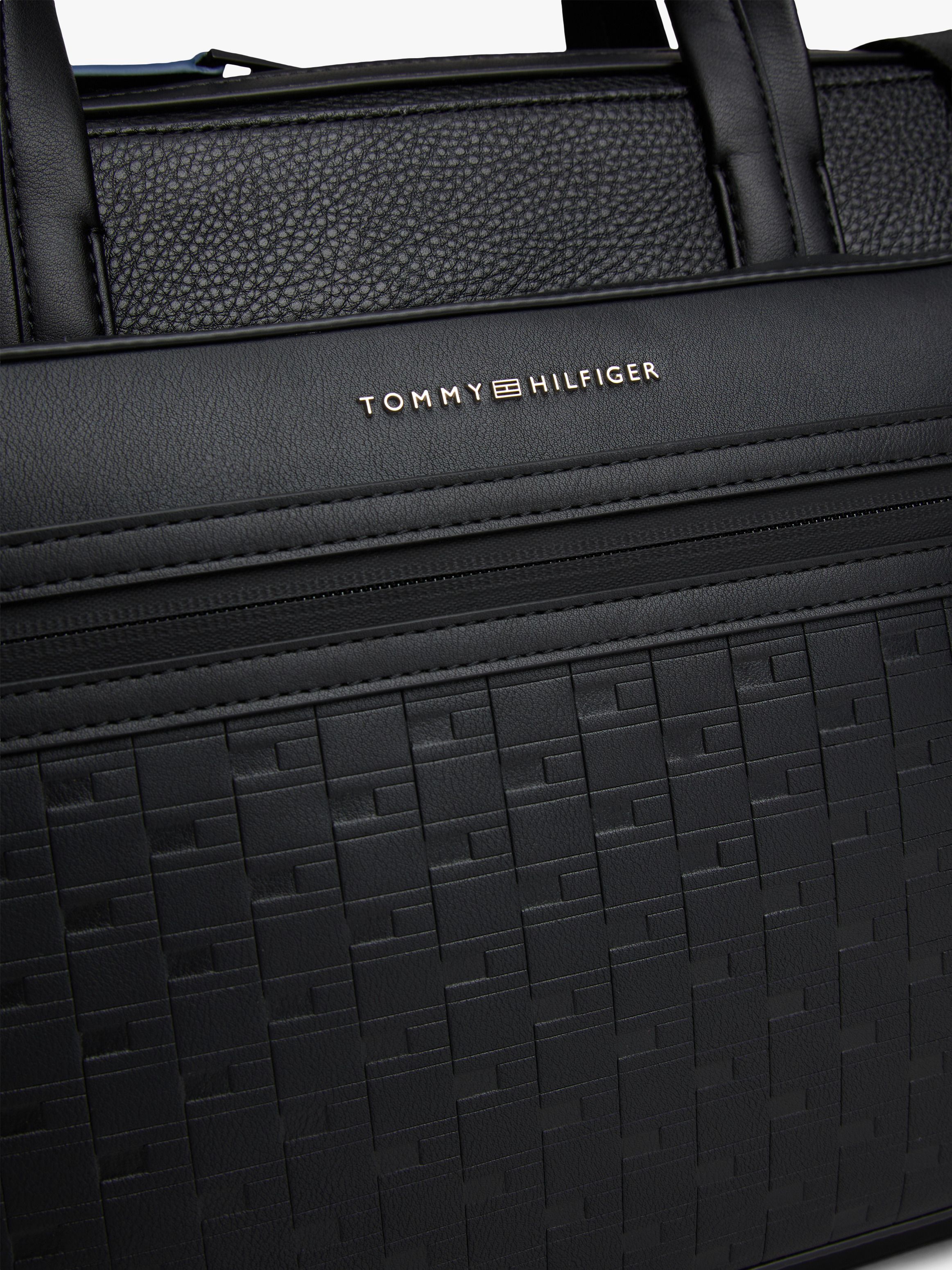 • Mixed texture panels • Built-in laptop sleeve • Double zip closure • Two top handles • Shoulder strap • Trolley strap on back • One main compartment • One exterior zipped pocket • D-ring hook • Tommy Hilfiger repeat flag design debossed on pocket • Tommy Hilfiger metal logo on pocket • Tommy Hilfiger branding