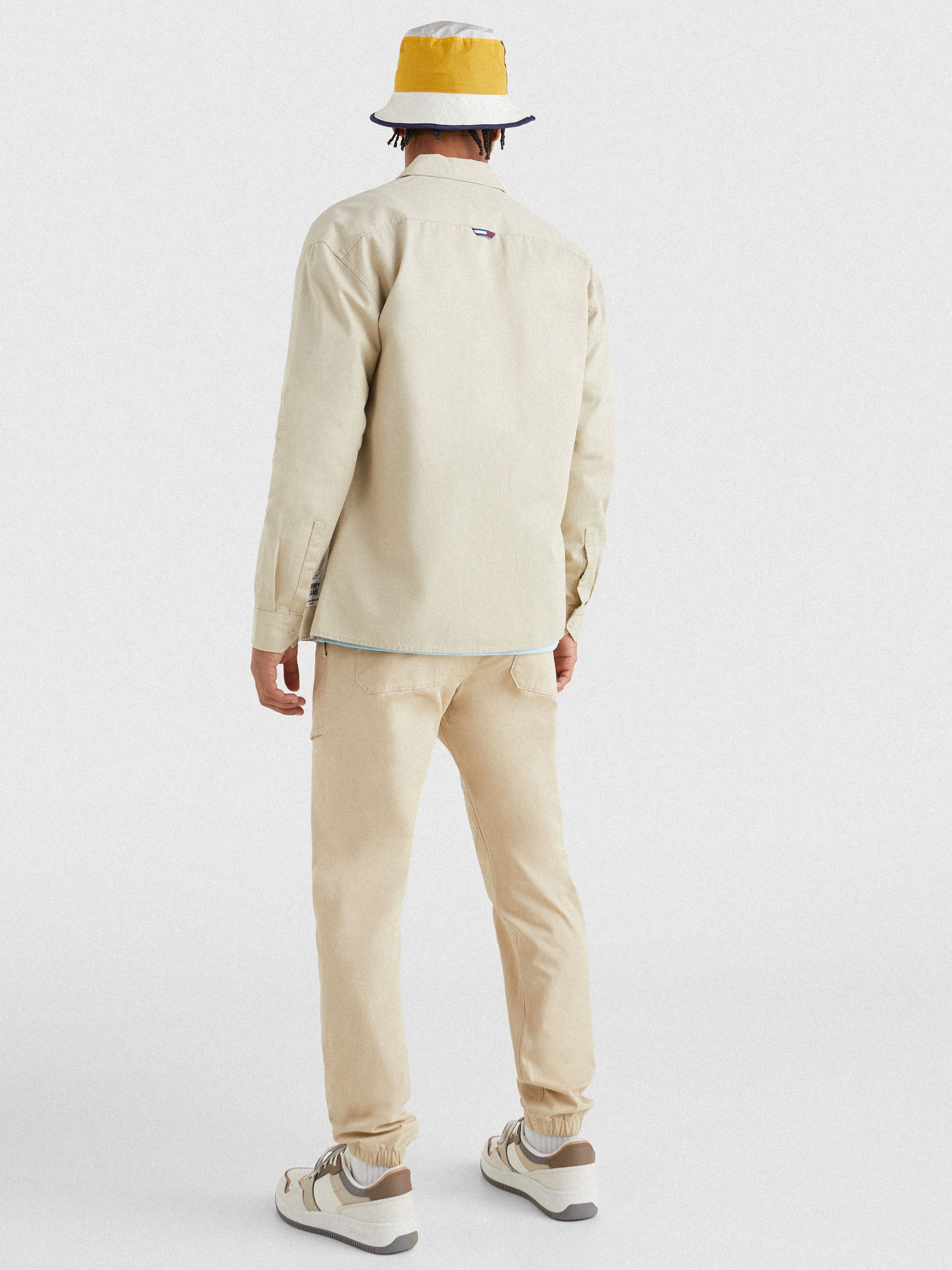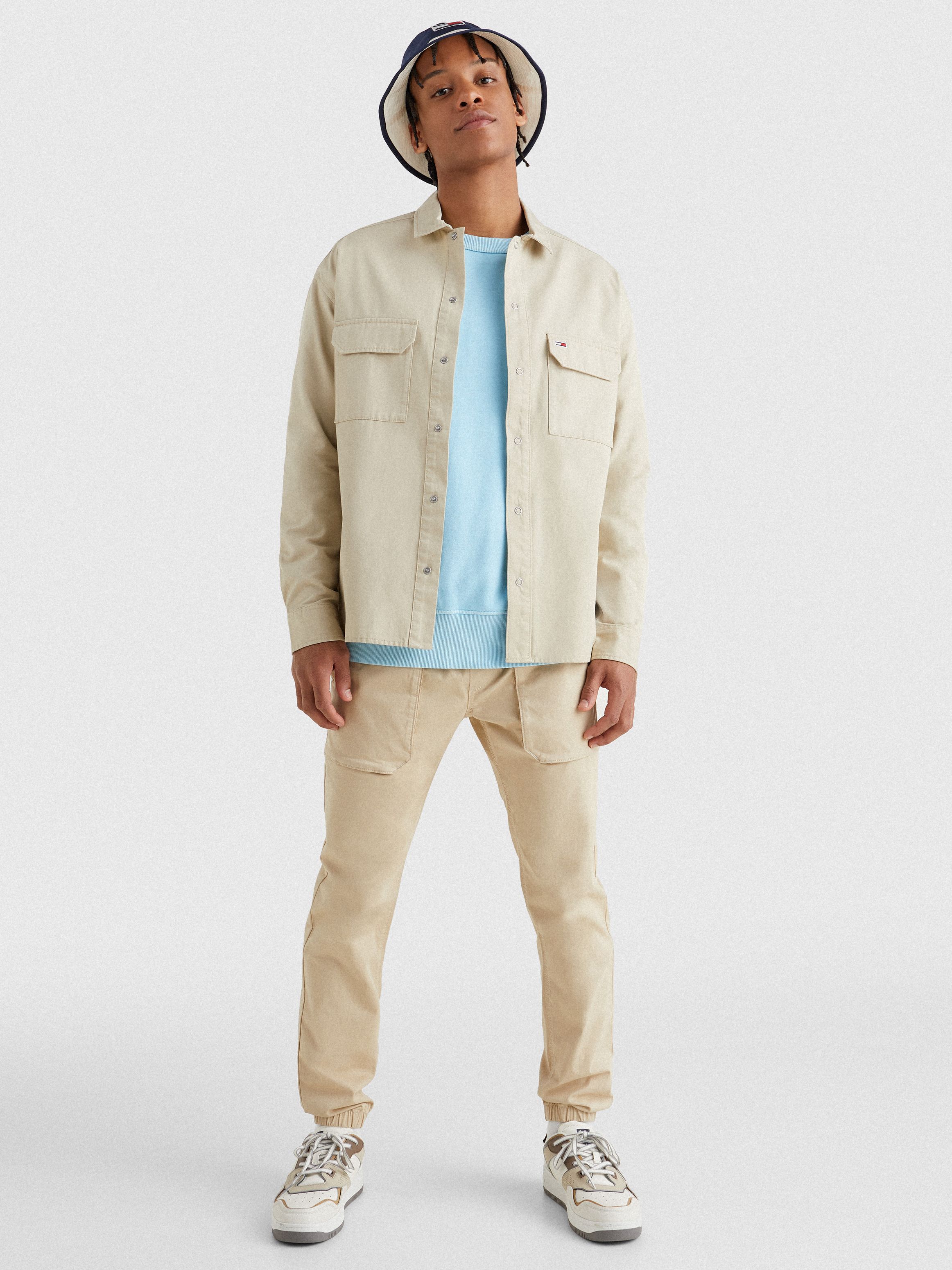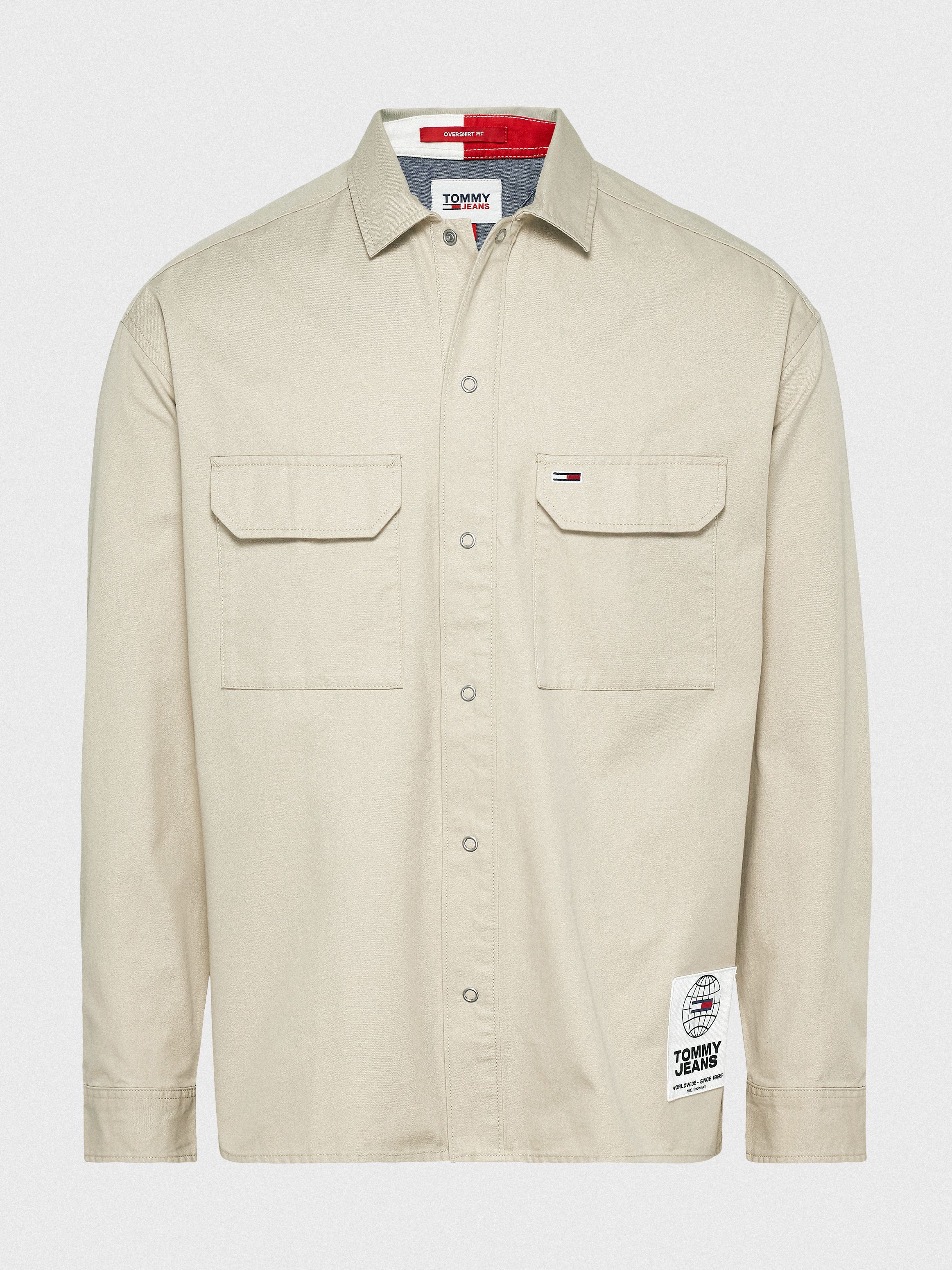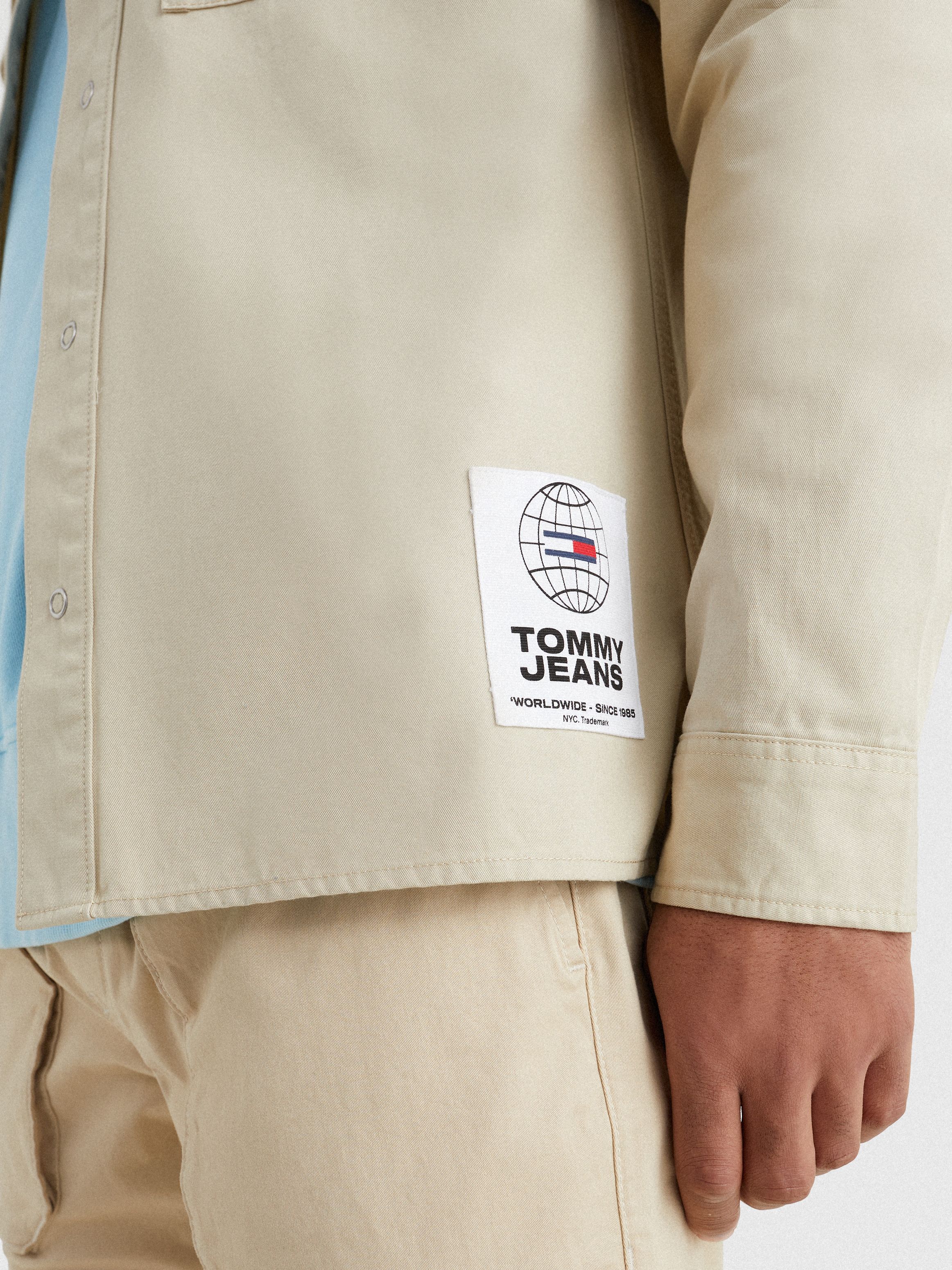 • Pure organic cotton twill • Semi-spread collar • Snap-button cuffs • Two chest flap pockets • Tommy Jeans logo patch on front • Tommy Jeans branding • Tommy Jeans flag patch on chest