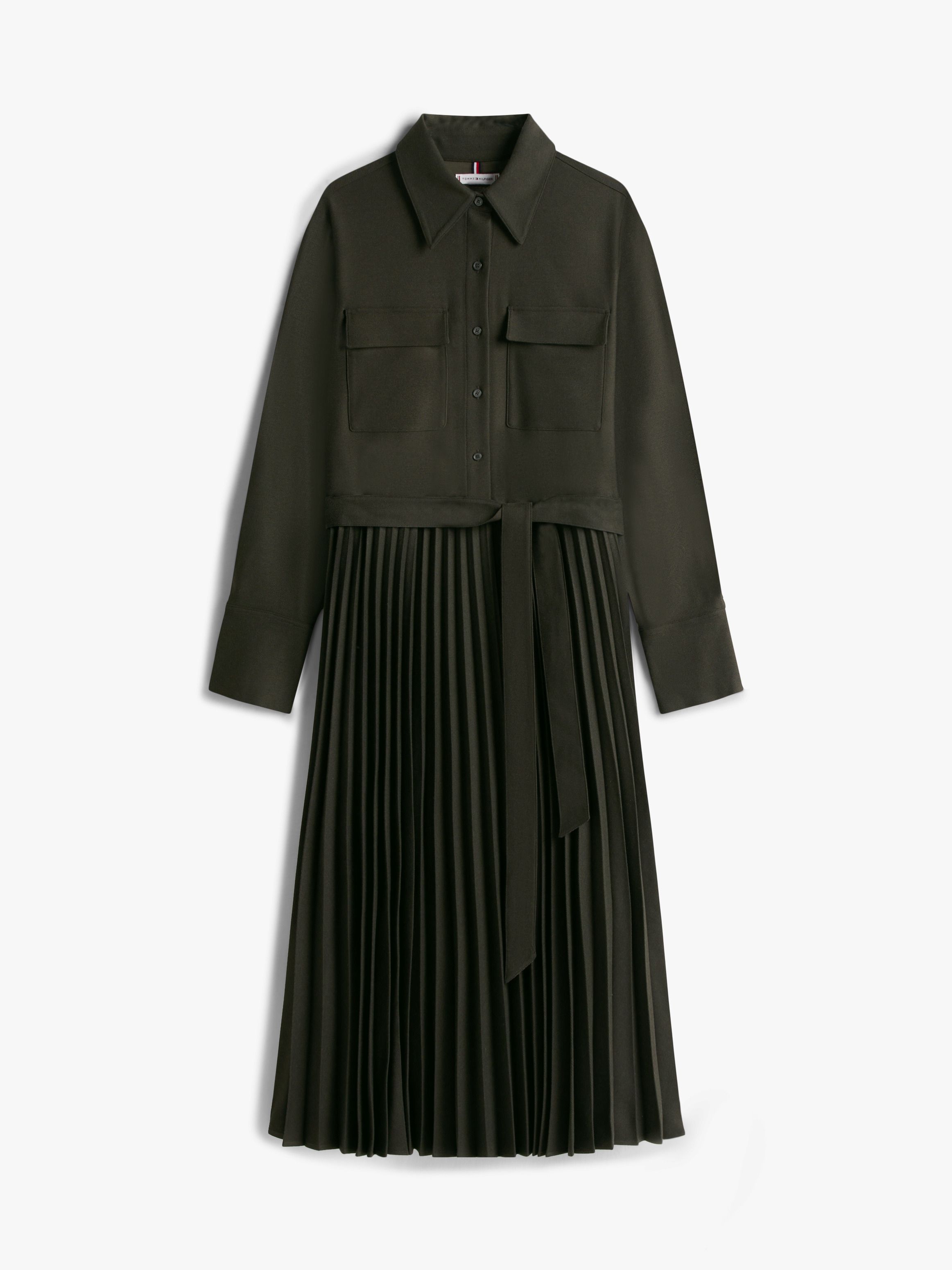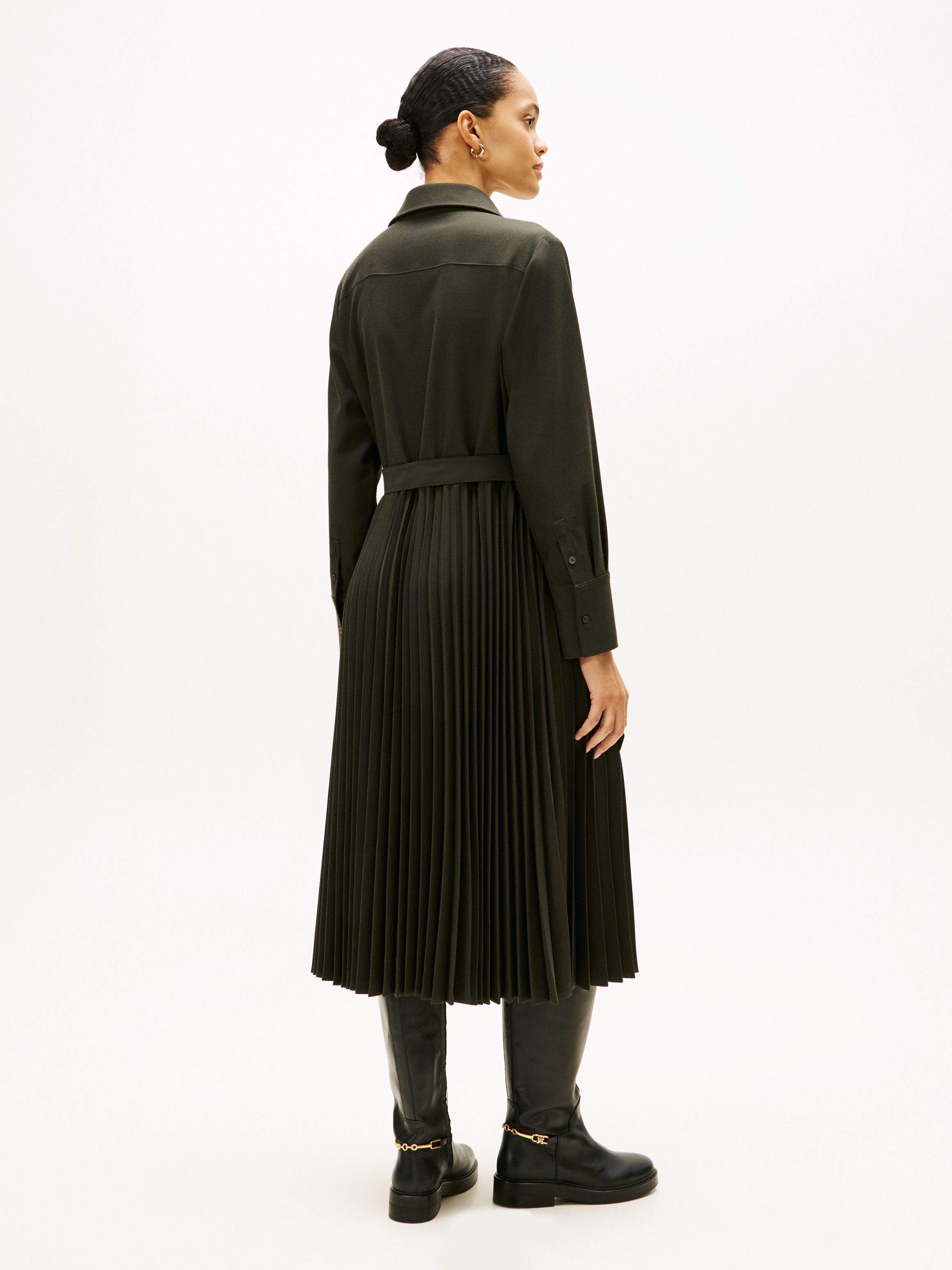 Utility design and feminine style combine in this flattering shirt dress with all-over pleating on the midi-length skirt to add graceful movement.