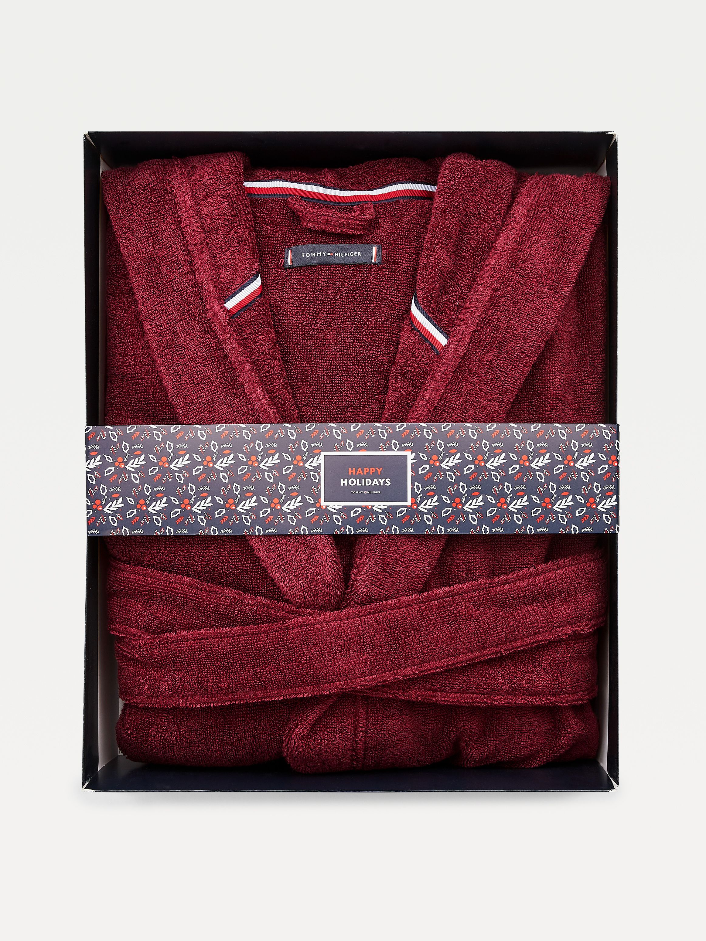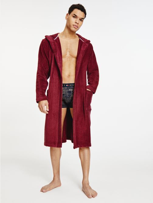 • Pure cotton towelling • Fixed hood • Self-tie belt at waist • Two front patch pockets • Tommy Hilfiger logo embroidery on hood • Tommy Hilfiger branding • Tommy Hilfiger flag embroidery on chest