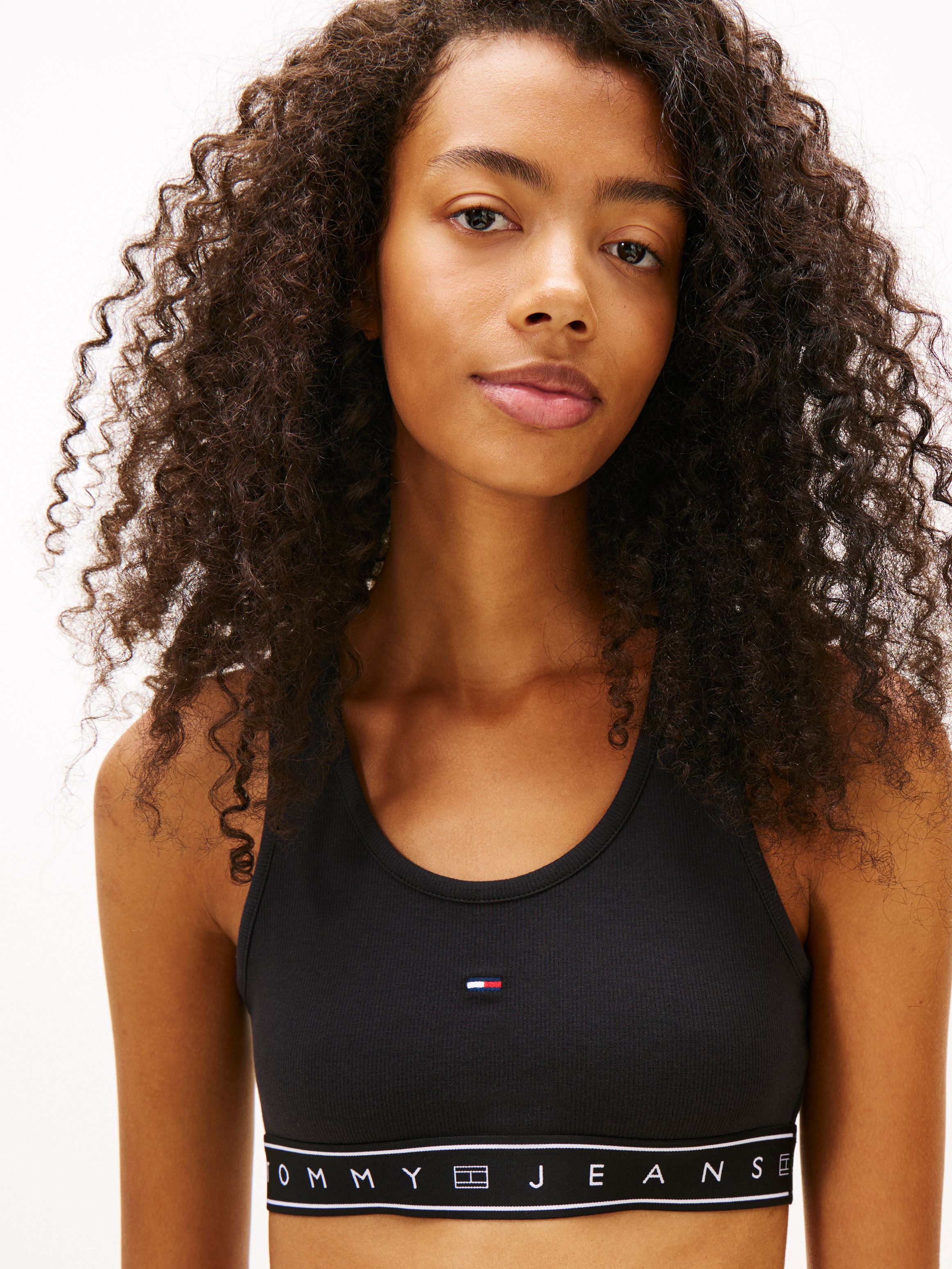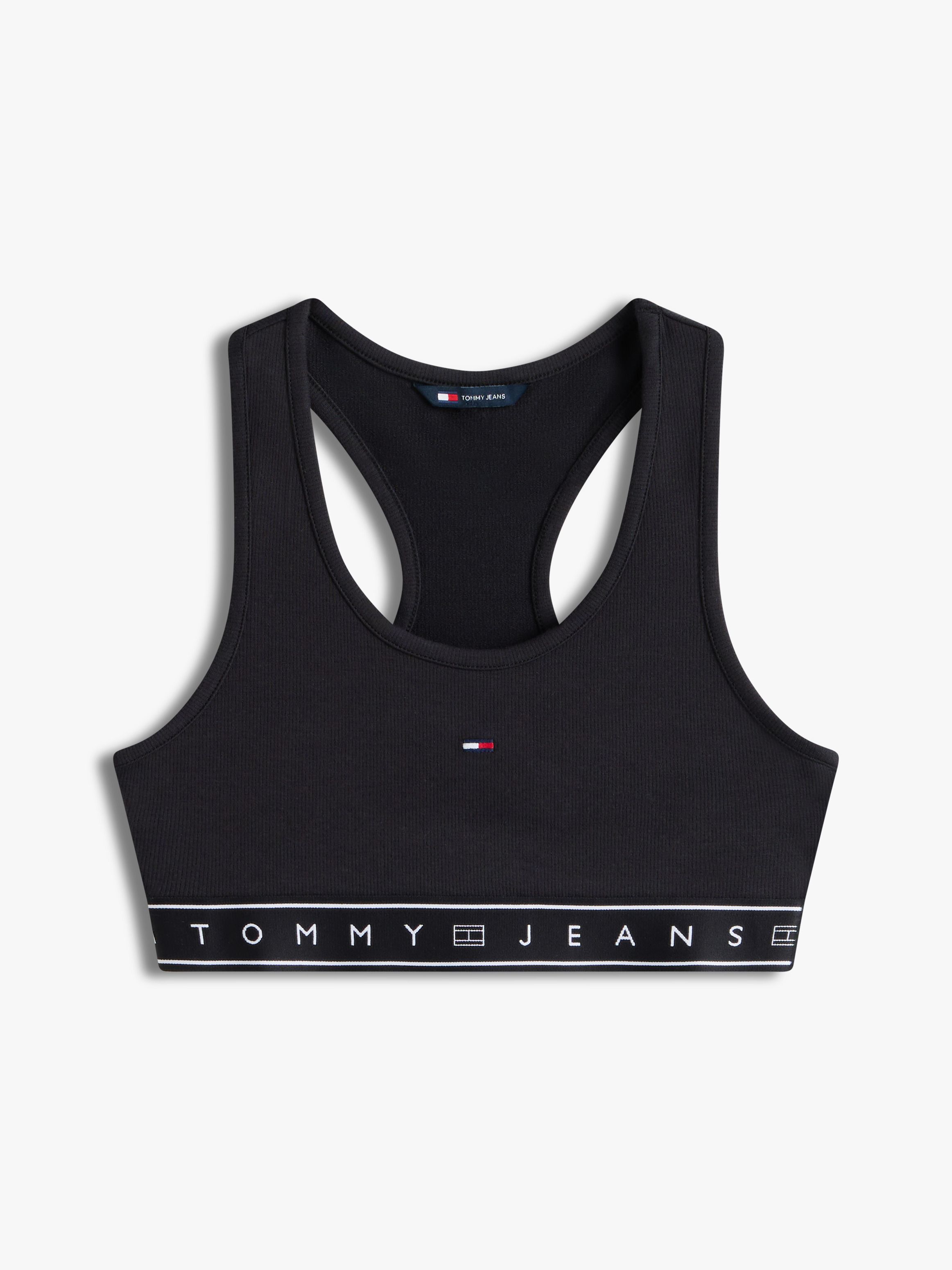 • Stretch cotton blend terry • Ribbed texture • Scoop neck • Racerback • Tommy Jeans repeat logo tape elasticated underband • Tommy Jeans branding • Tommy flag embroidery on chest