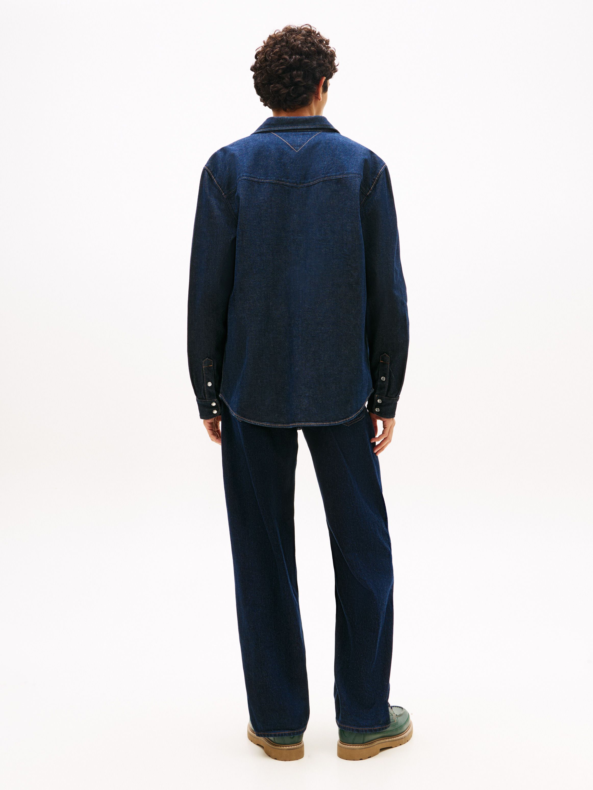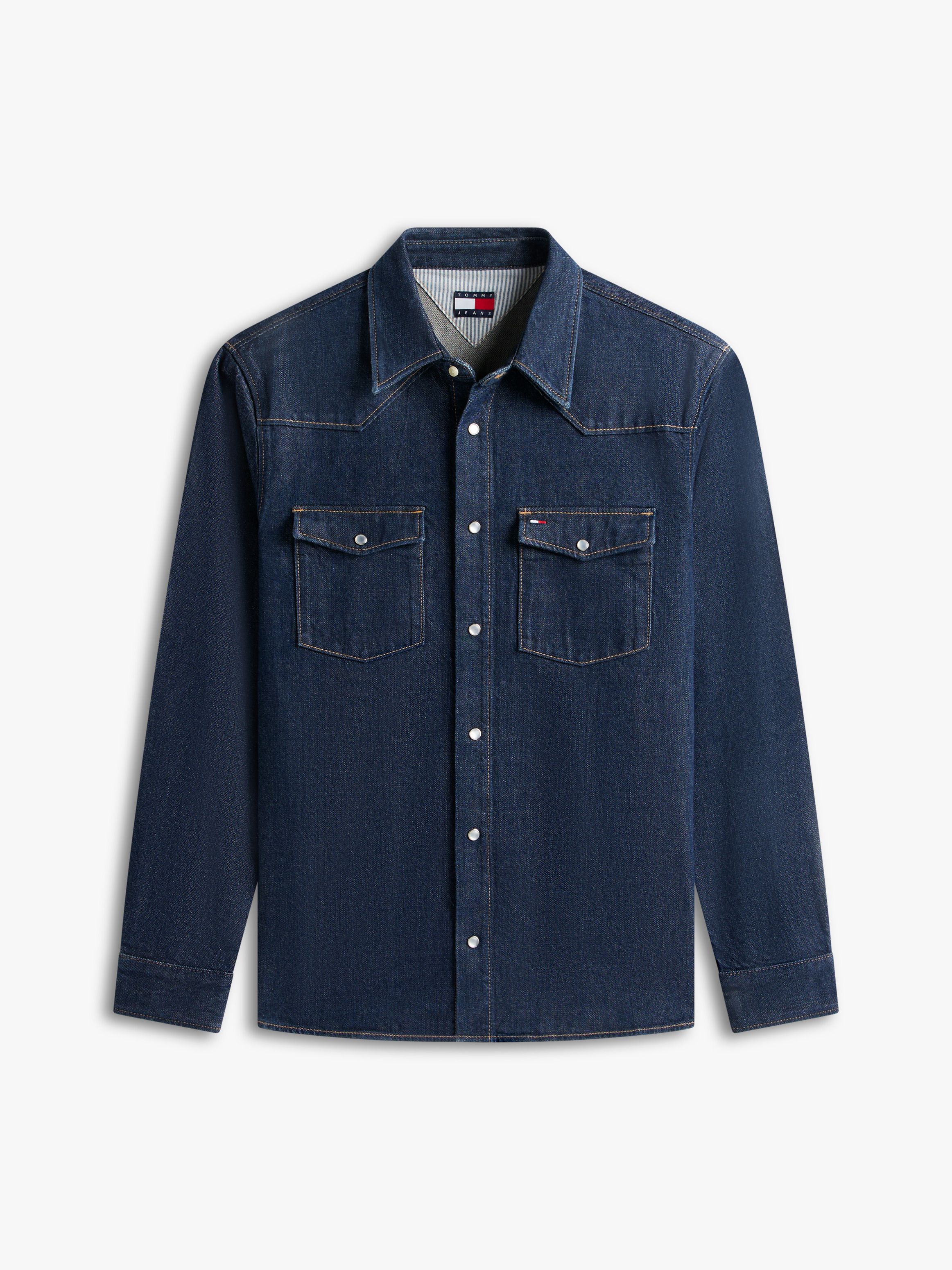 • Western denim • Pearled buttons • Contrast topstitching • Snap-button closure • Two chest snap-button envelope pockets • Rounded two-button cuffs • Rounded hem • Tommy Jeans branding • Tommy flag embroidery on pocket