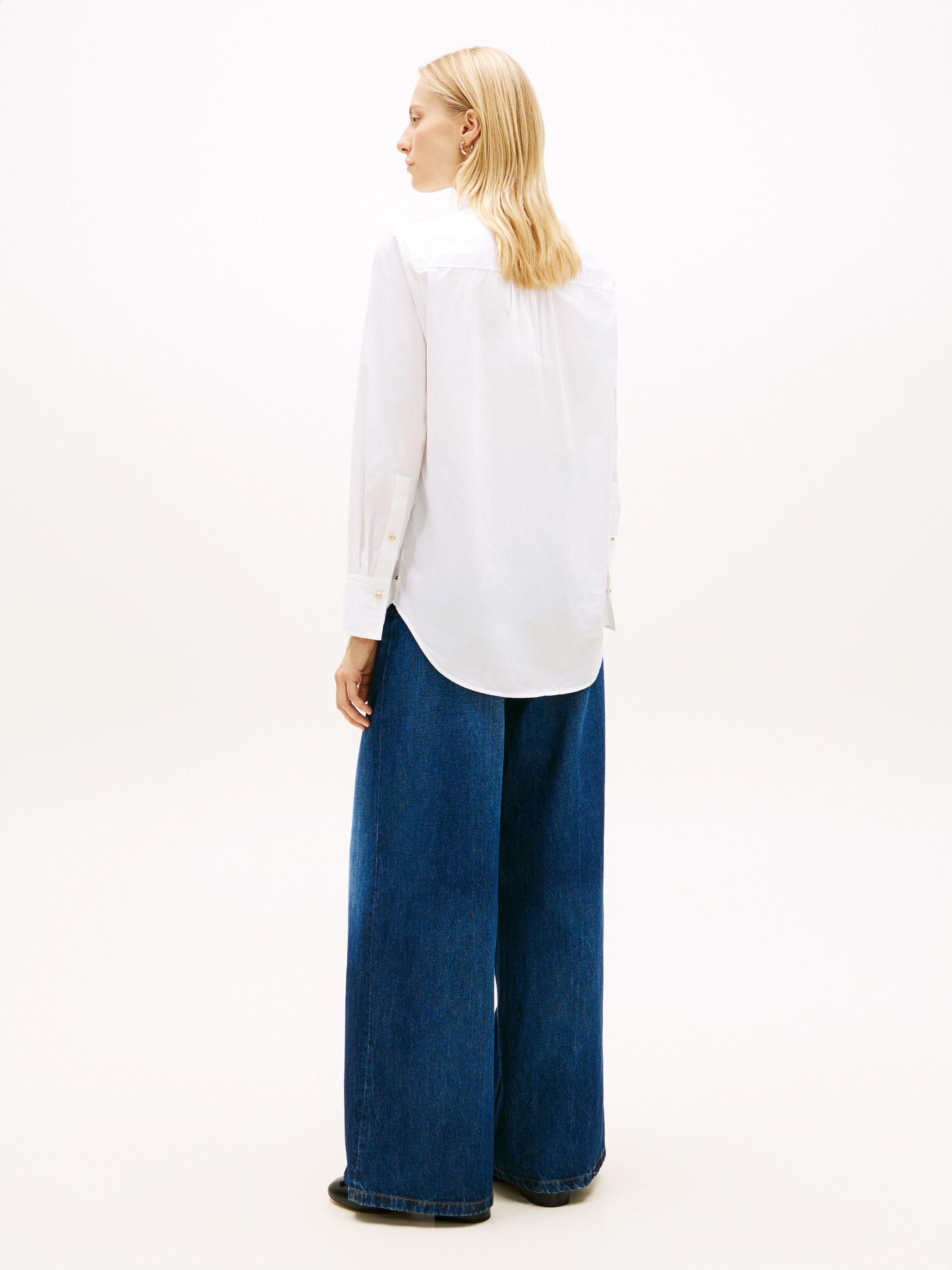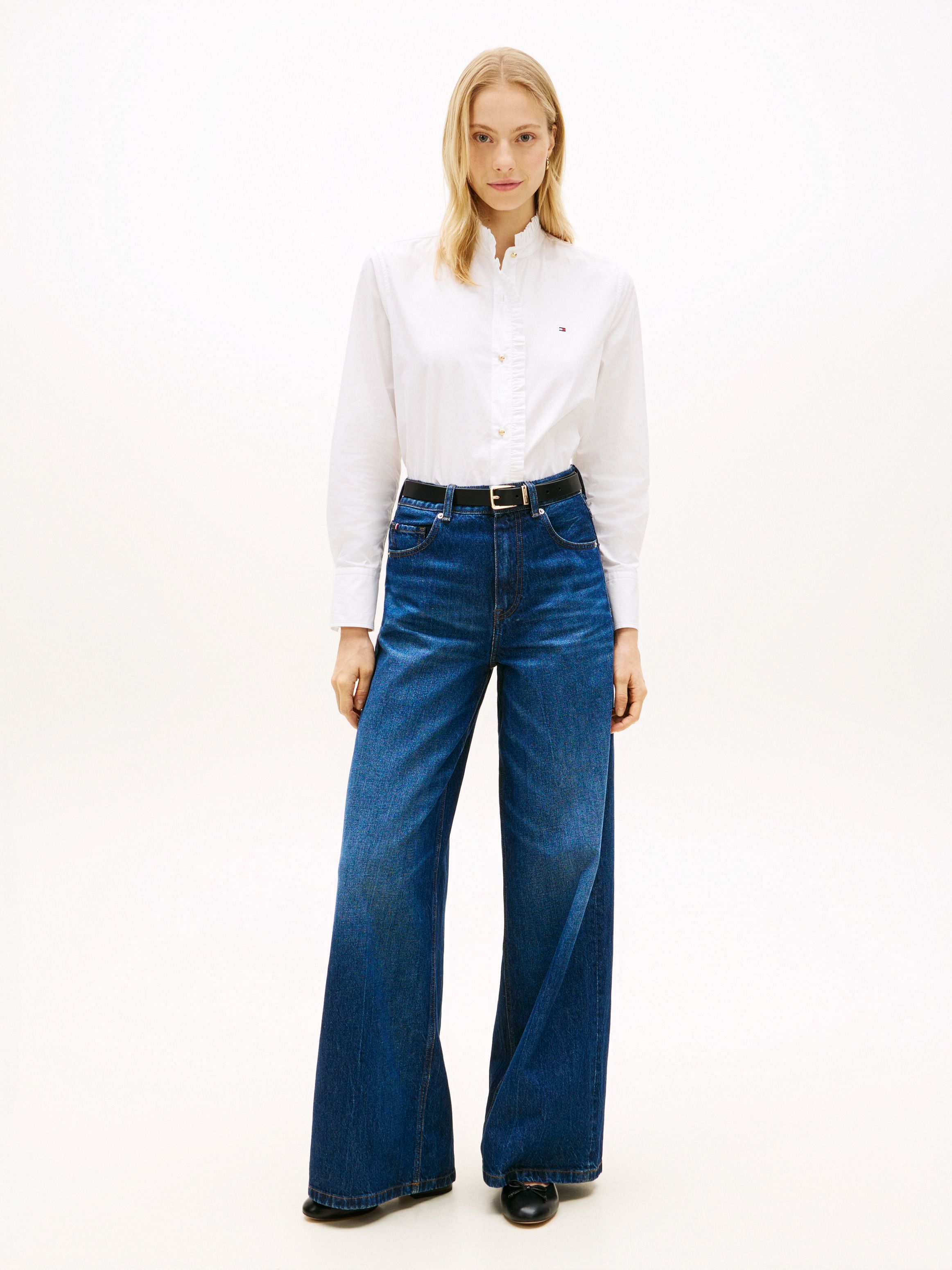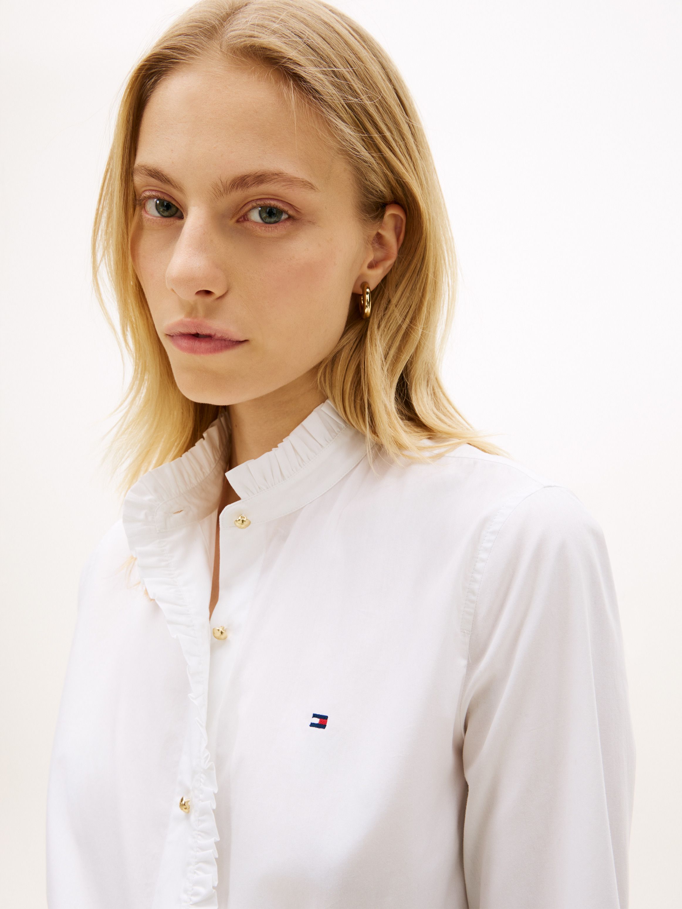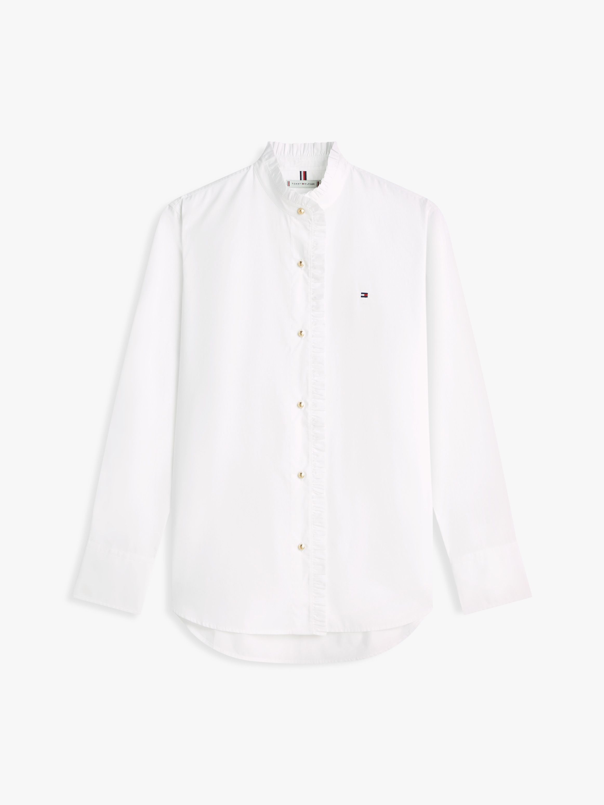 • Pure cotton poplin • Ruffle detail on collar and placket • Gold-tone buttons • Cuffed sleeves • Shirttail hem • Signature tape inside neckline • Tommy Hilfiger branding • Tommy Hilfiger flag embroidery on chest