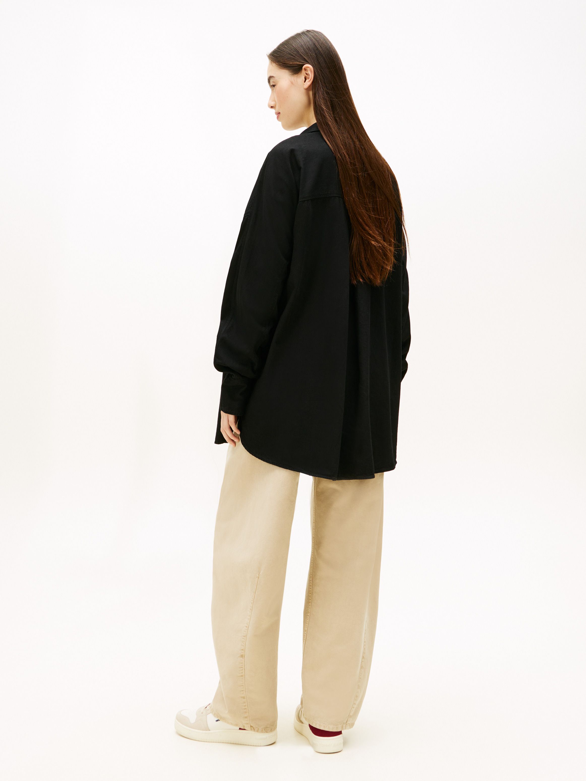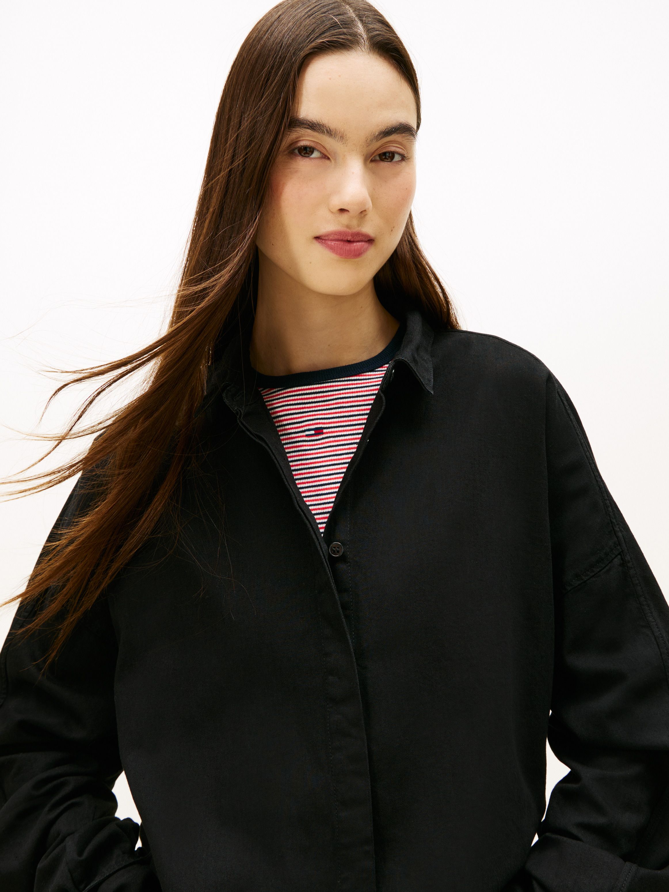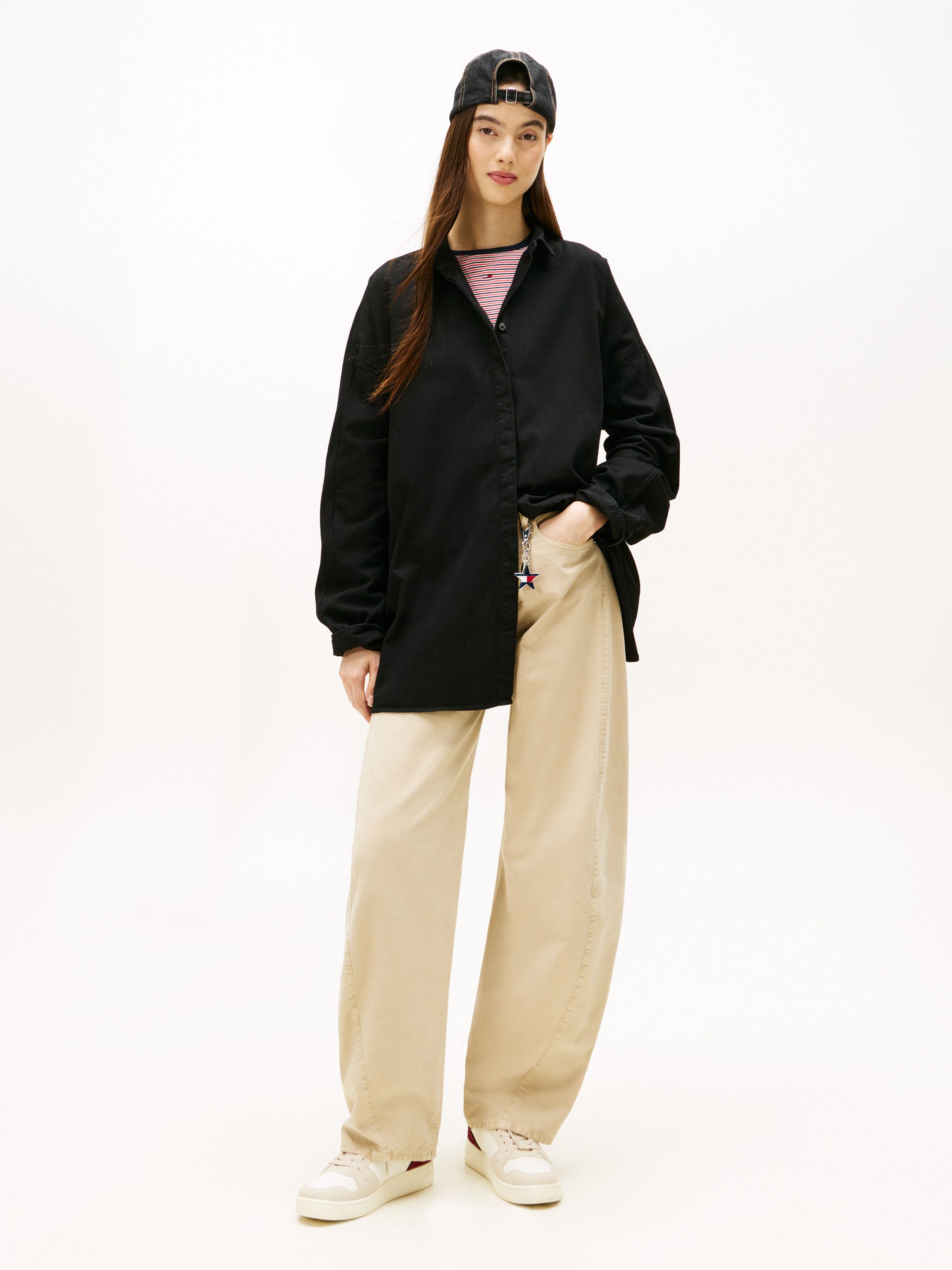 A relaxed fit with a back box pleat and shirttail hem brings volume and movement to this rigid denim shirt.