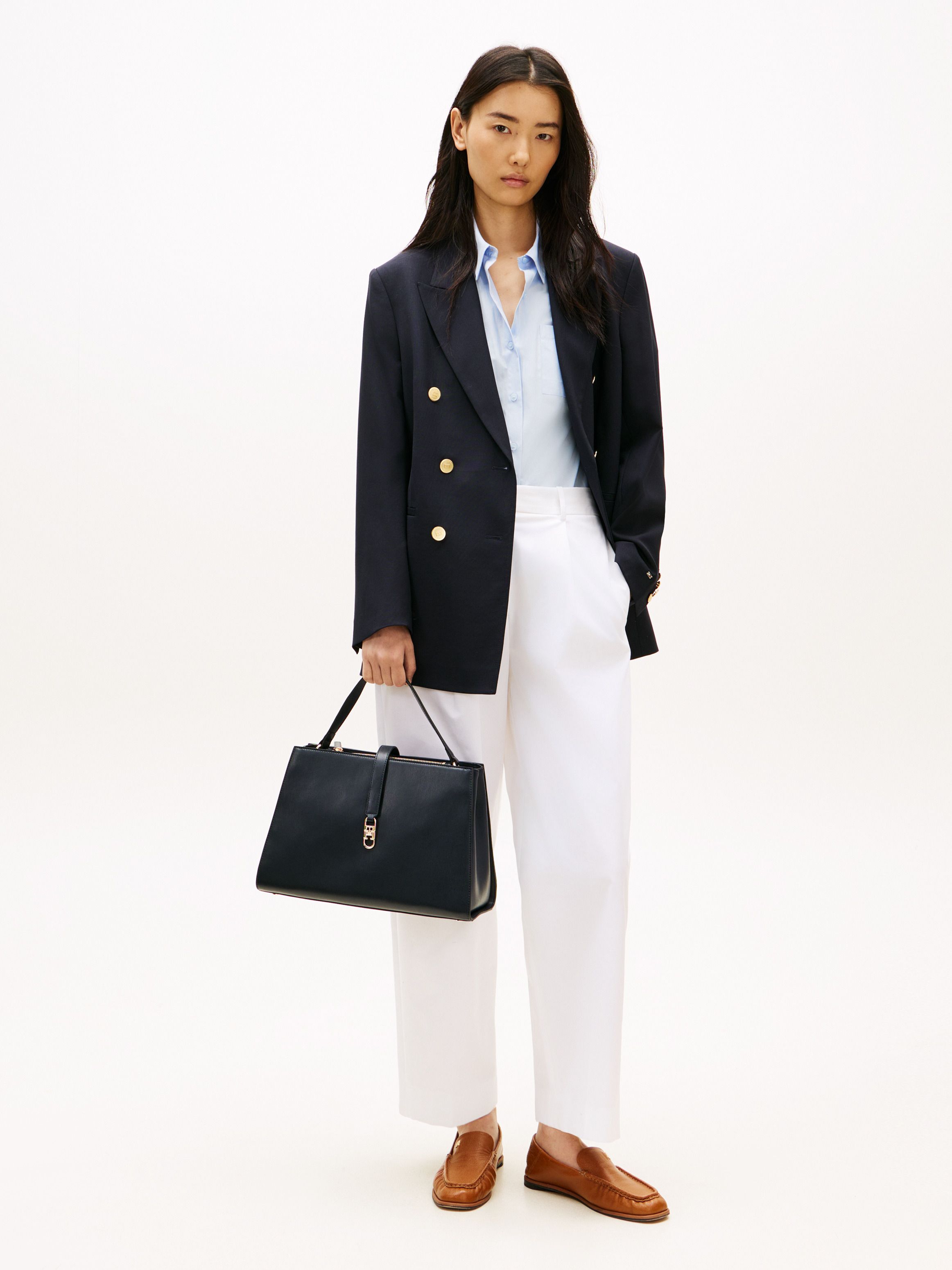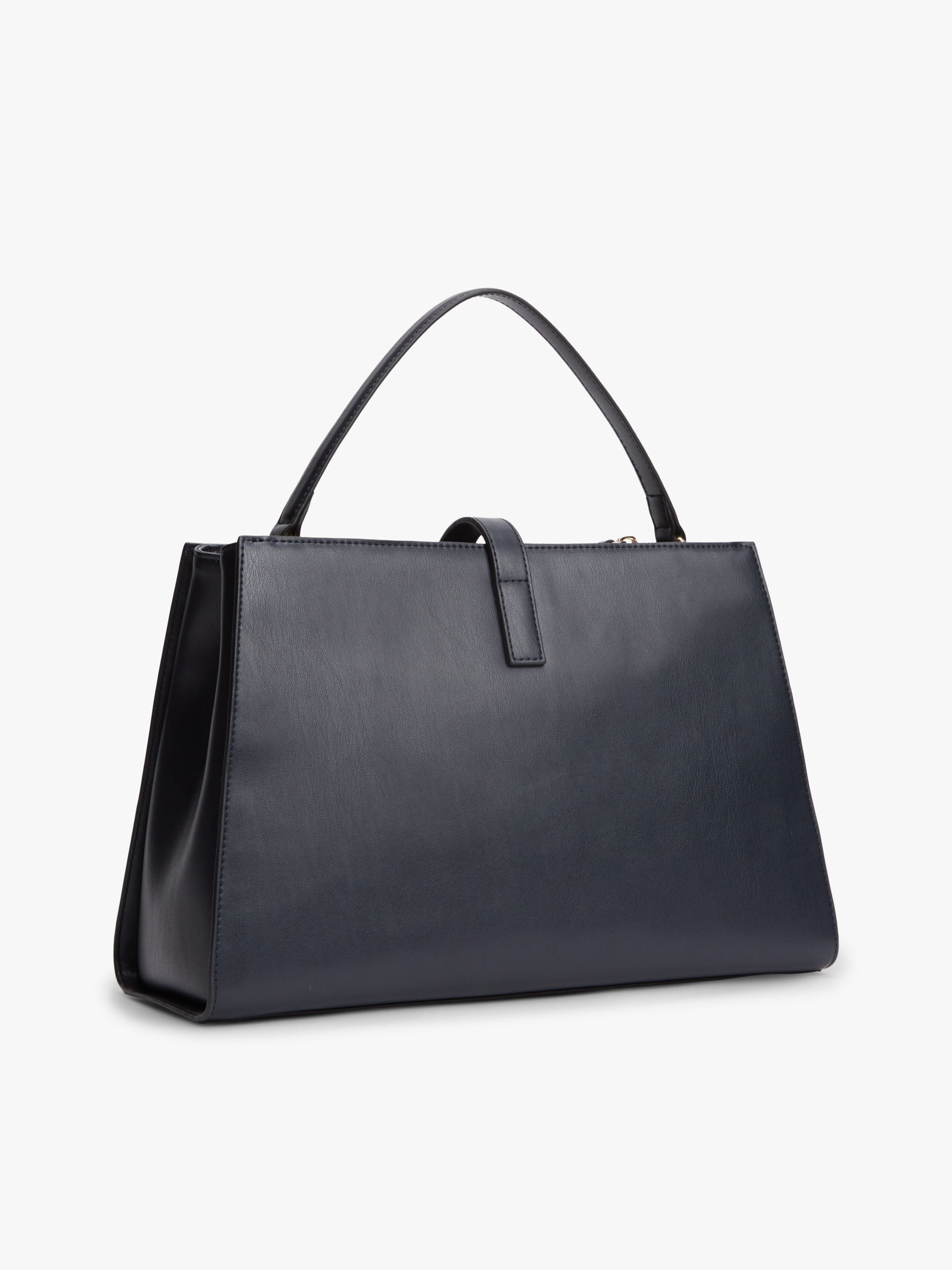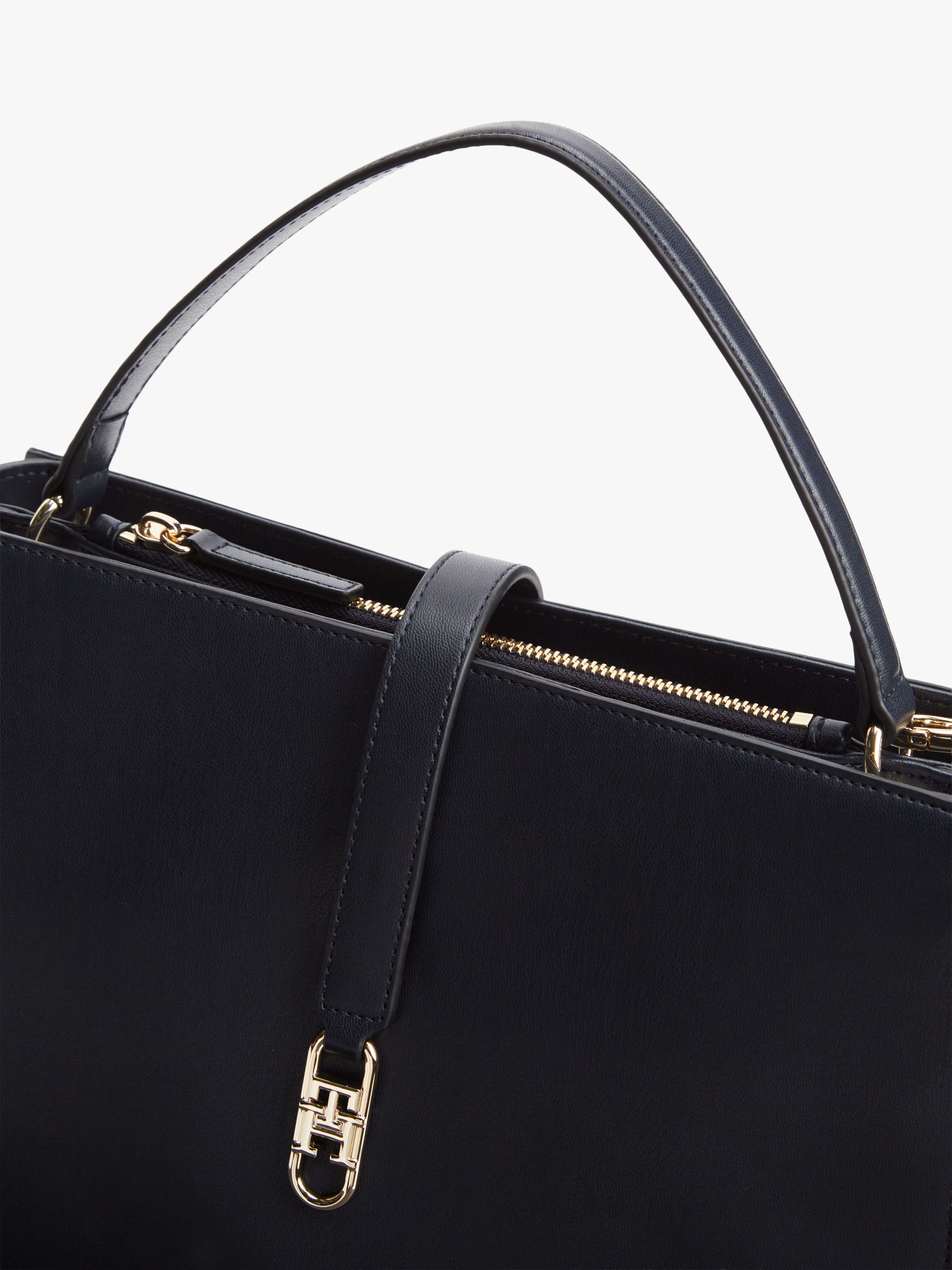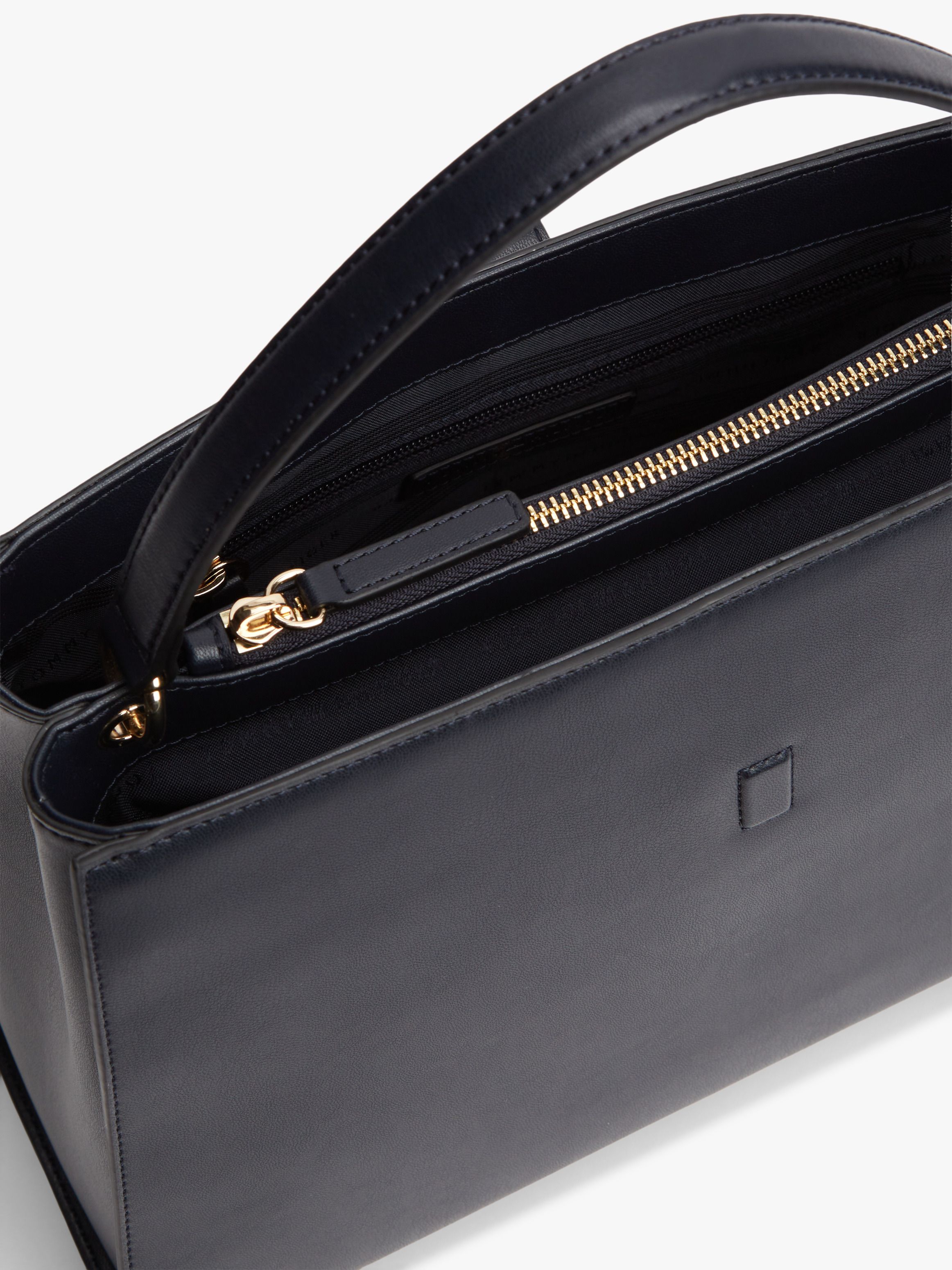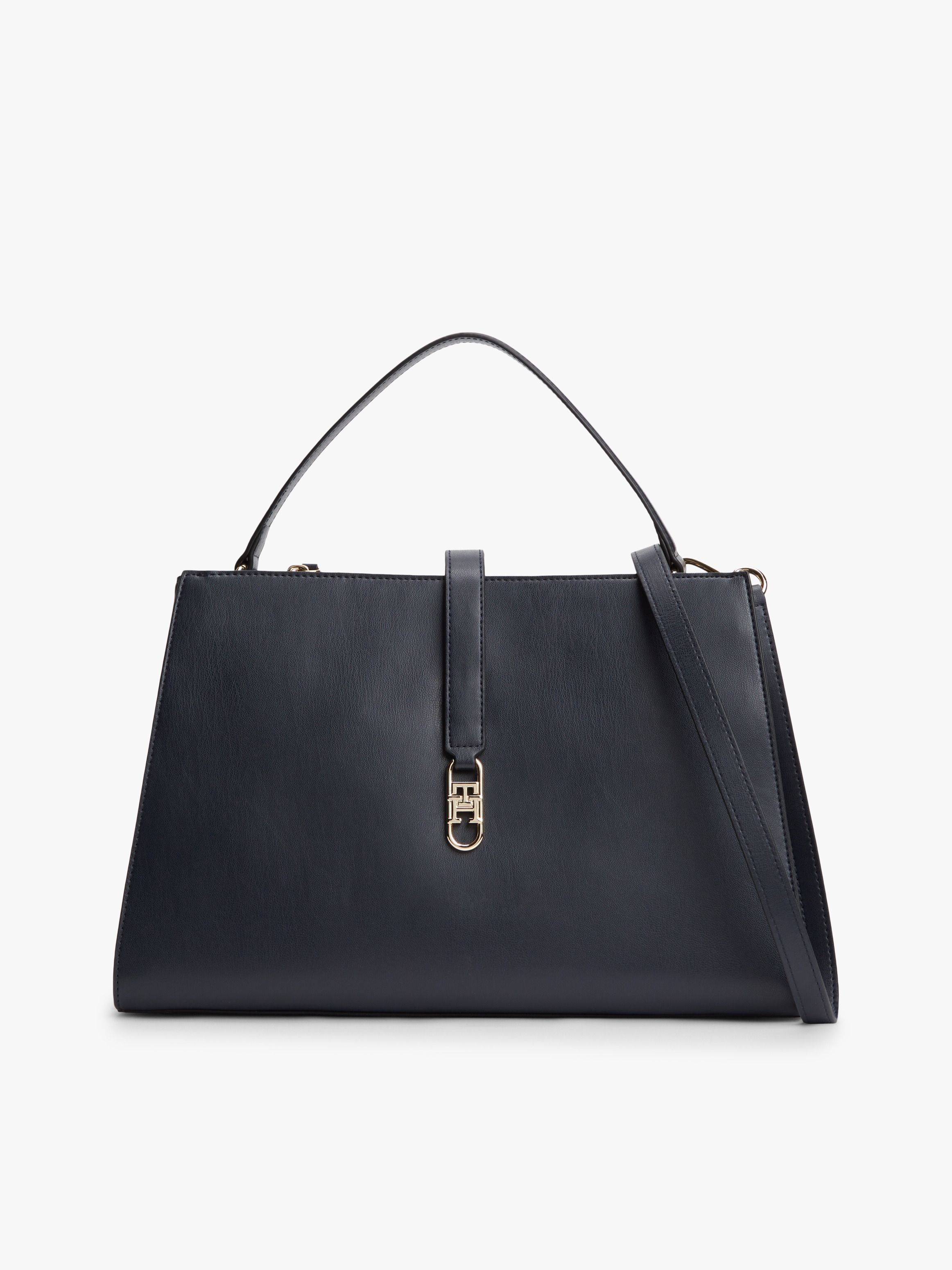 • Smooth finish • Magnetic bridge closure • One top handle • Removable crossbody strap • Two main compartments • One zipped compartment • One interior zipped pocket • TH monogram plaque clasp • Tommy Hilfiger branding