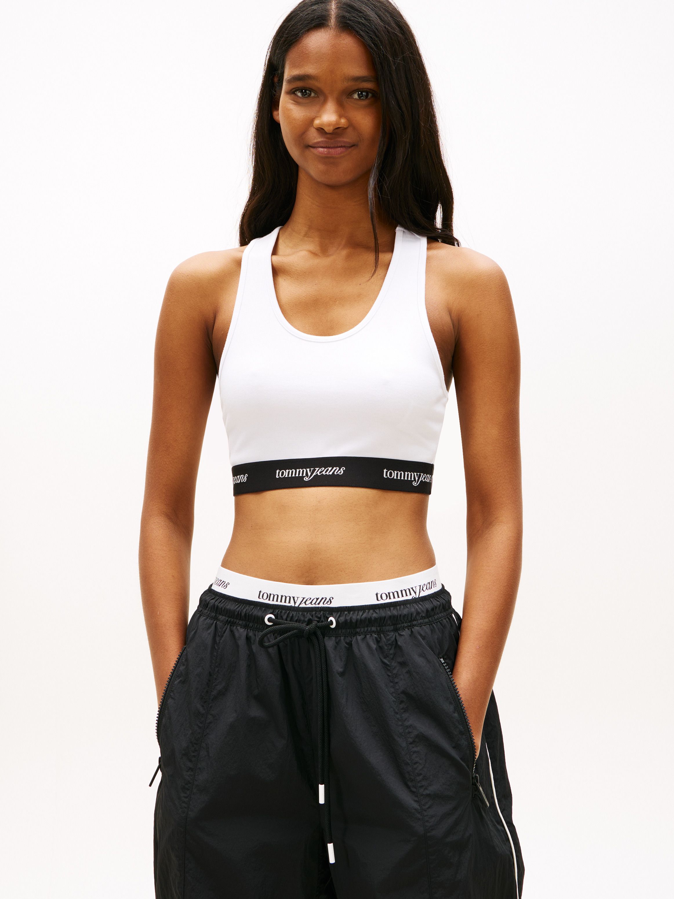 This racerback bra top combines a sporty silhouette with athleisure styling courtesy of the repeat logo taping on the elasticated underband.
