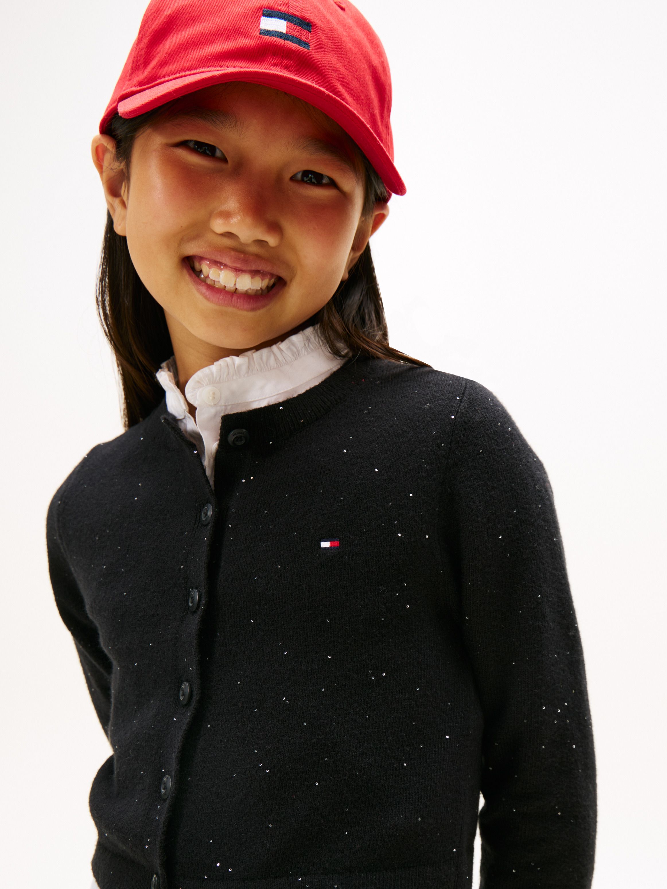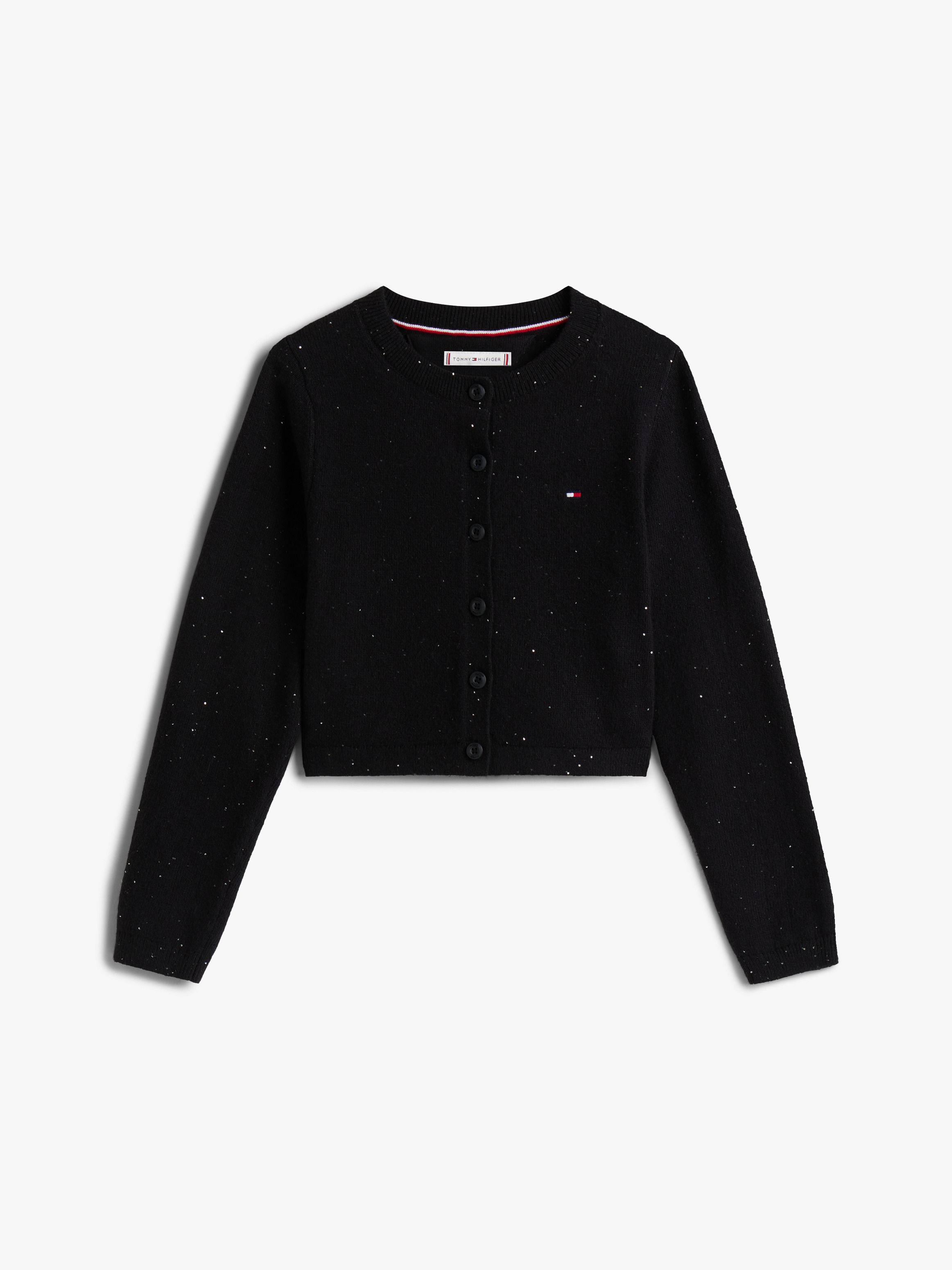 Add extra dazzle to party outfits with this rib-knit cardigan, featuring a crew neck and sparkling sequins.