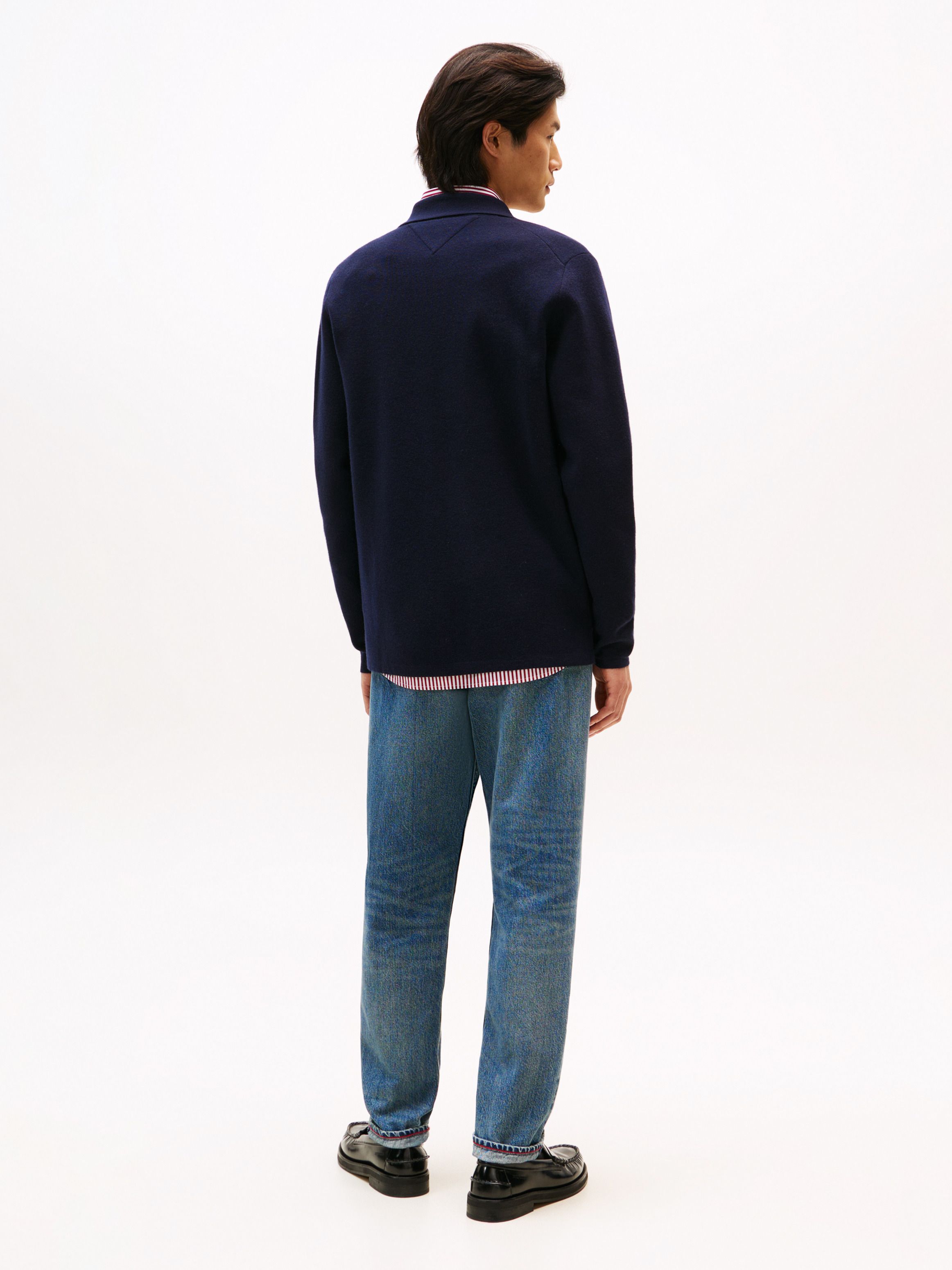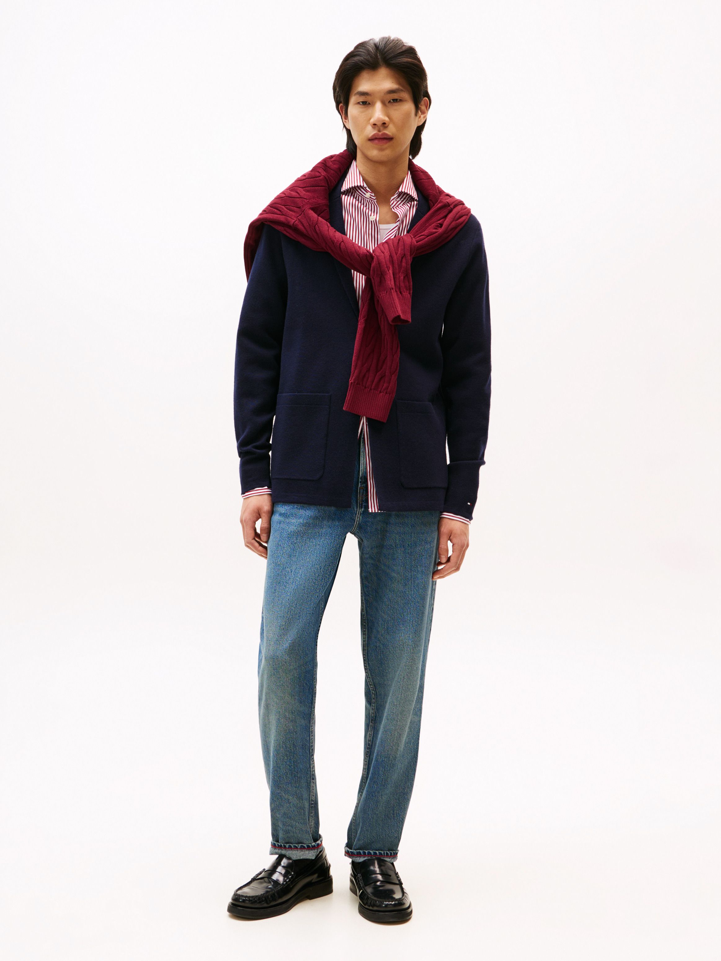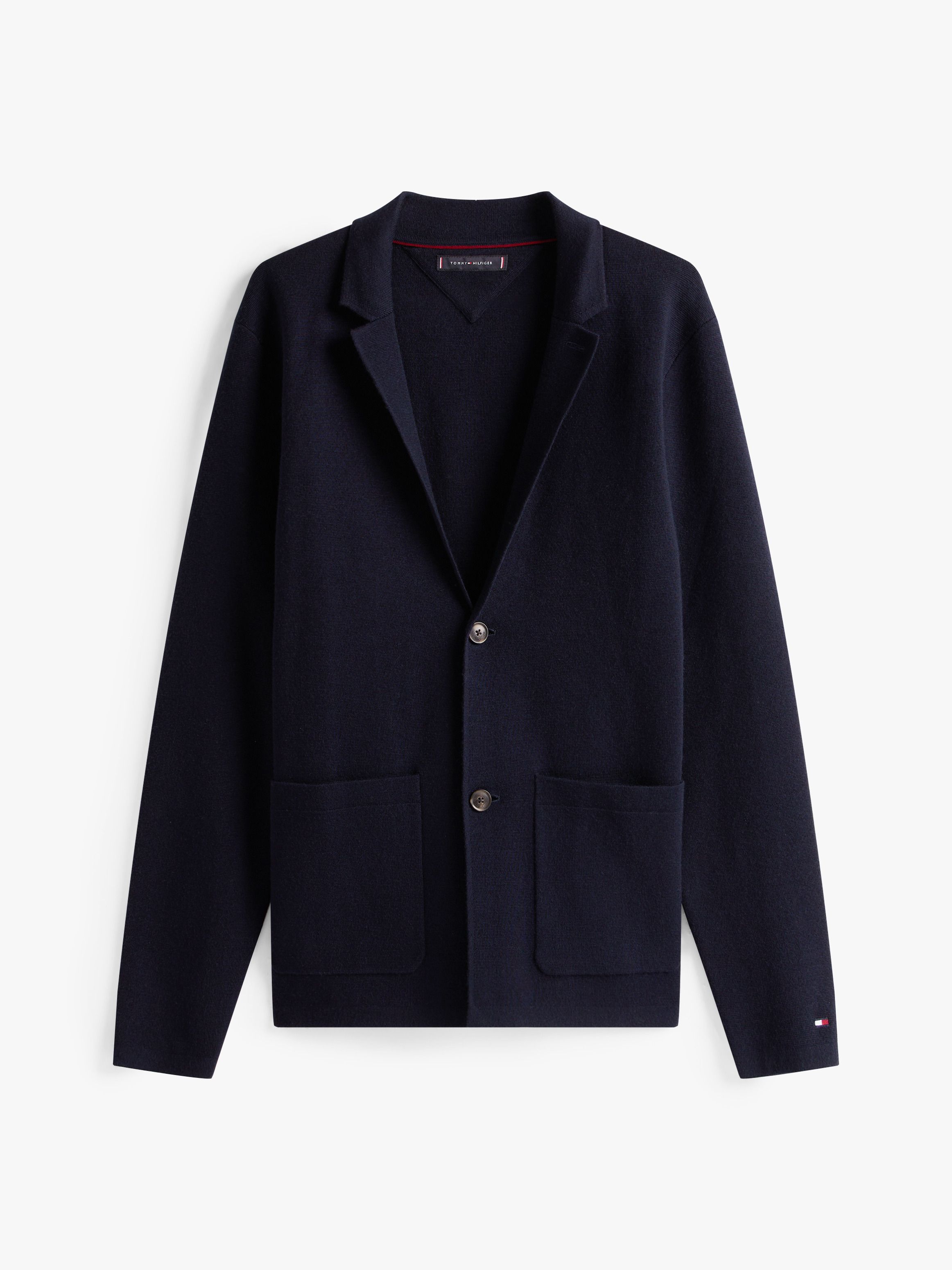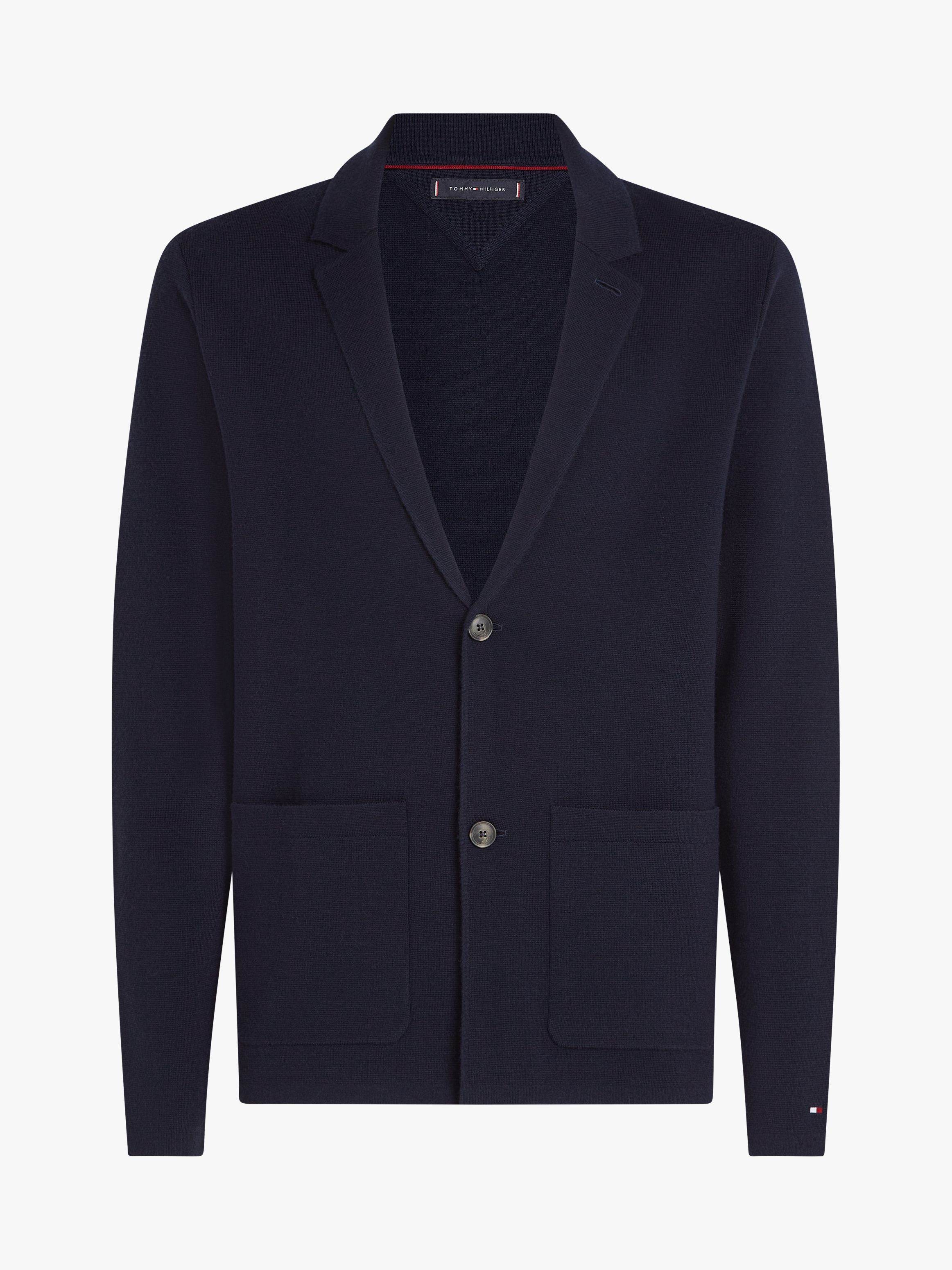 • Wool blend • Notched lapels • Shawl collar • Two-button closure • Two front patch pockets • Tommy Hilfiger branding • Tommy Hilfiger flag embroidery on sleeve