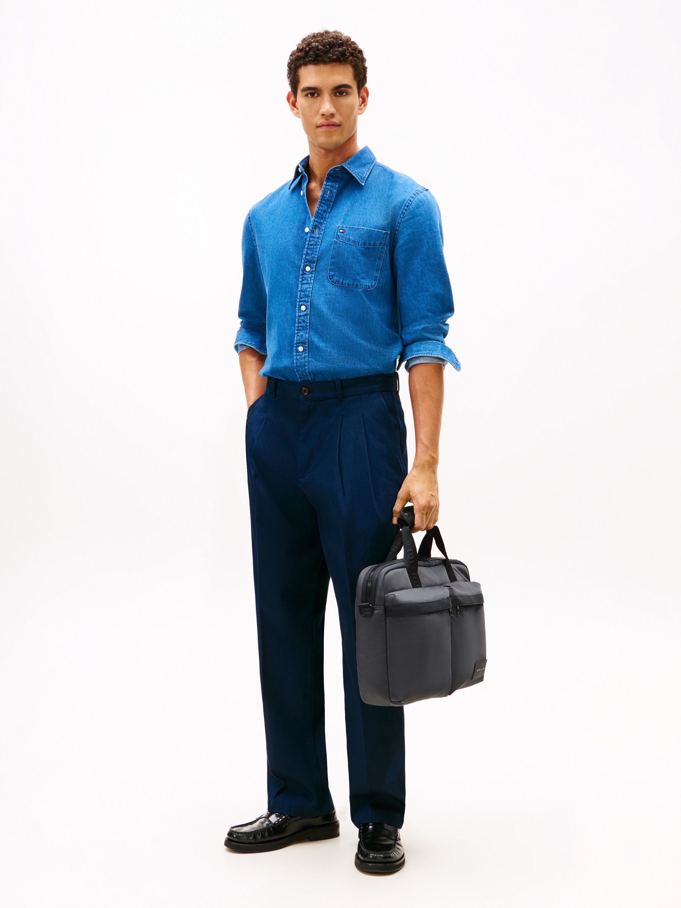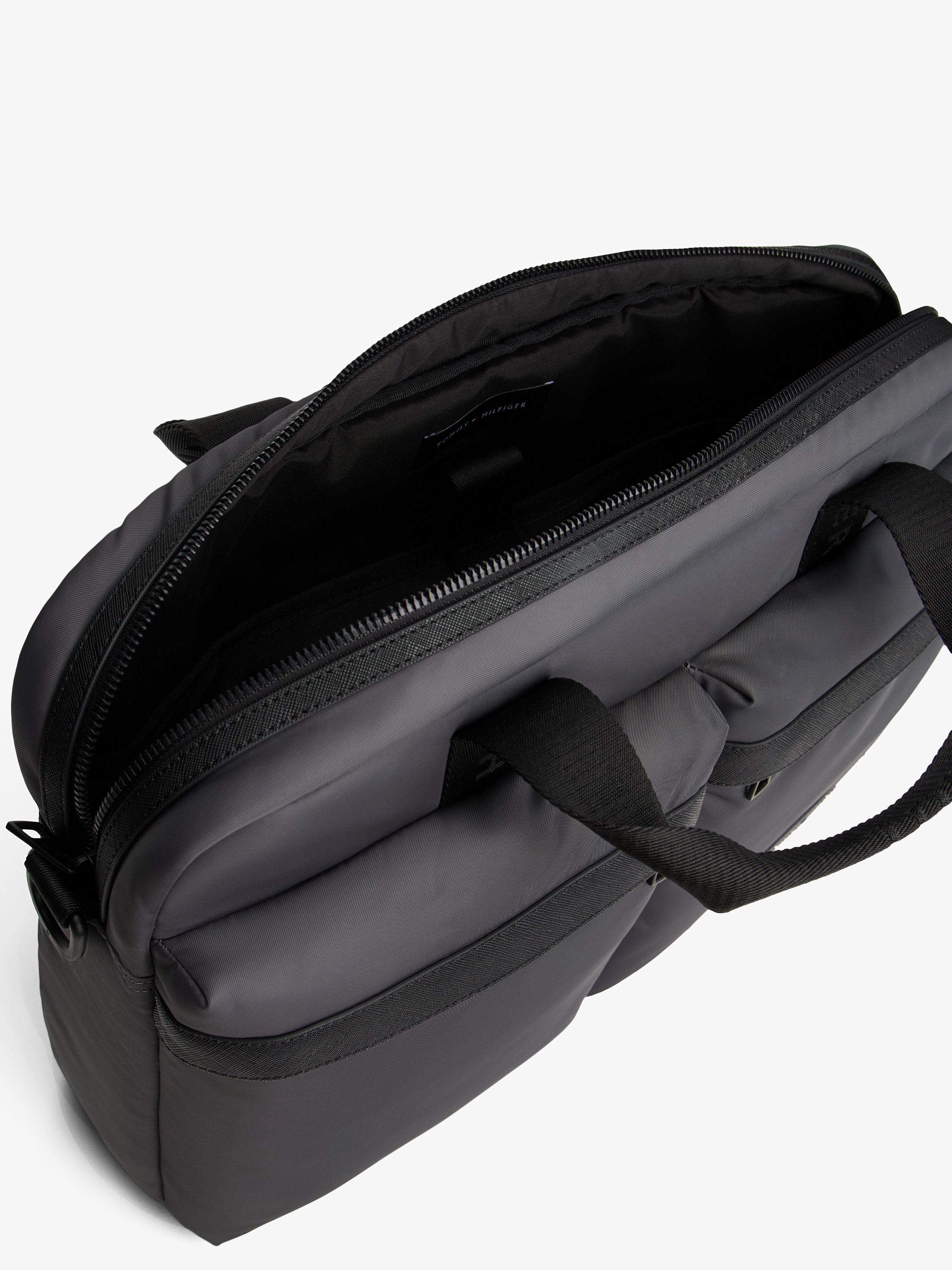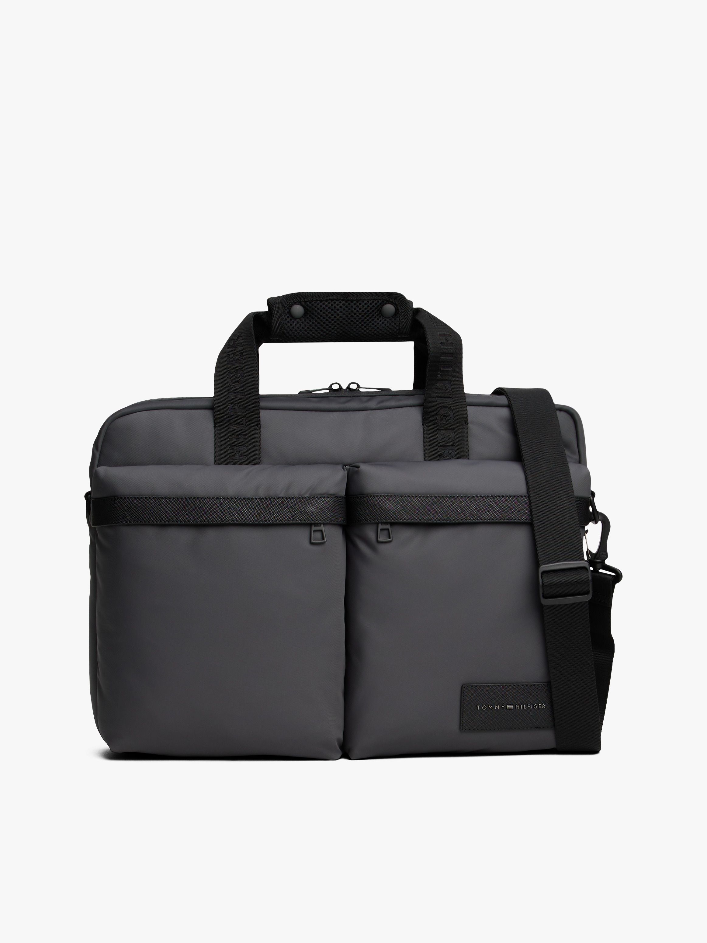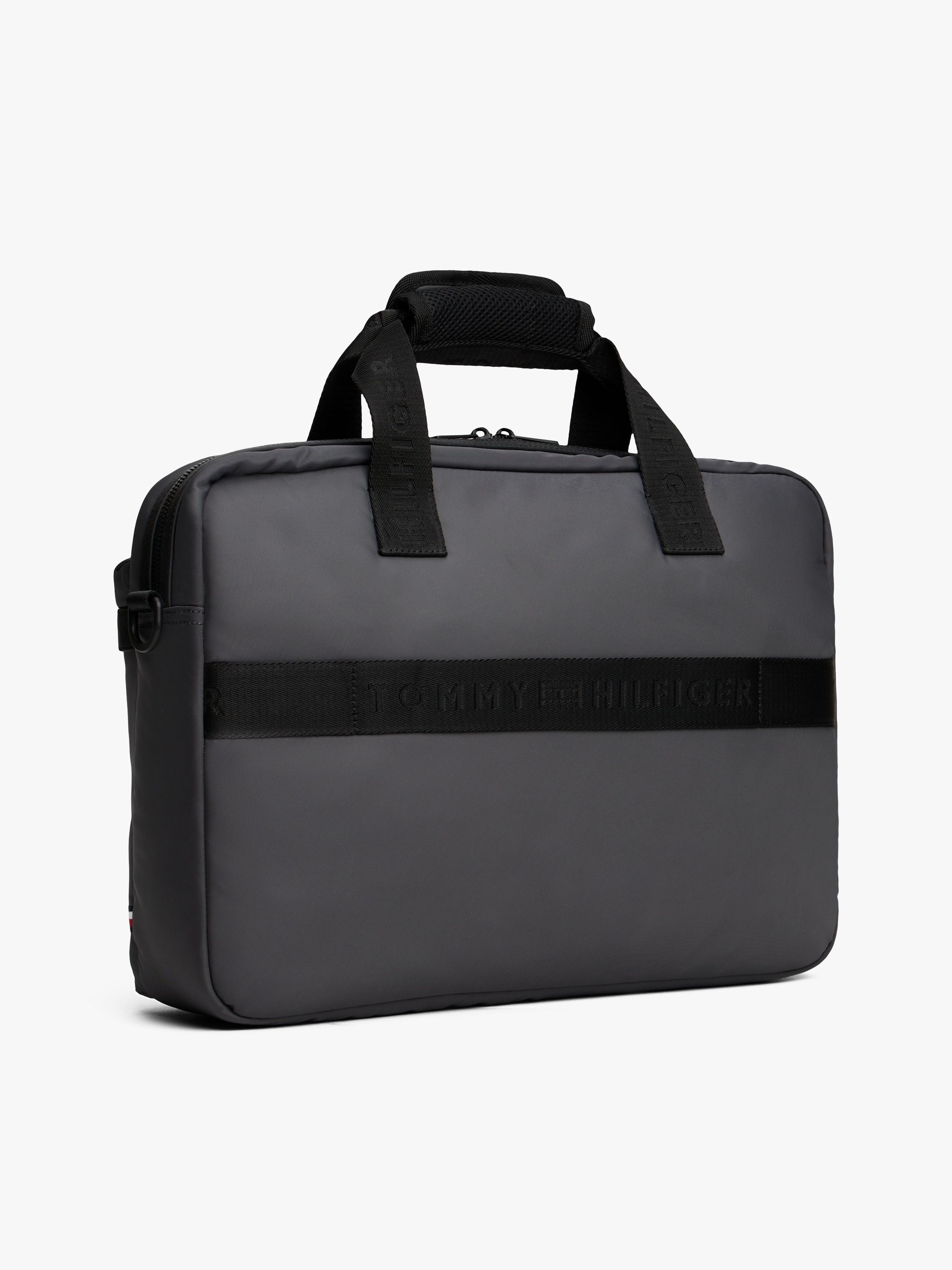 • Textile • Built-in laptop sleeve • Double zip closure • Two top handles with handle tie • Adjustable removable shoulder strap • Trolley strap on back • One main compartment • Two exterior zipped pockets • Tommy Hilfiger logo on handles and trolley strap • Tommy Hilfiger logo patch on pocket • Tommy Hilfiger branding