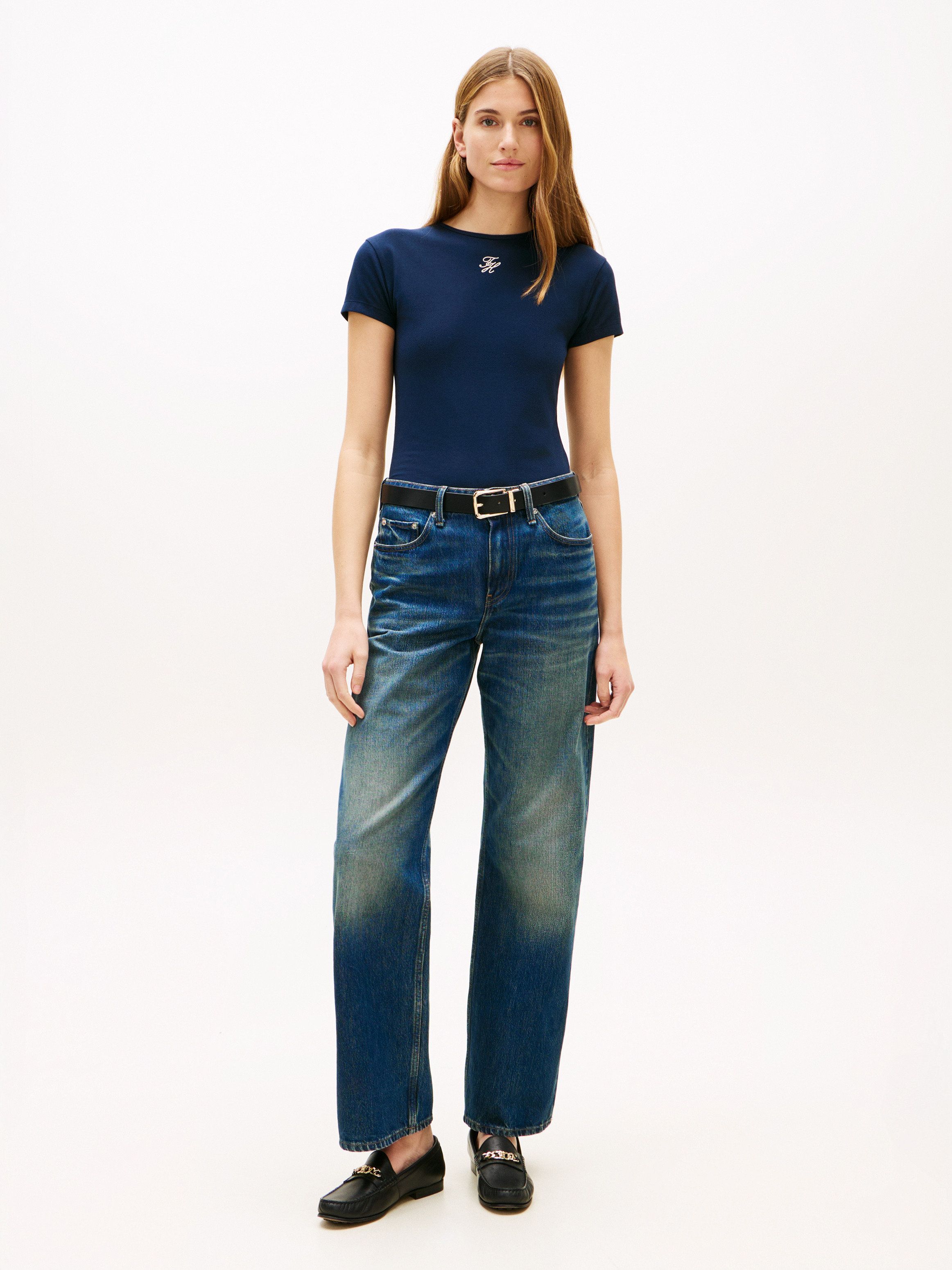 • Stretch cotton jersey • Crew neck • Signature tape inside neckline • Tommy Hilfiger textured script logo on front • Tommy Hilfiger branding • Tommy Hilfiger flag embroidery on sleeve