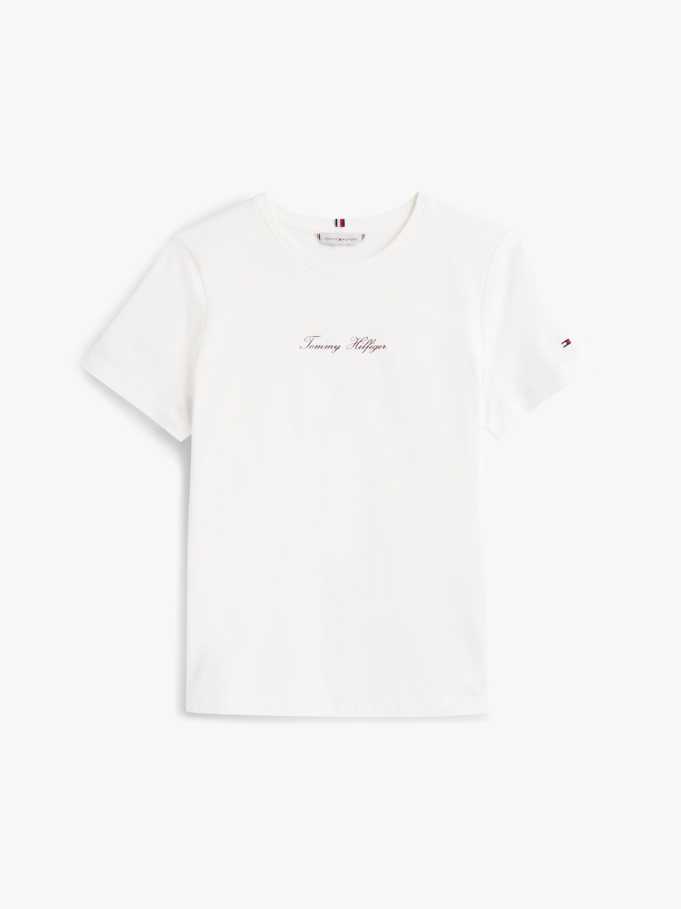 • Pure cotton jersey • Crew neck • Signature tape inside neckline • Tommy Hilfiger textured script logo on chest • Tommy Hilfiger branding • Tommy Hilfiger flag embroidery on sleeve