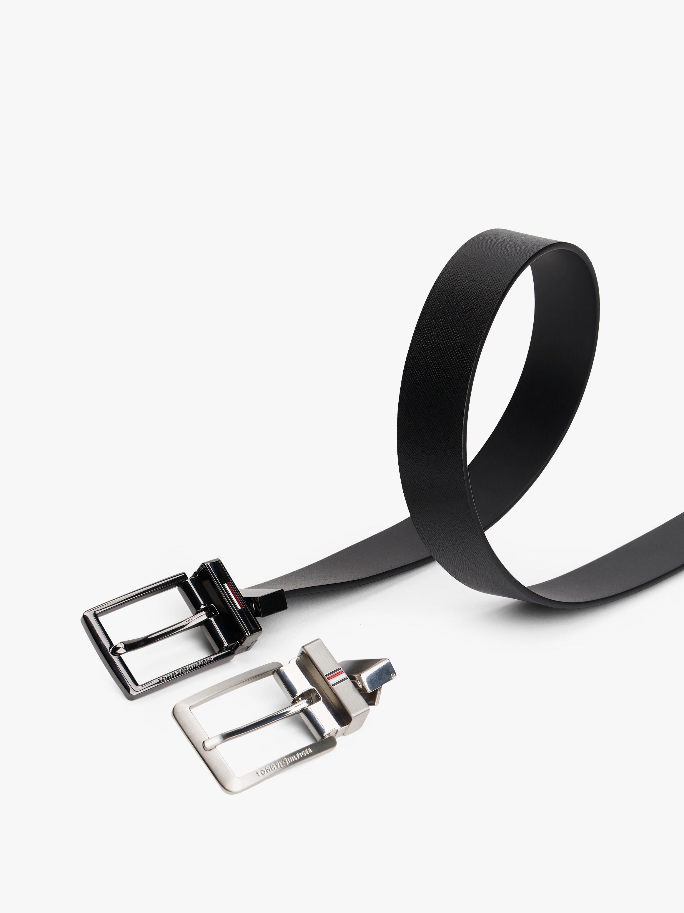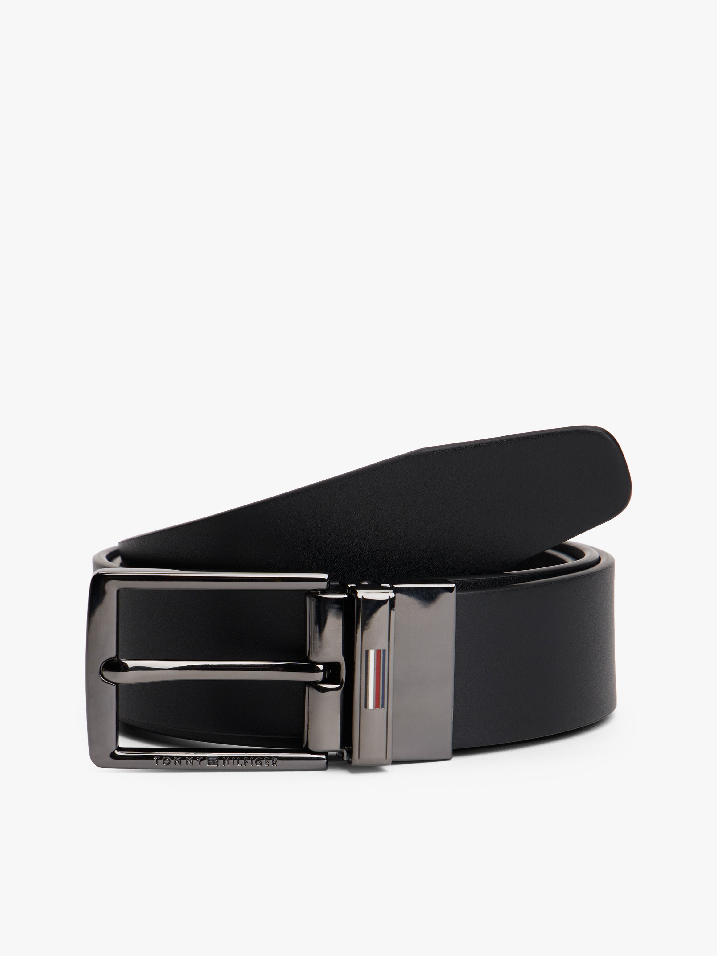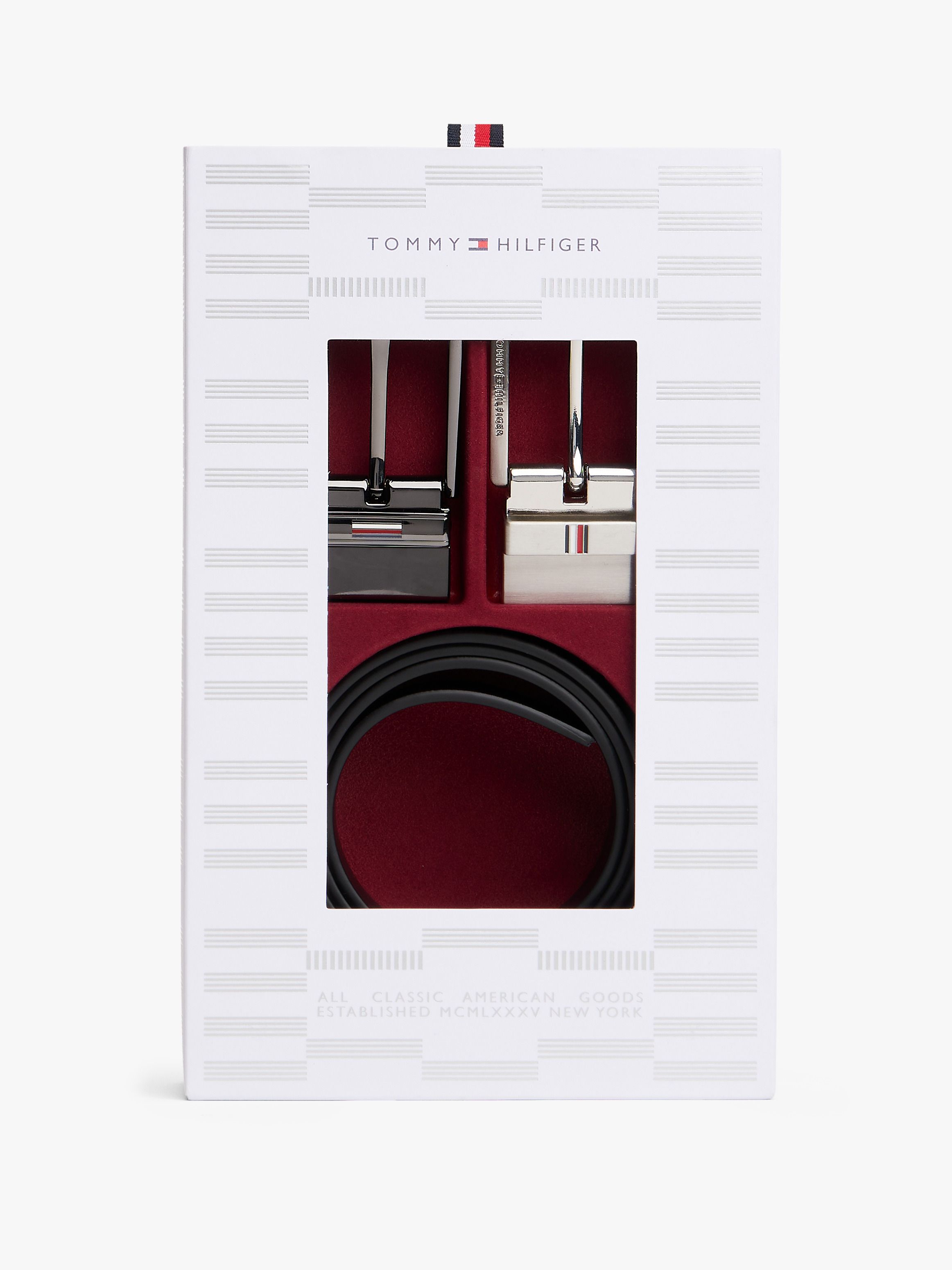 • Leather • Smooth finish • Presented in gift box • Reversible • Two square metal buckles • Tommy Hilfiger logo debossed on buckles • Enamel signature detailing on buckles • Tommy Hilfiger branding