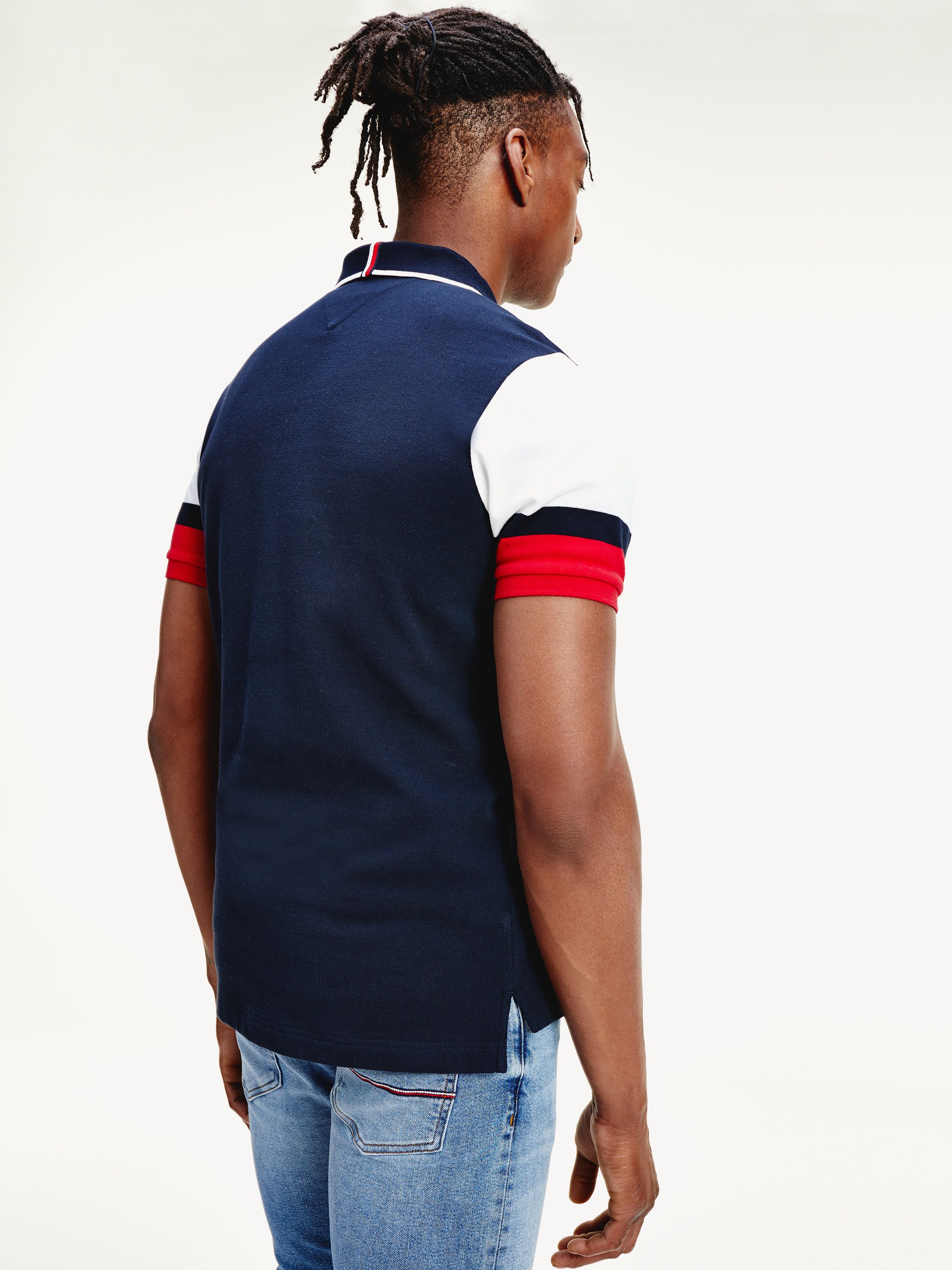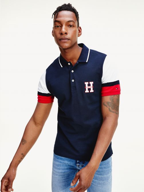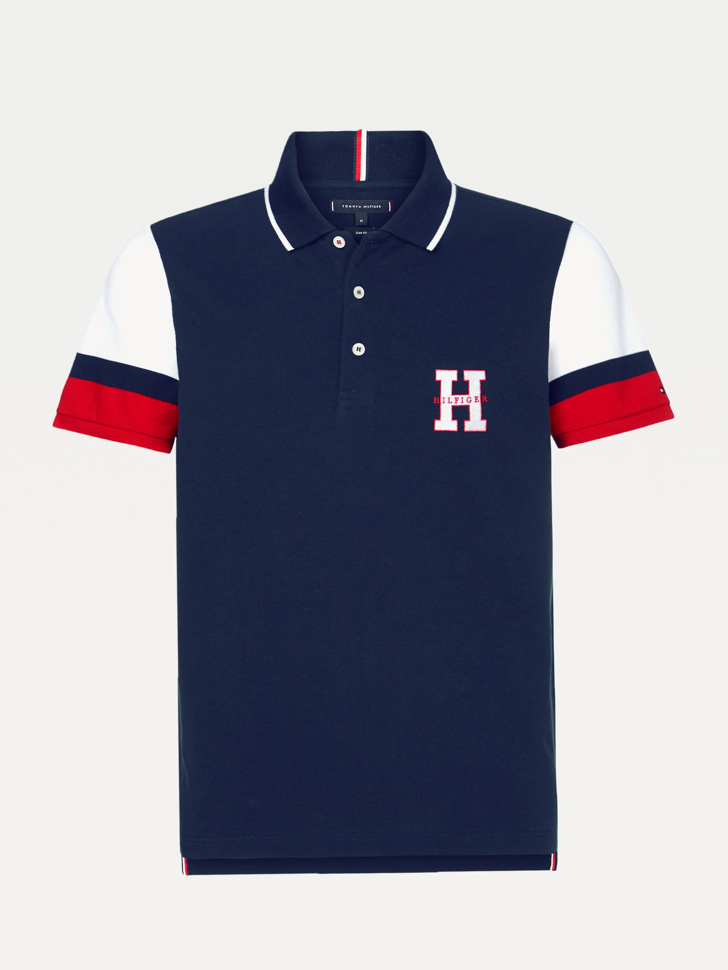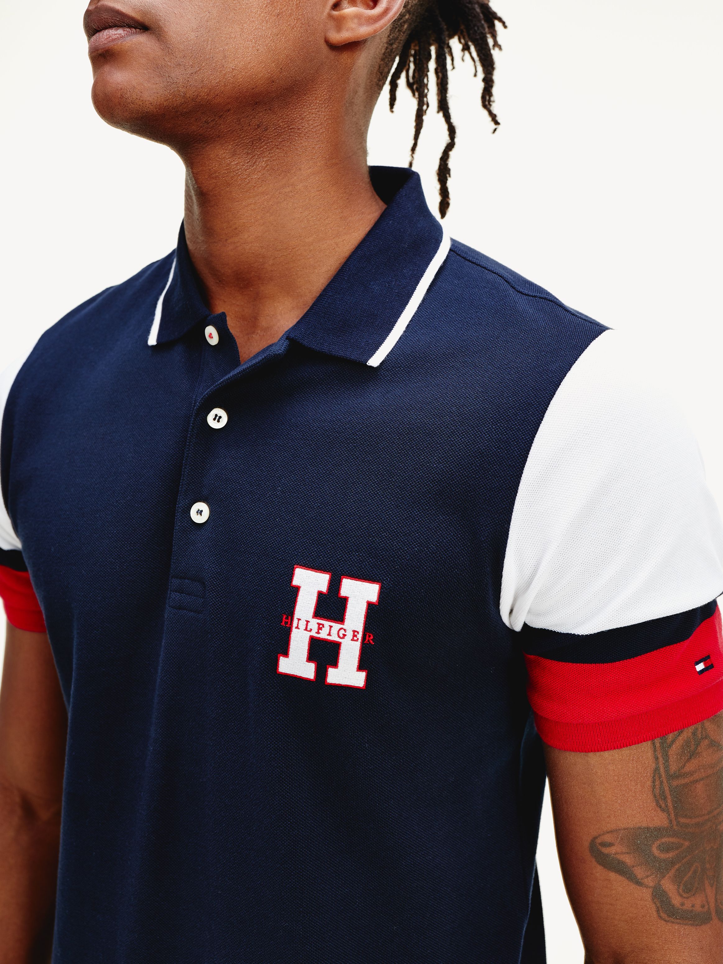 • Pure cotton pique • Cooling technology • Polo collar • All-over signature colour-blocked design • Three-button placket • Tommy Hilfiger logo embroidery on chest • Tommy Hilfiger flag embroidery on sleeve