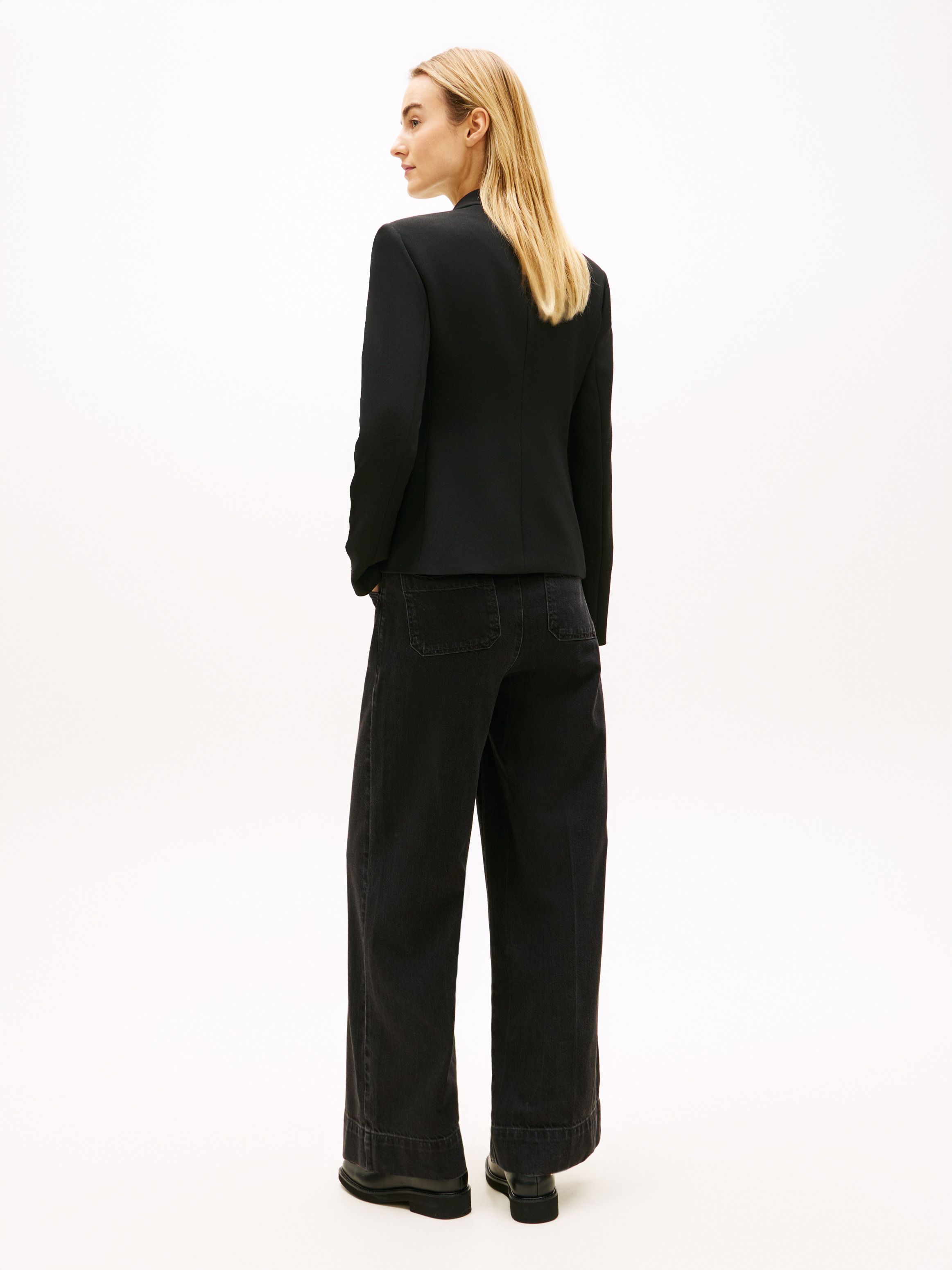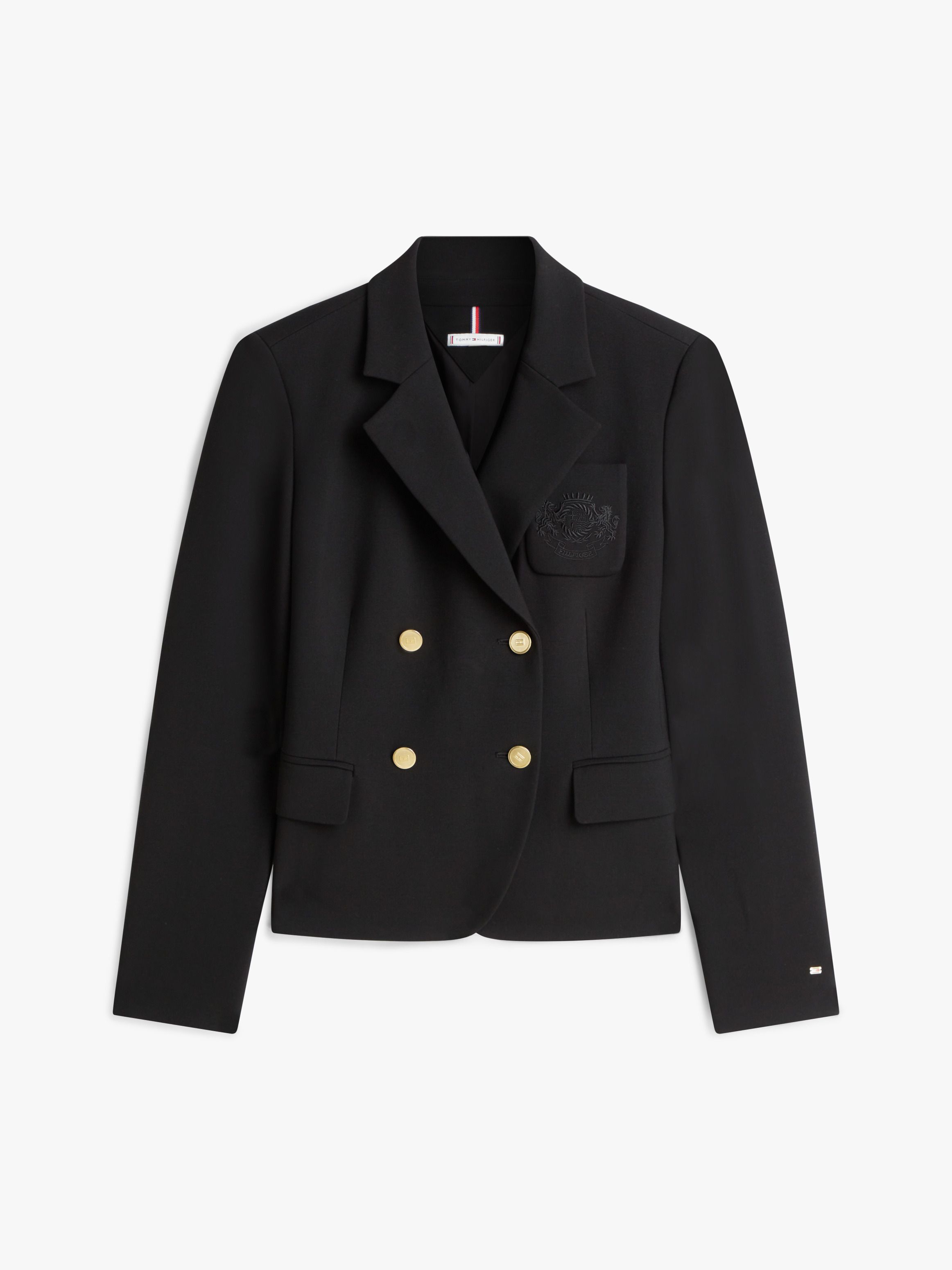 • Stretch viscose blend • Gold-tone buttons • Notched lapels • Double breasted • Two-button closure • One chest patch pocket • Two front flap pockets • Tommy Hilfiger branding • Tommy Hilfiger flag embossed on buttons • Tommy Hilfiger metal flag on cuff