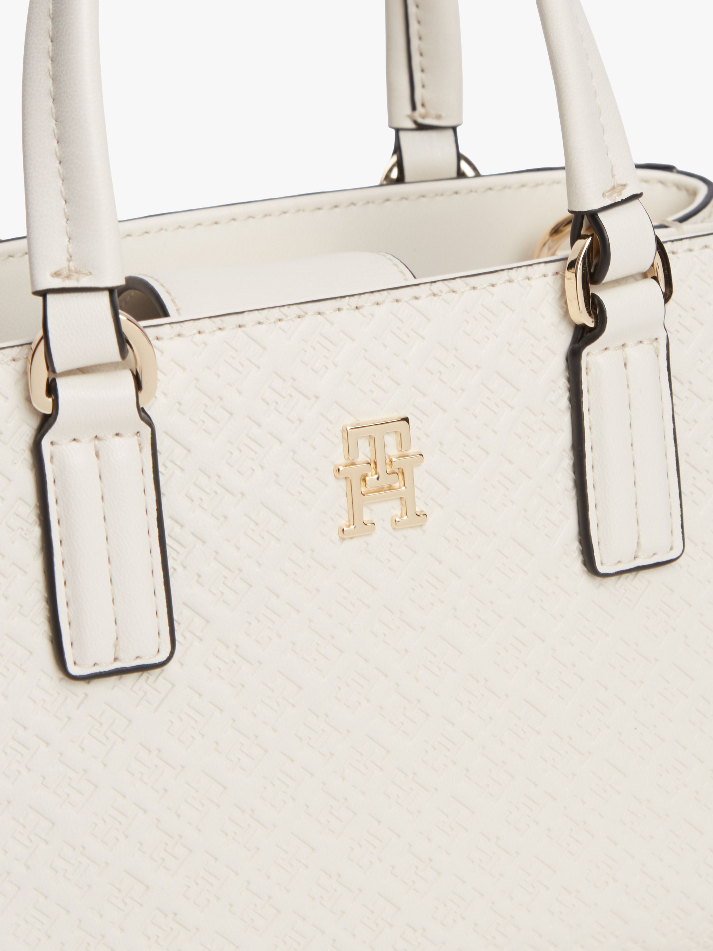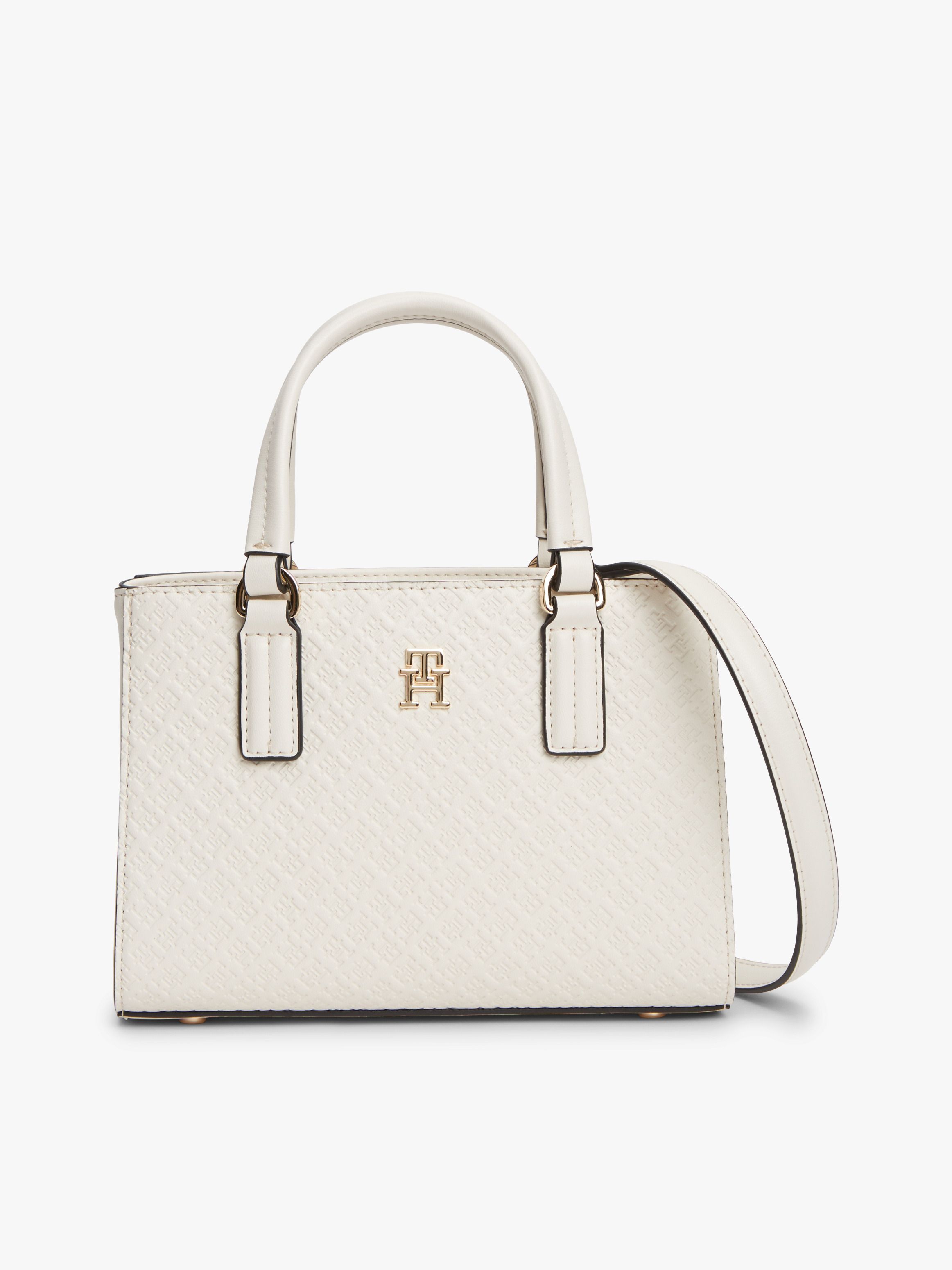 • Textured finish • Magnetic flap closure • Two top handles • Removable crossbody strap • Two main compartments • One interior zipped pocket • All-over debossed TH monogram pattern • TH monogram plaque on front • Tommy Hilfiger branding