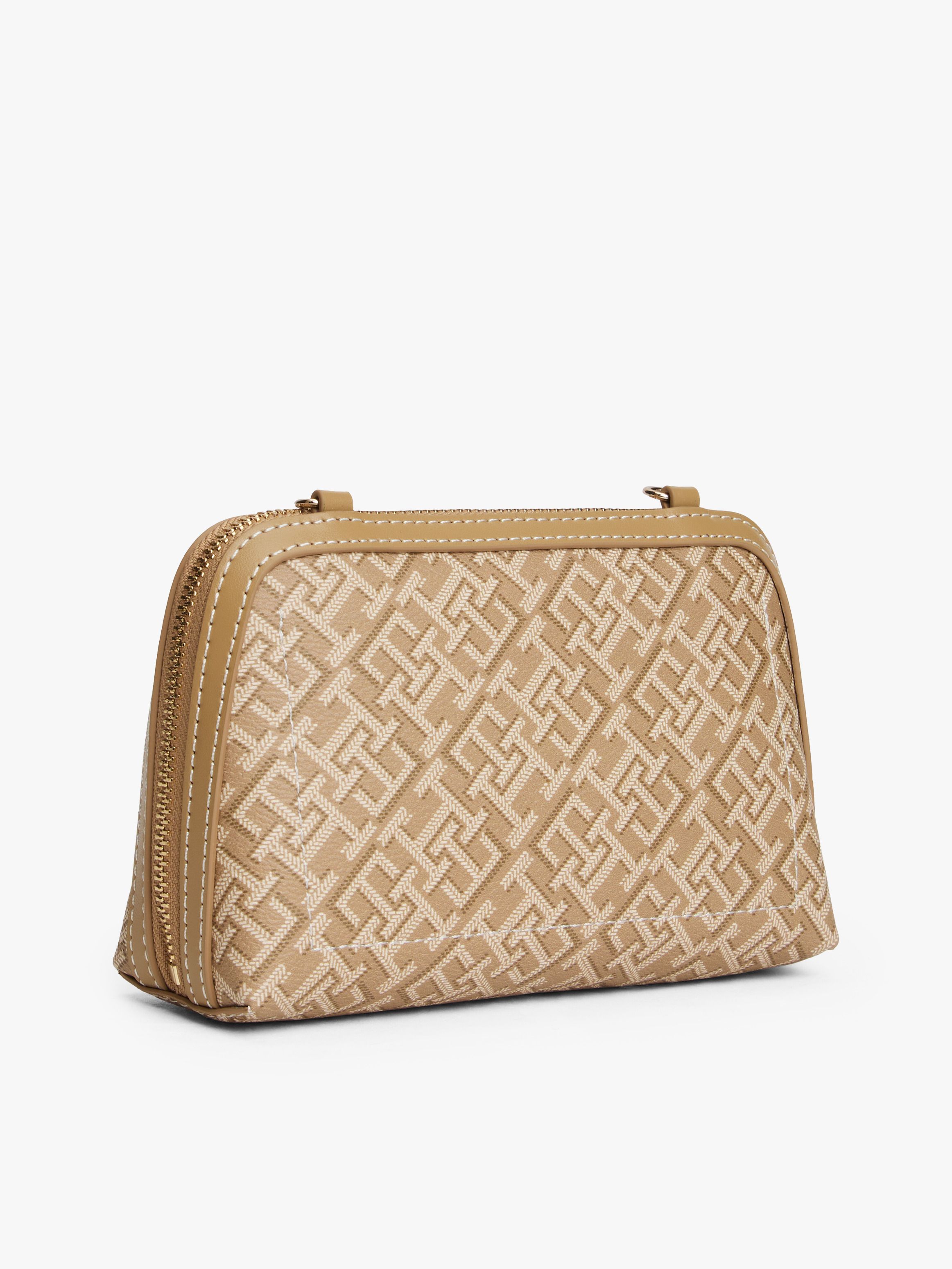 This compact crossbody bag showcases a TH monogram print with a textured finish, creating a sophisticated, heritage-inspired aesthetic.