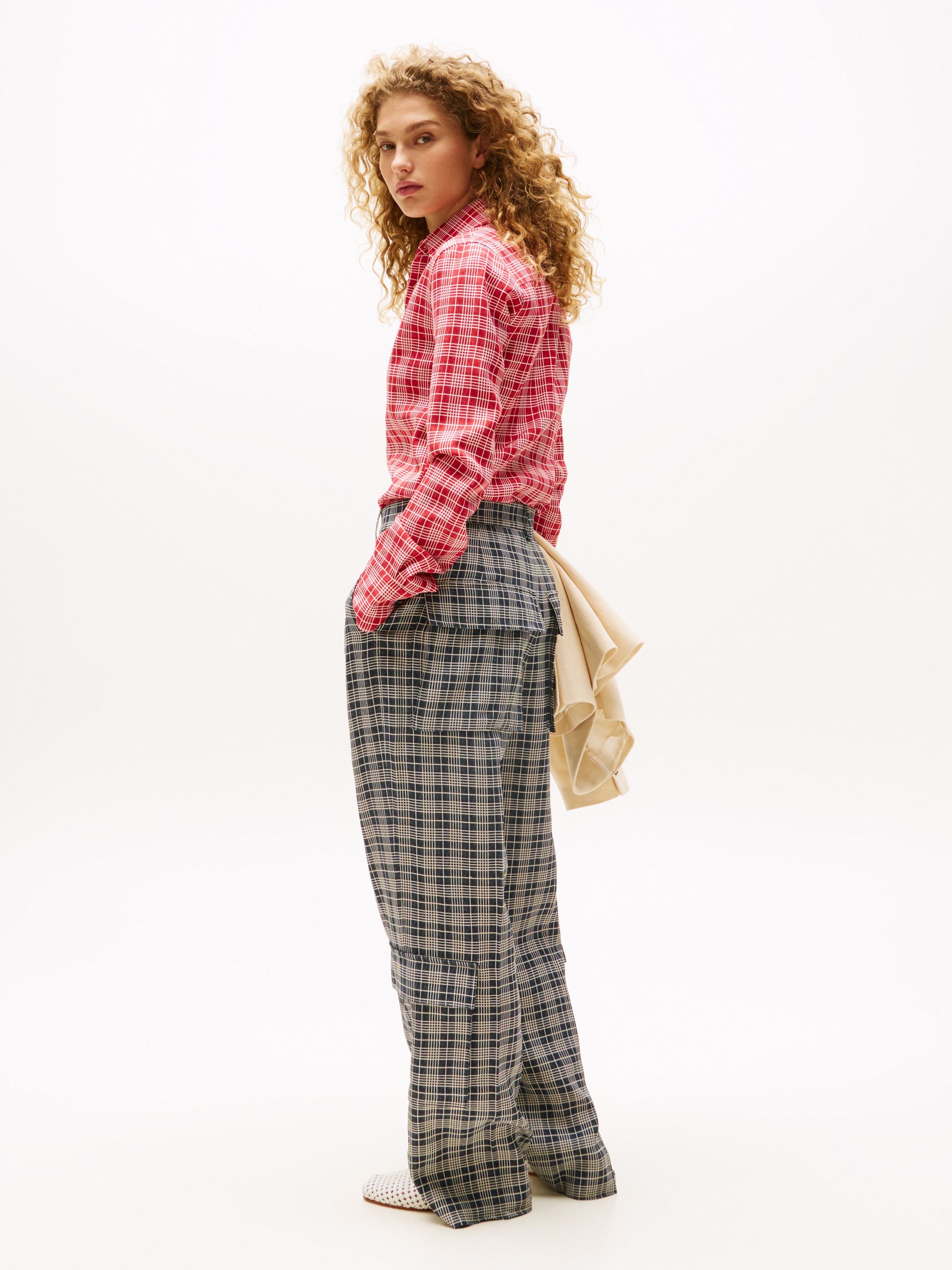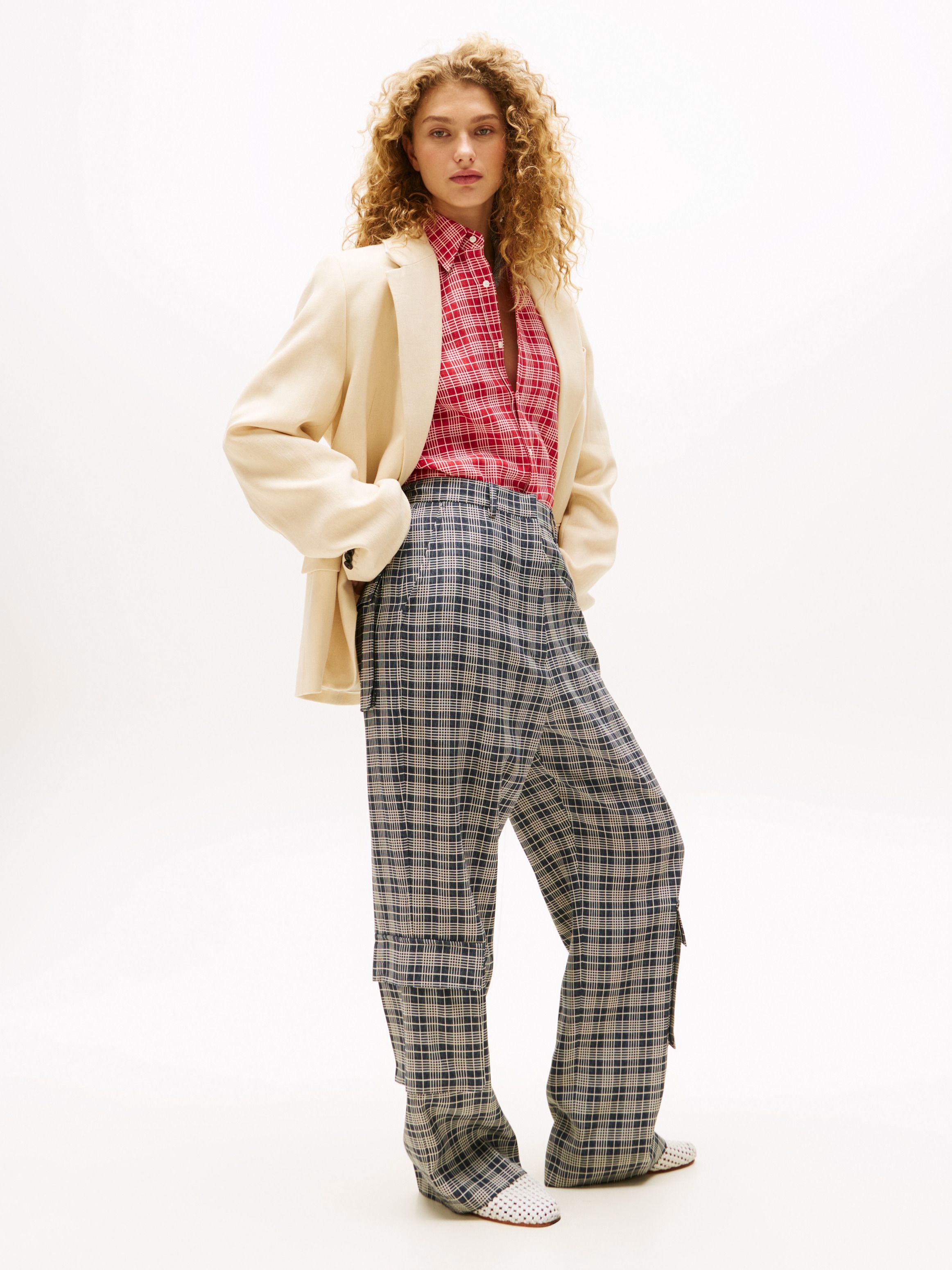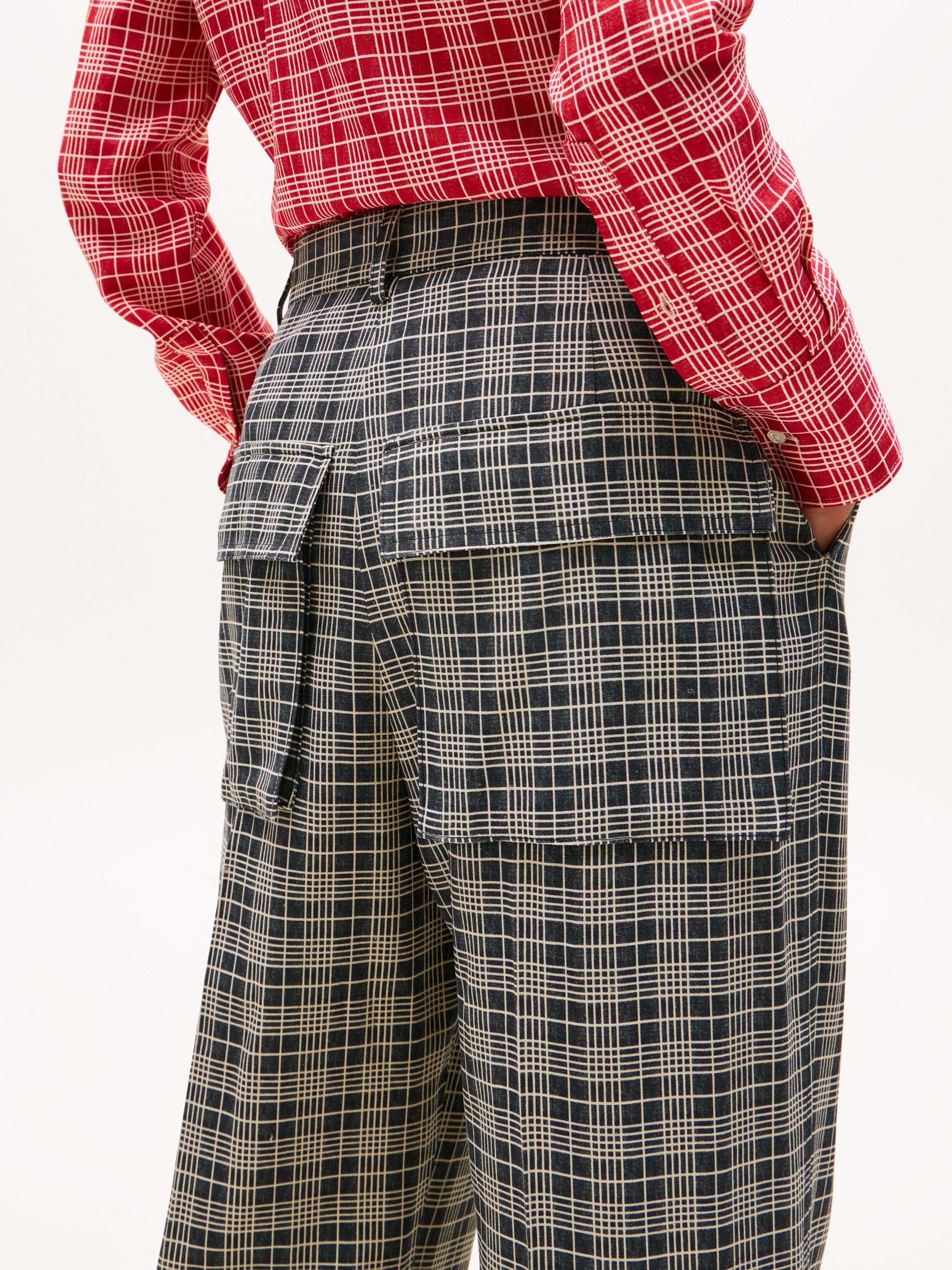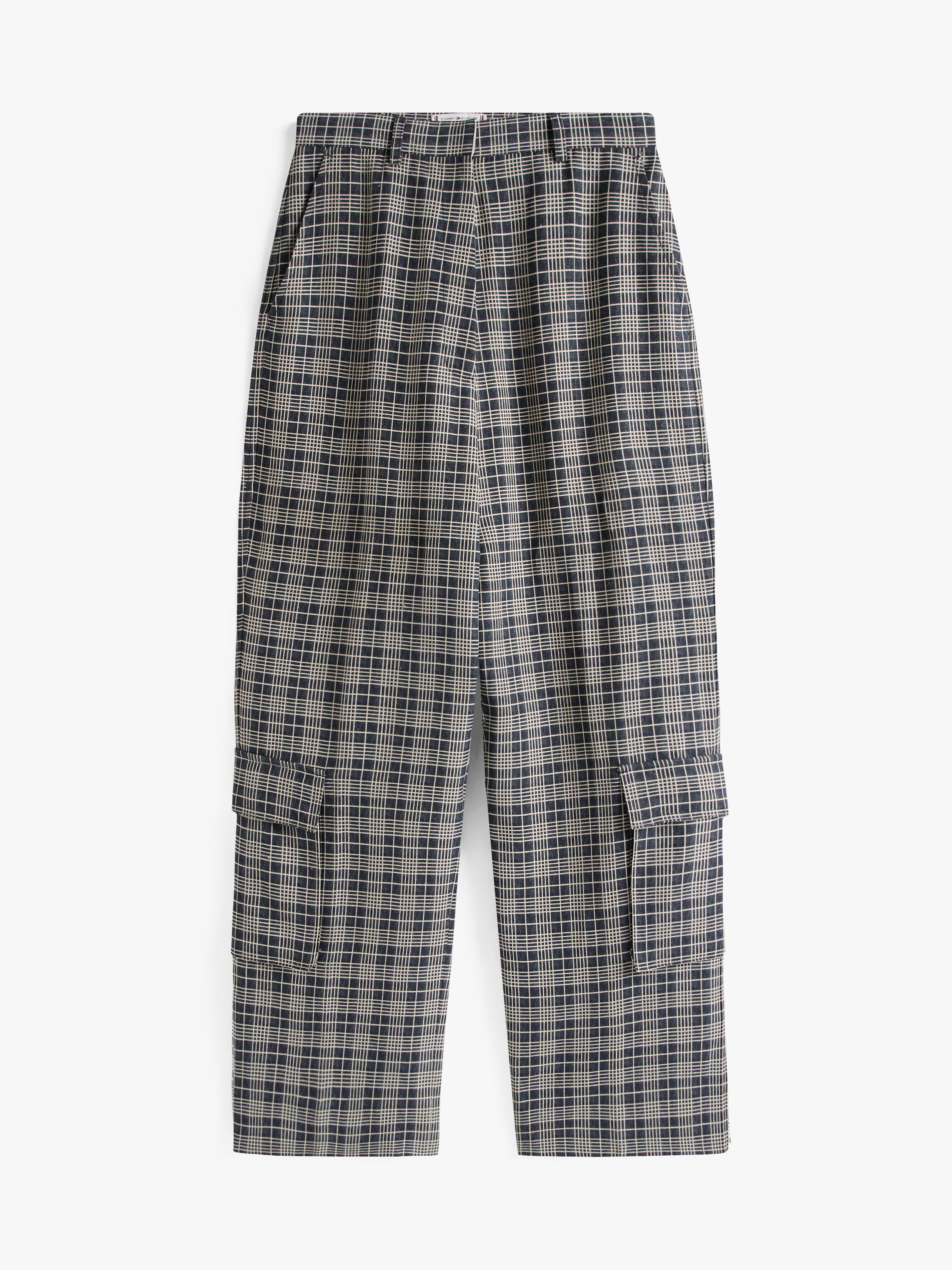 • Silk blend • All-over check • Pressed front and back creases • Zip with concealed hook fastening • Two side angled slip pockets • Two back cargo pockets • Two side cargo pockets • The Runway Collection branding