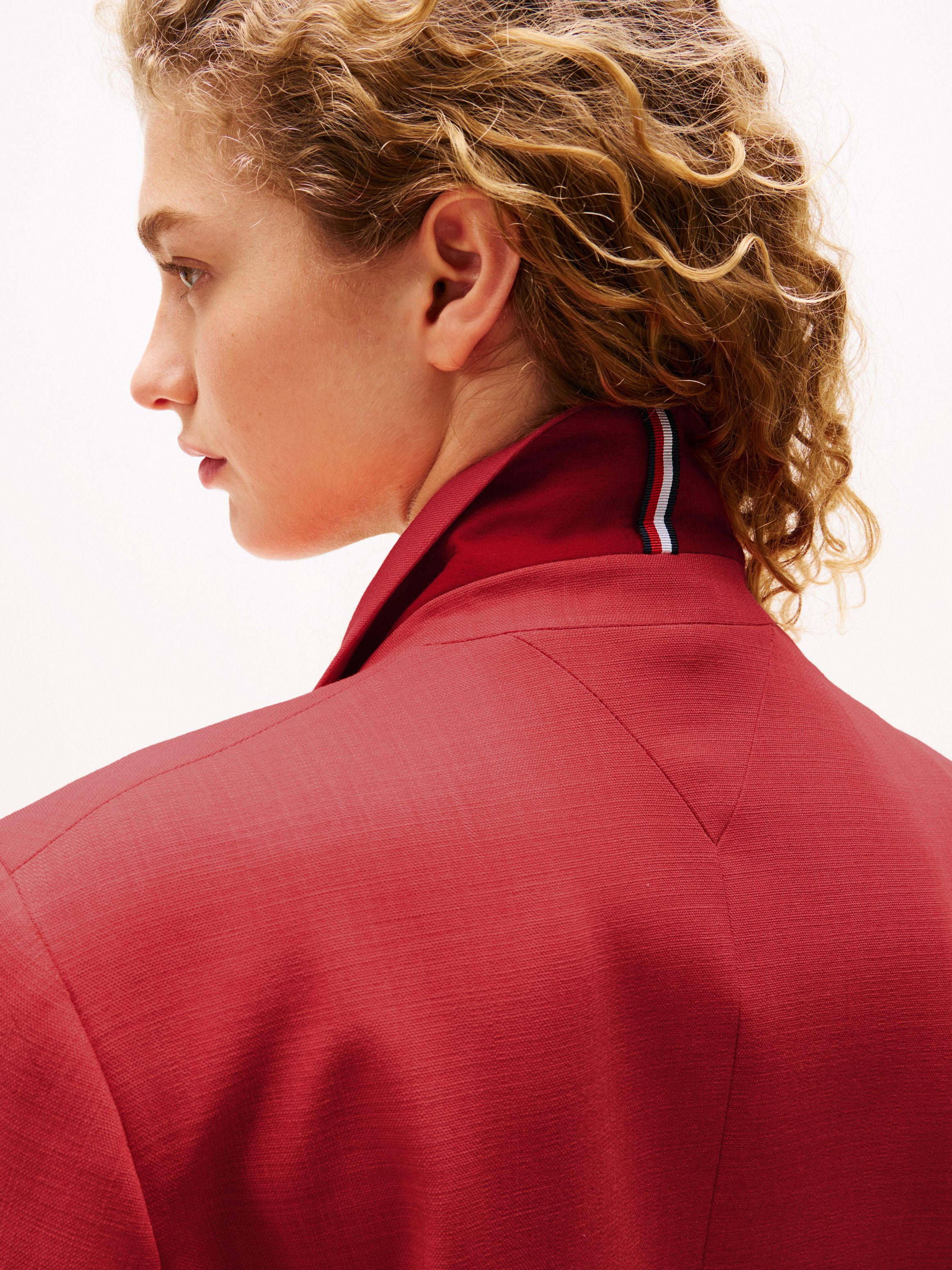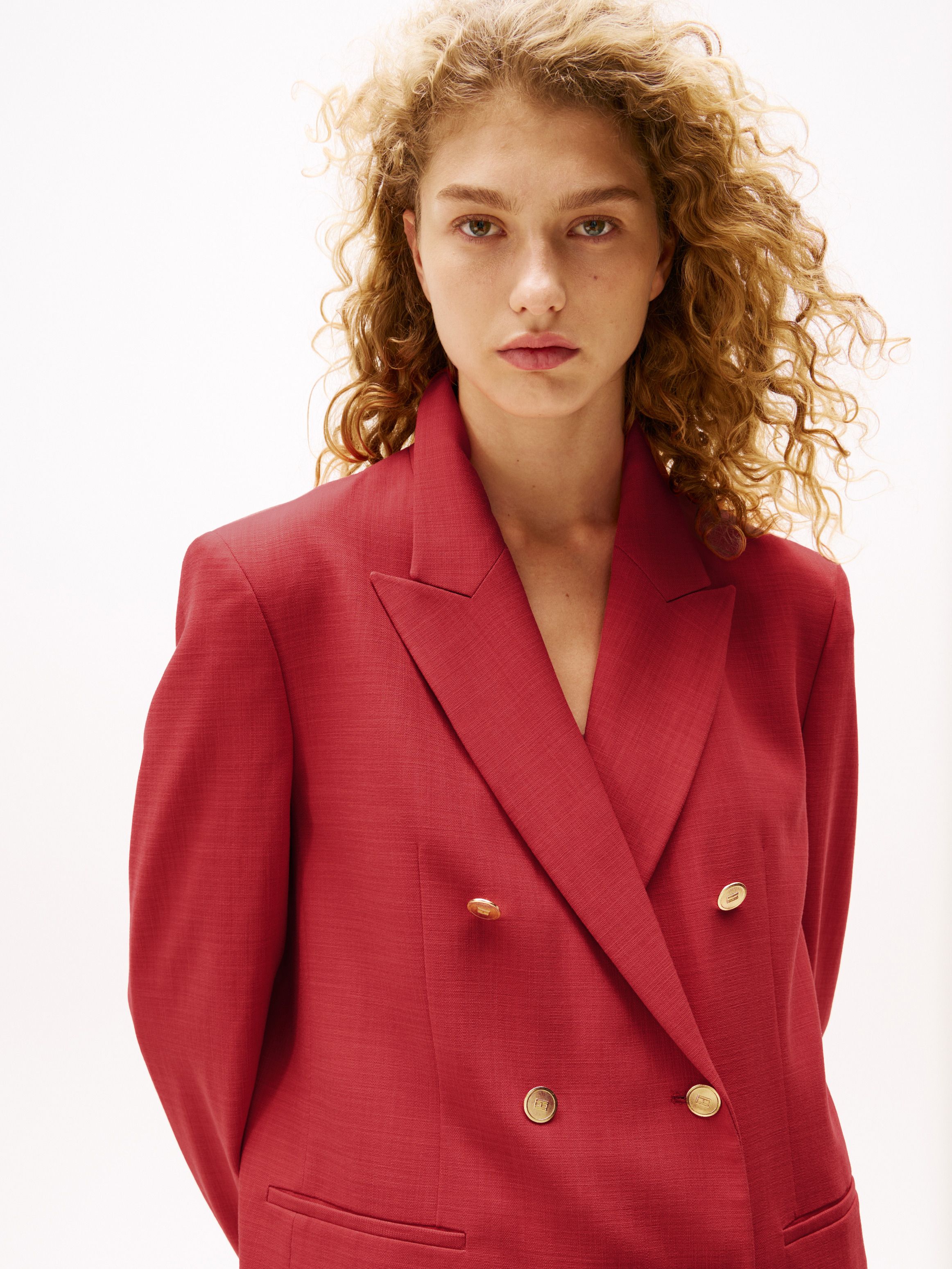 • Stretch viscose blend • Peak lapels • Double breasted • Two-button closure • Four-button cuffs • Darts on waist • Two front welt pockets • Back vent • Tommy Hilfiger flag embossed on buttons • The Sofia Capsule branding • Tommy Hilfiger metal flag on cuff