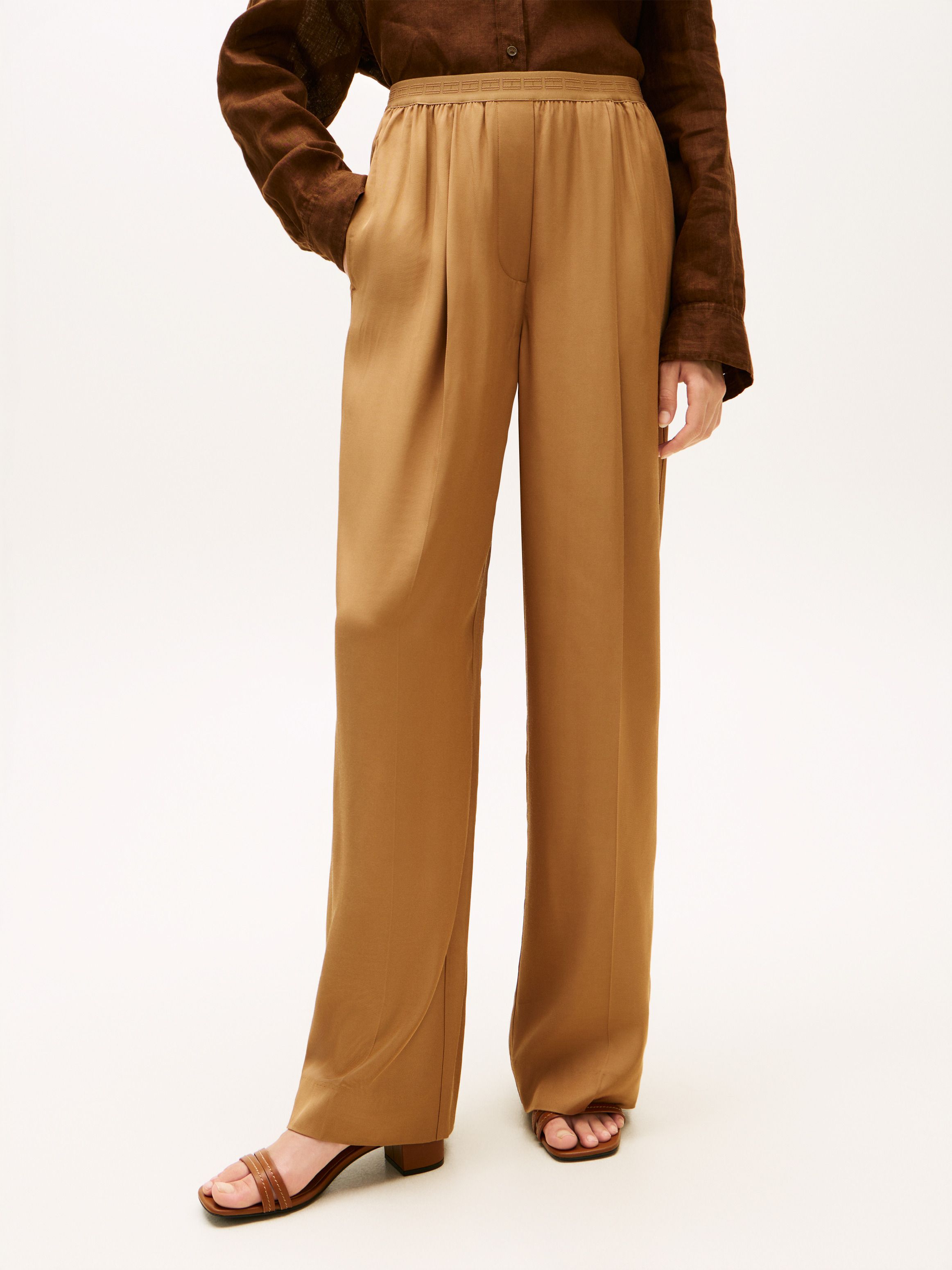 • Viscose twill • Elasticated waistband • Pull-on design • Two side slip pockets • Pressed front creases • Tommy Hilfiger repeat flag logo on waistband • Tommy Hilfiger branding