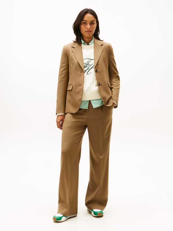 • Stretch wool blend • Semi-elasticated waistband • Pressed front and back creases • Two side angled slip pockets • Two back welt pockets • Tommy Hilfiger branding • Tommy Hilfiger metal flag on back