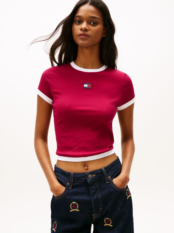 This ribbed, slim-fit T-shirt with contrast trims has a '90s vibe that's underscored by the Tommy badge front and centre.