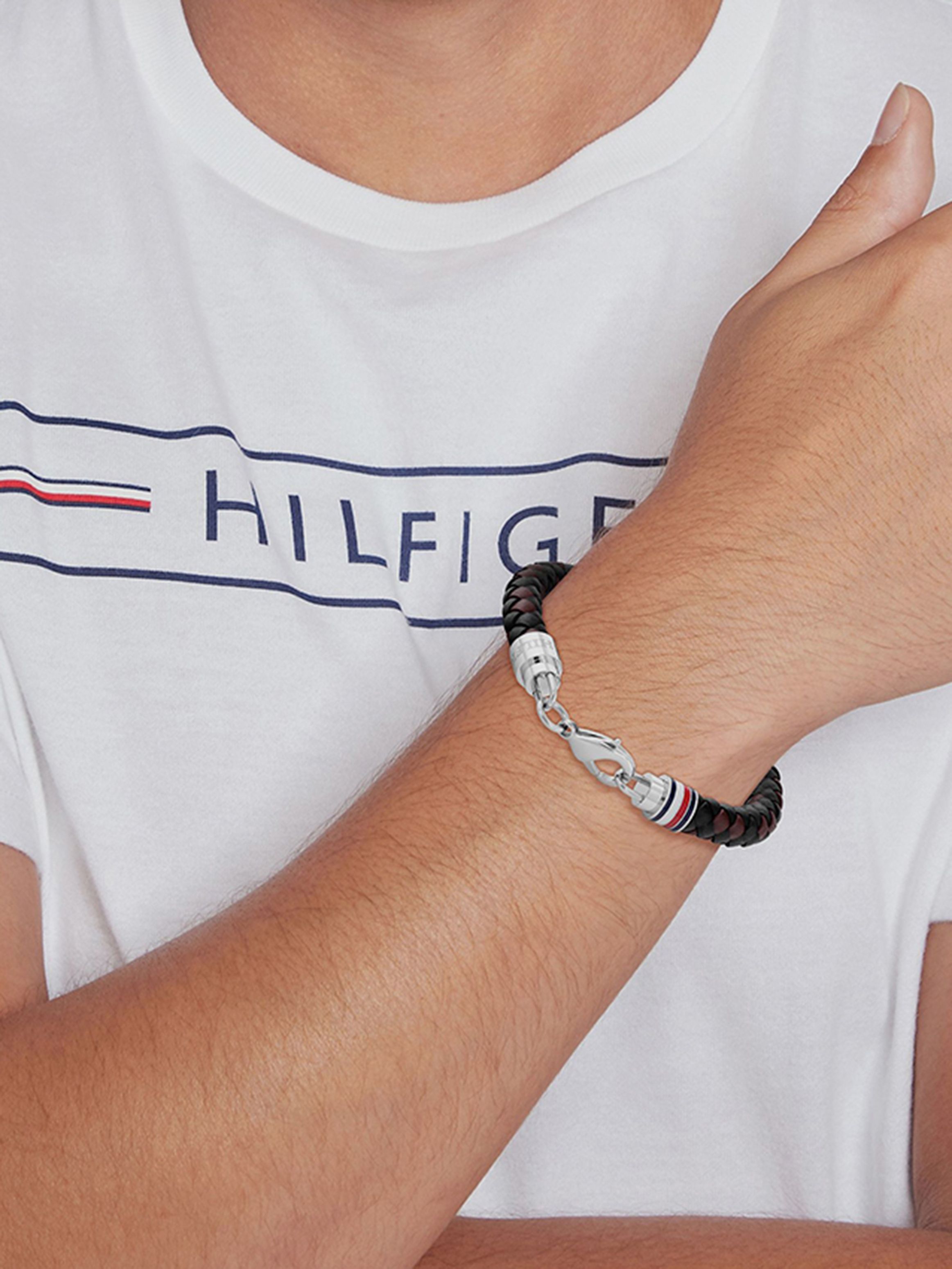 The Tommy Hilfiger men’s bracelet is easy-to-wear and denim-friendly, perfect for casual style. Featuring iconic enamel corporate stripe branding, a lobster closure for a secure fit, and a genuine leather braided strap, it’s the ultimate accessory for effortless, laid-back cool.